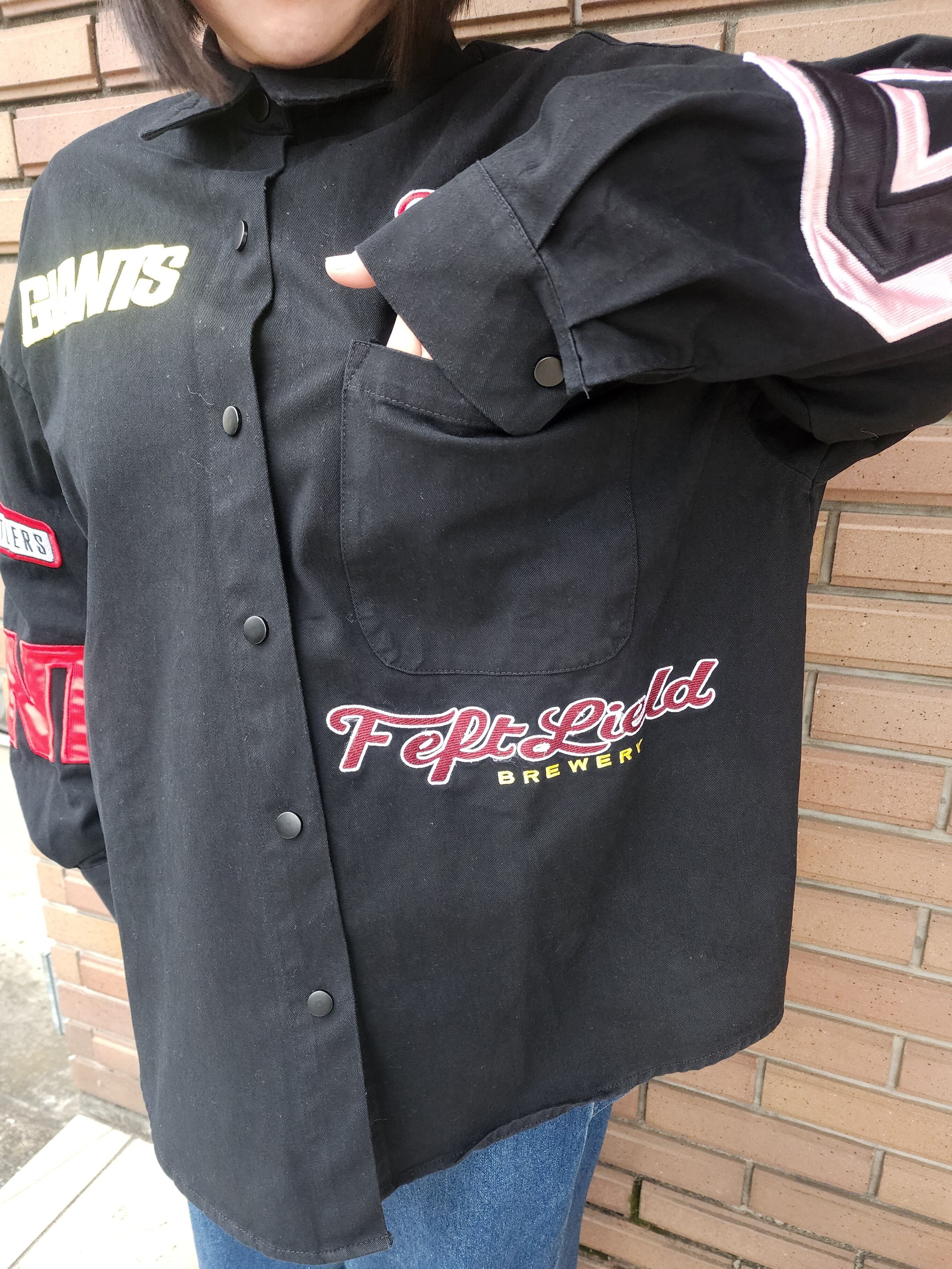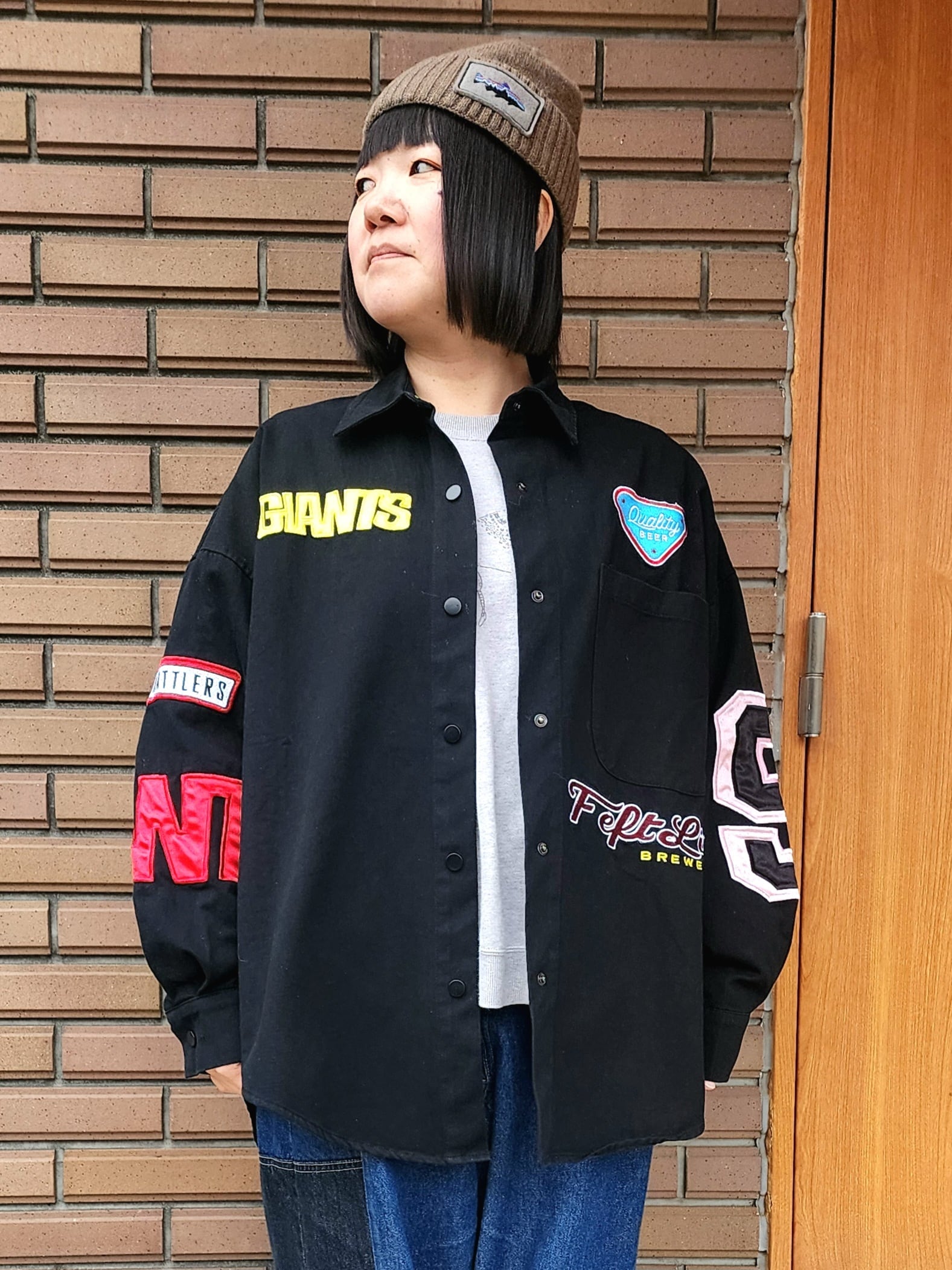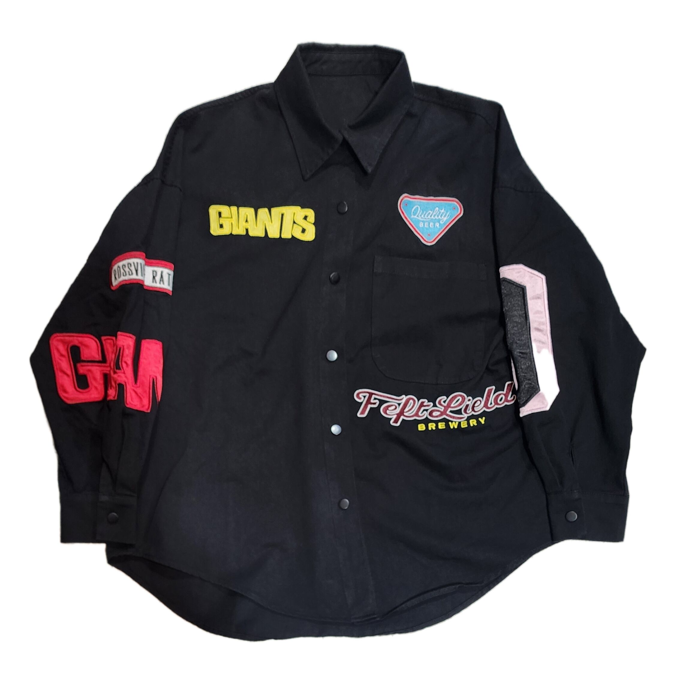 黒地にカラフルに映えたワッペンがかっこいいシャツジャケット。