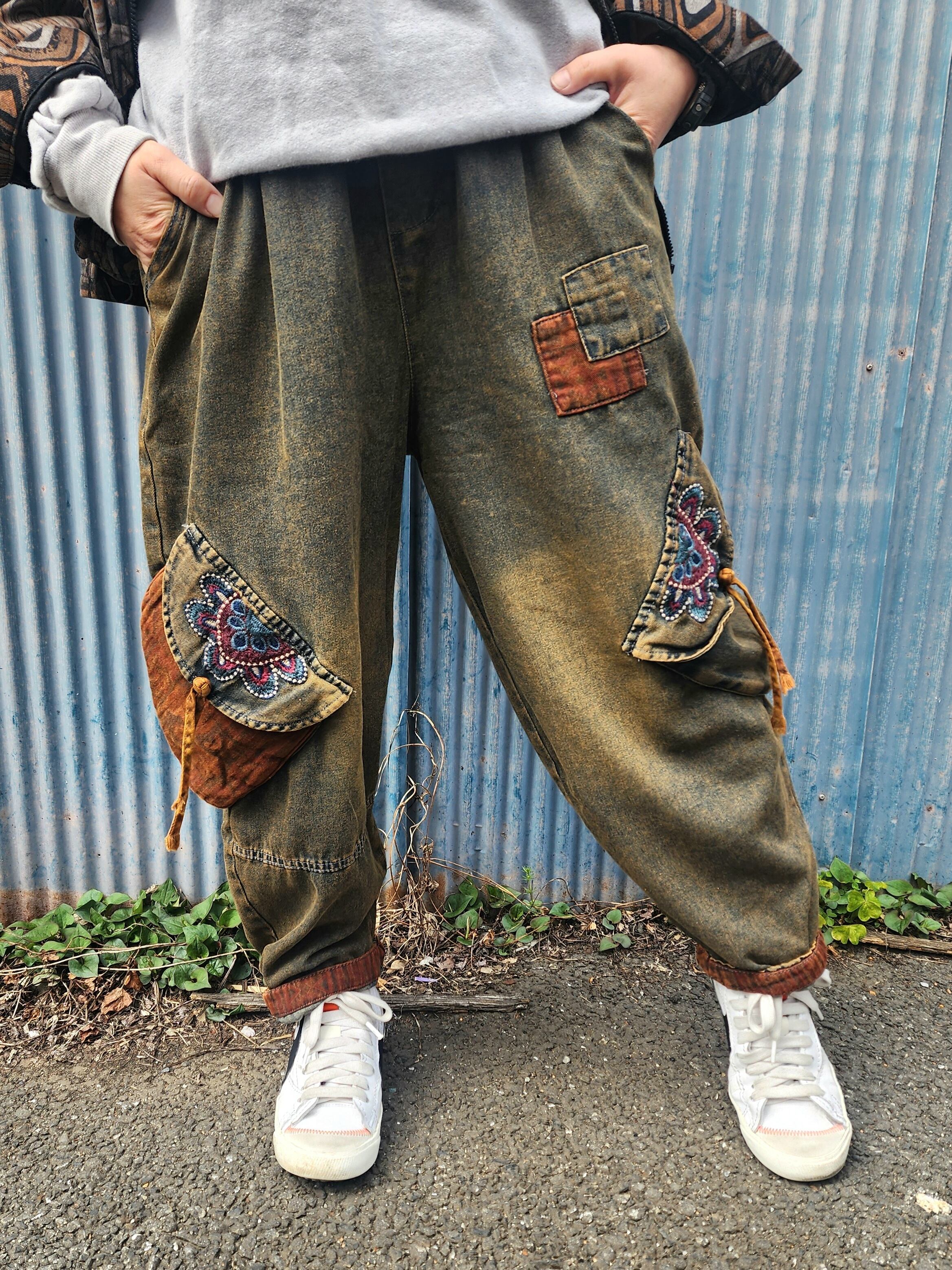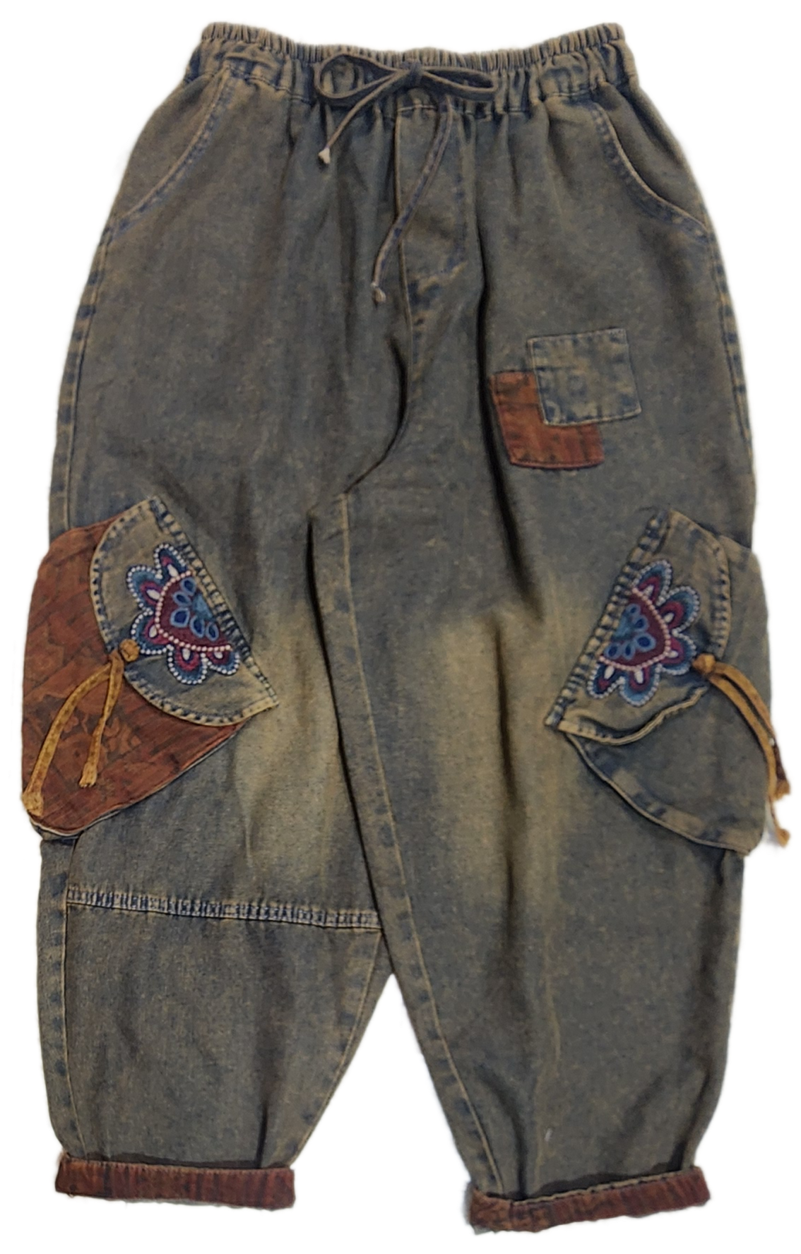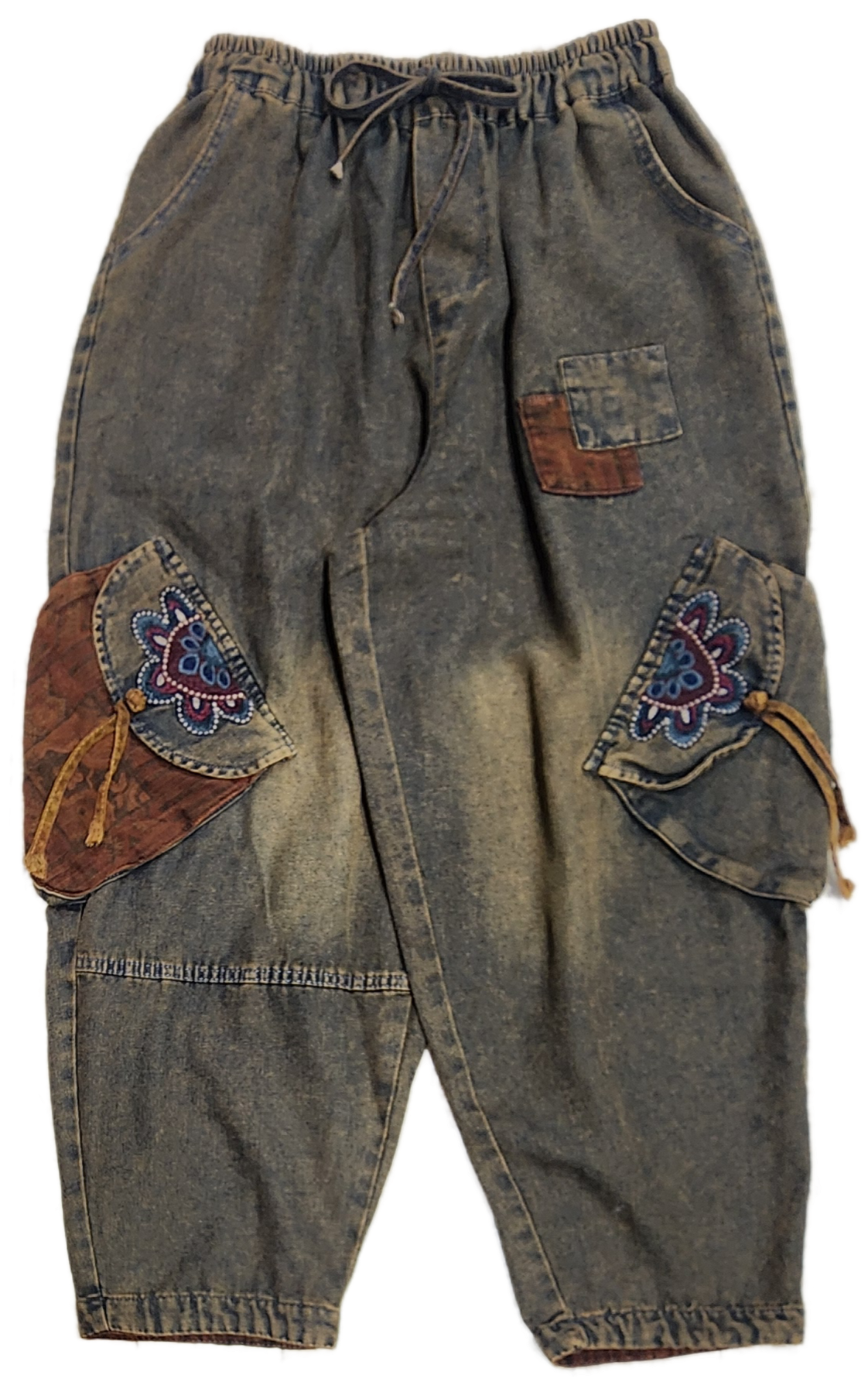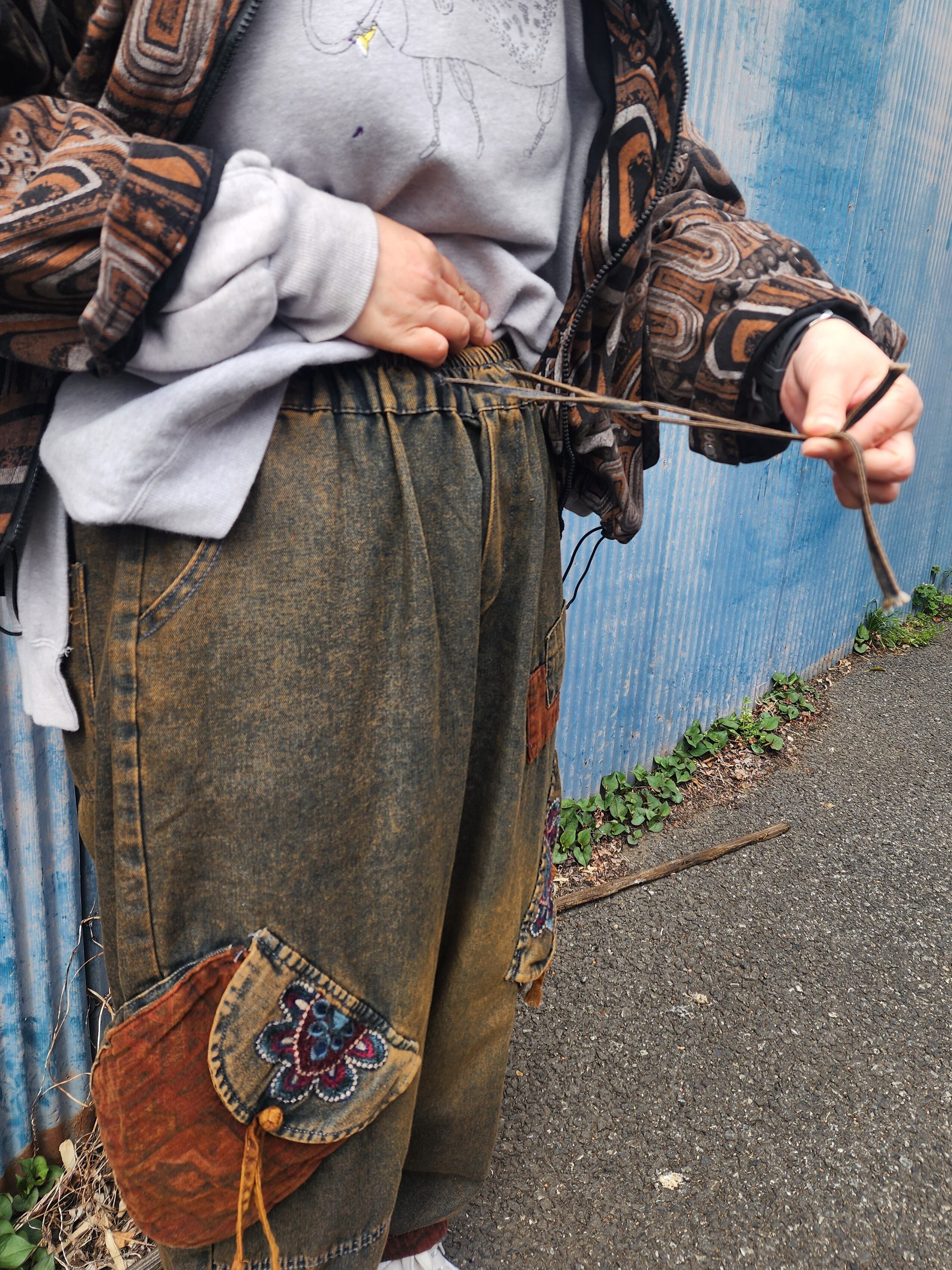 裾を一折りするとポッケやパッチワークと同生地が貼ってある所もポイントです。
