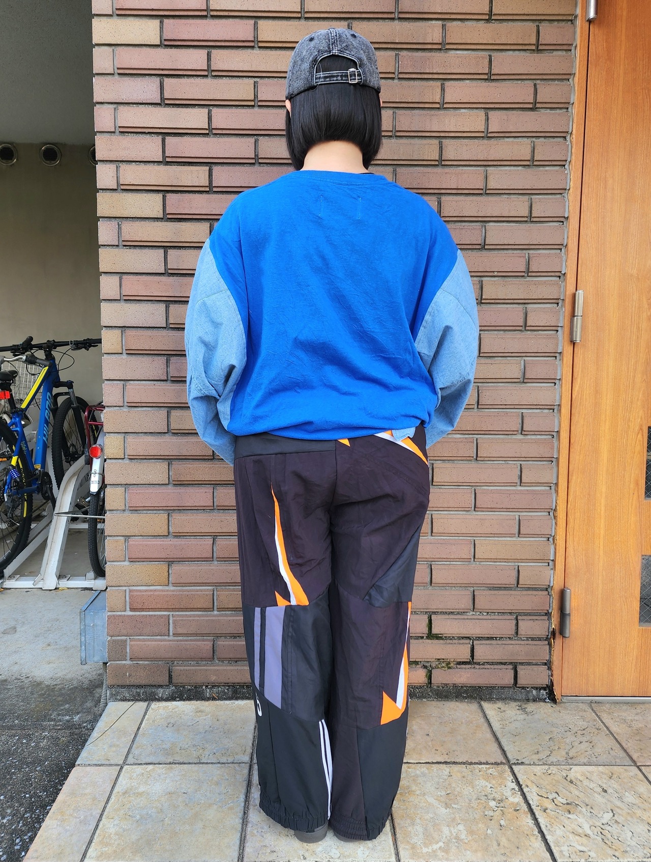 ナイロン系の古着をパッチワークリメイクしたワイドパンツ。