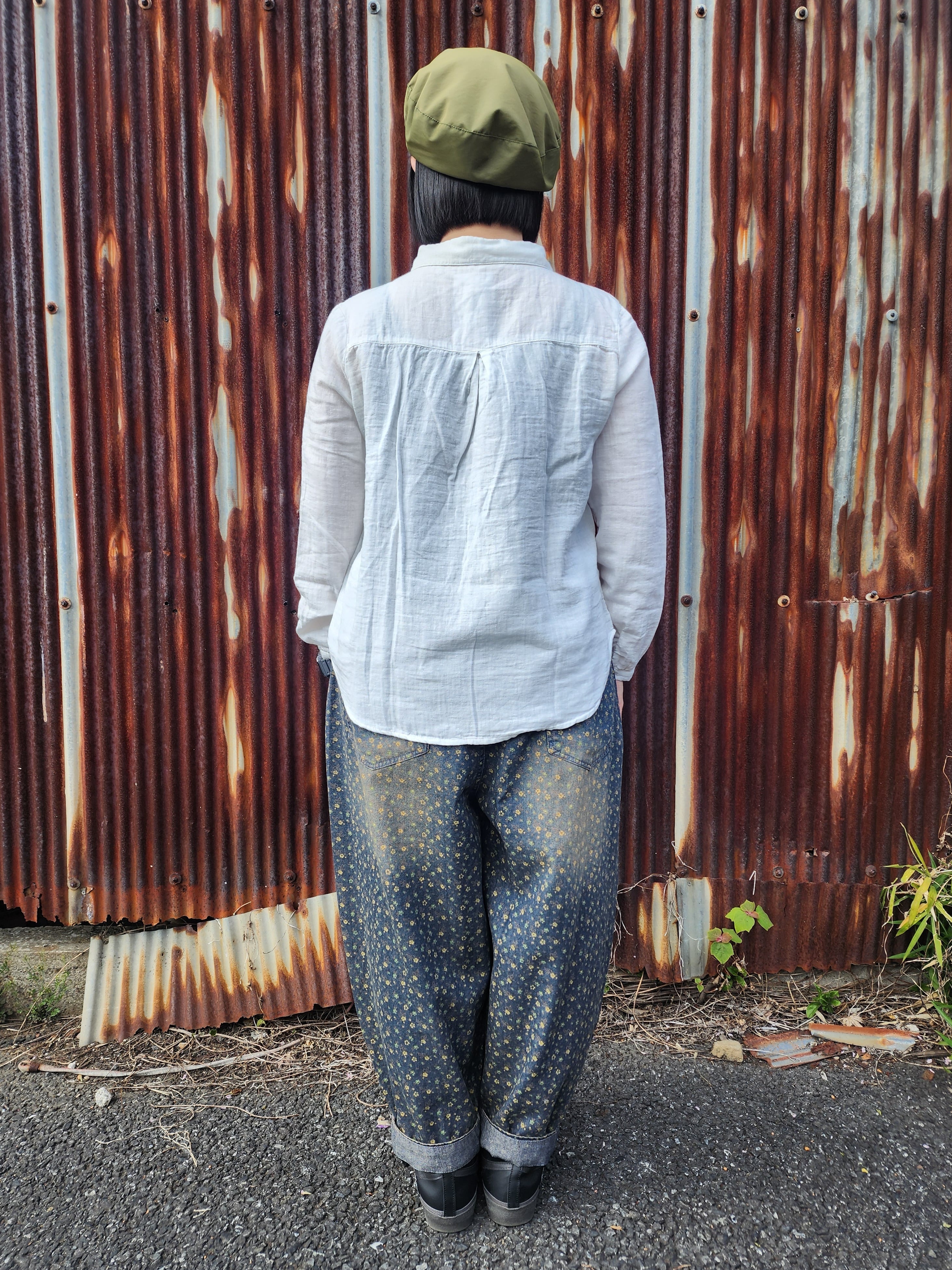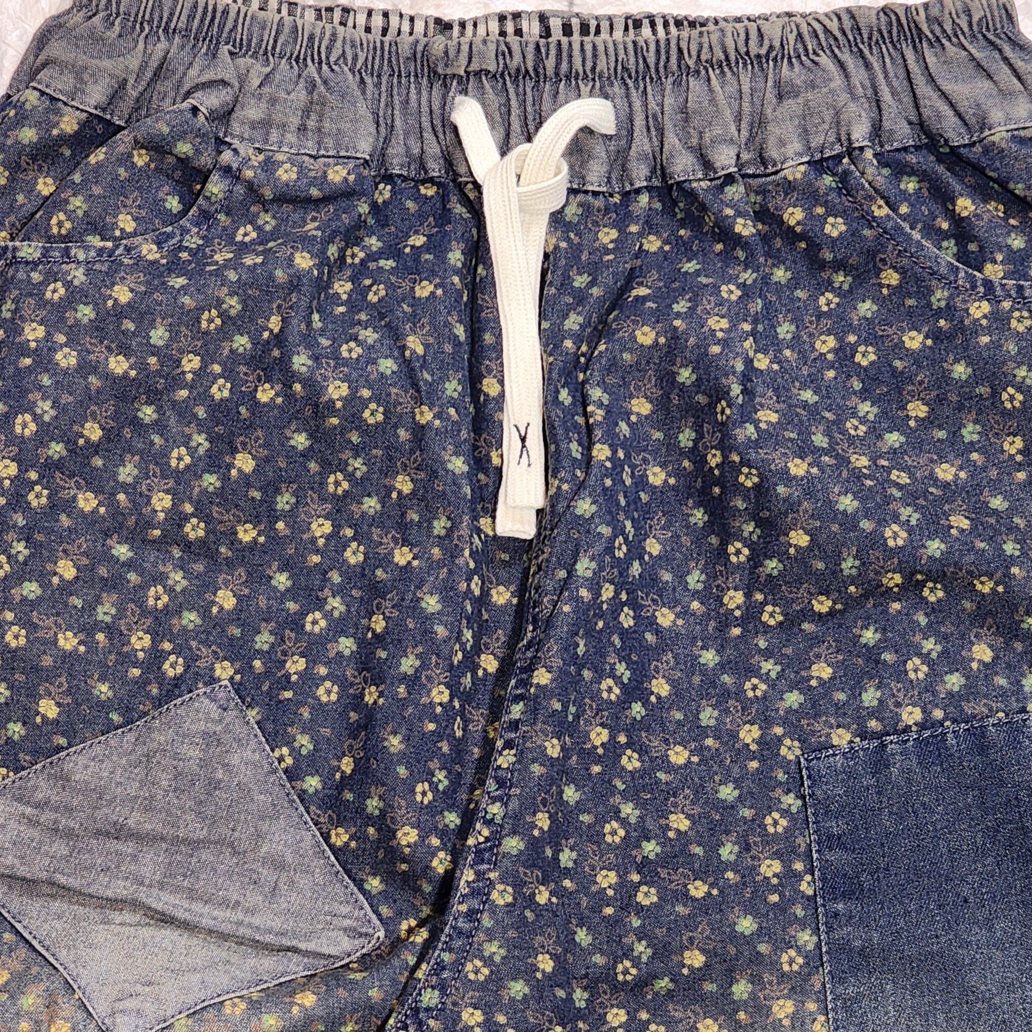 小花柄の総柄デニムのフロントに四角いパッチワークを施した人気のパンツ。