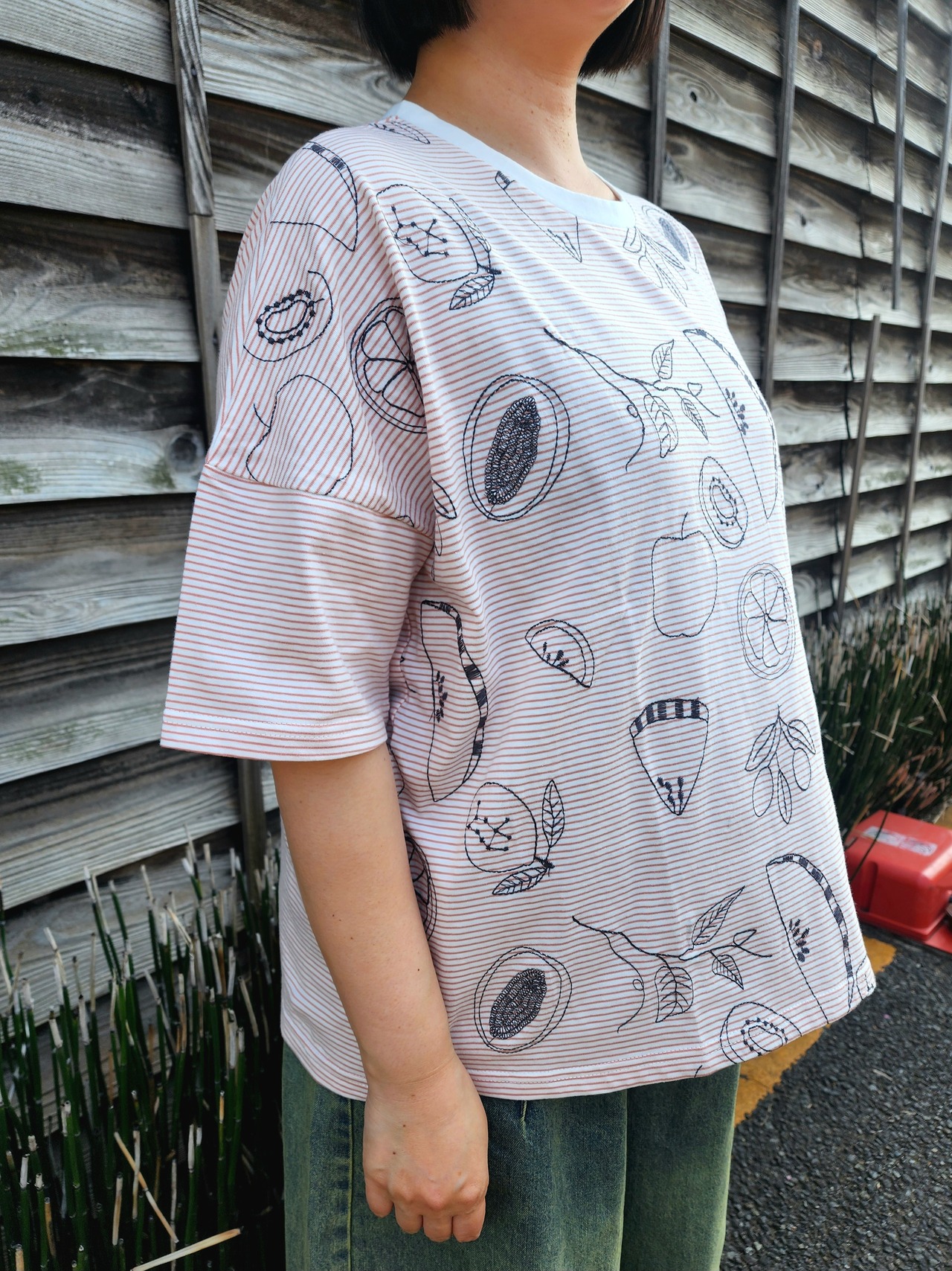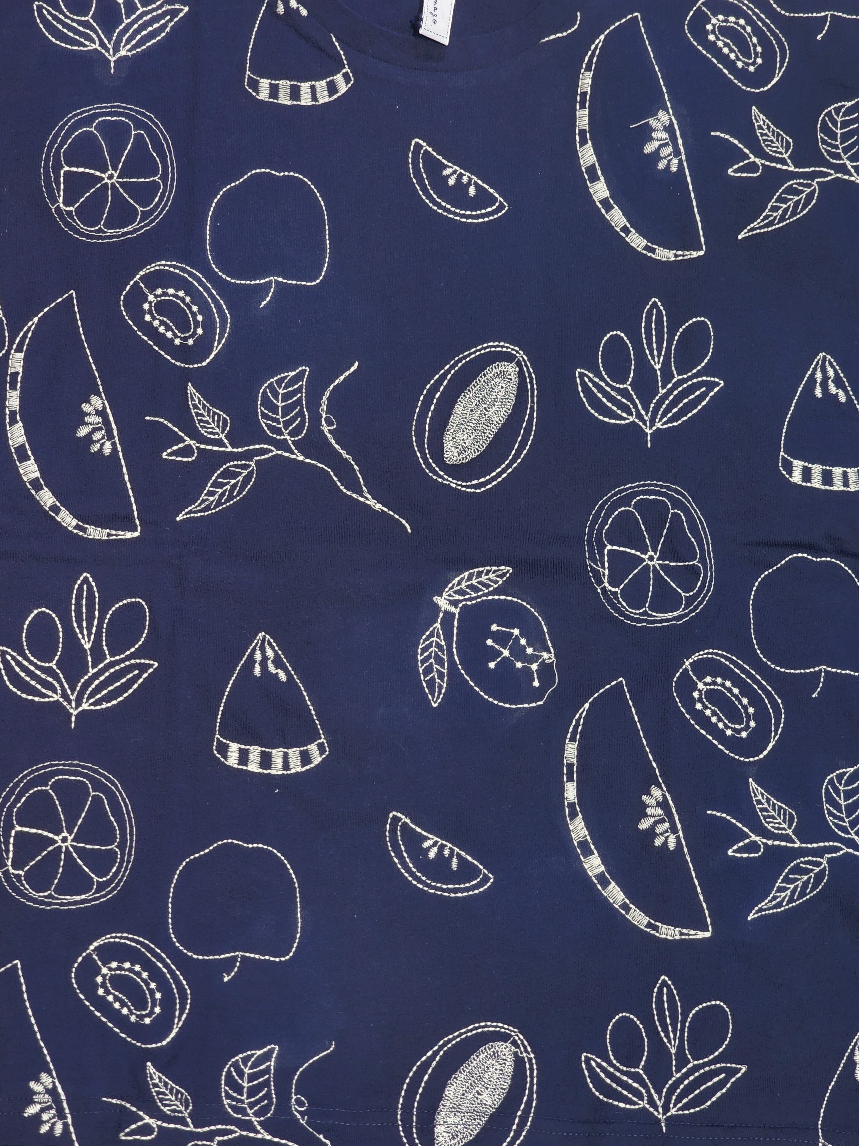 柔らかなコットン生地にフルーツが線描きされたような刺繍が、素朴な可愛らしさ◎