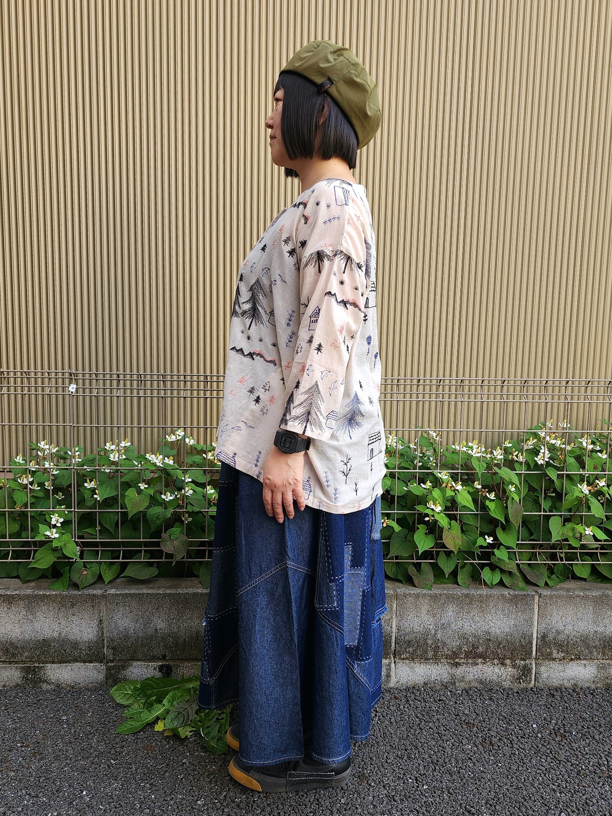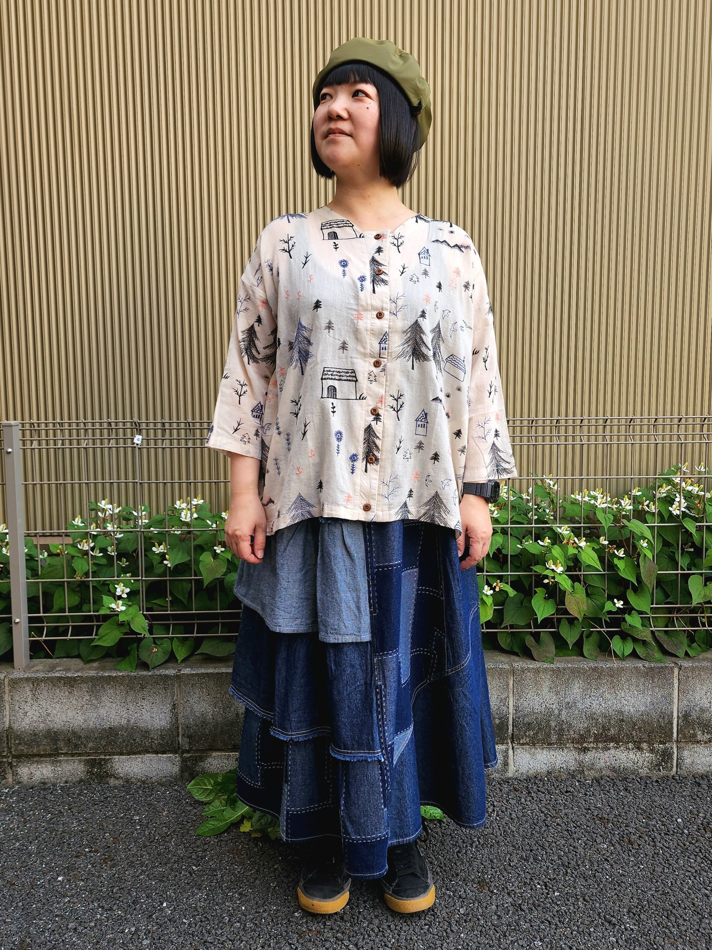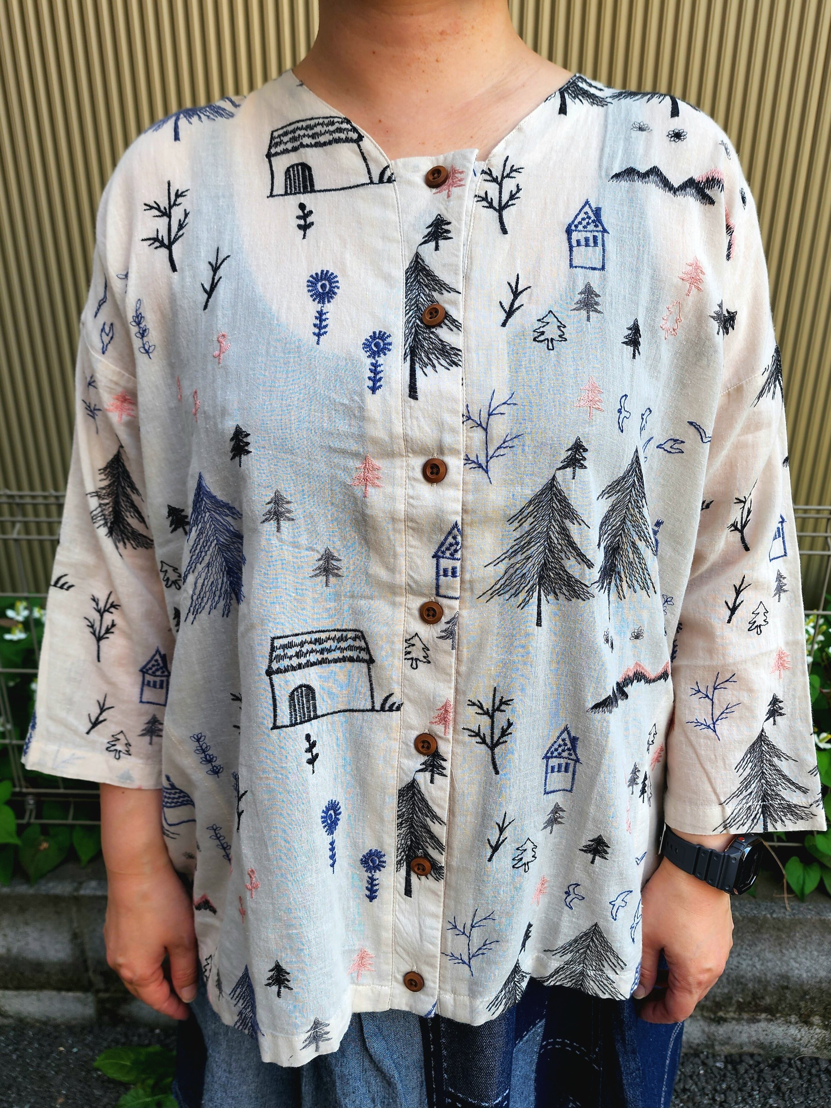 山の中の植物やお家が可愛いEmagoオリジナルの刺繍のノーカラーシャツ。