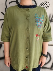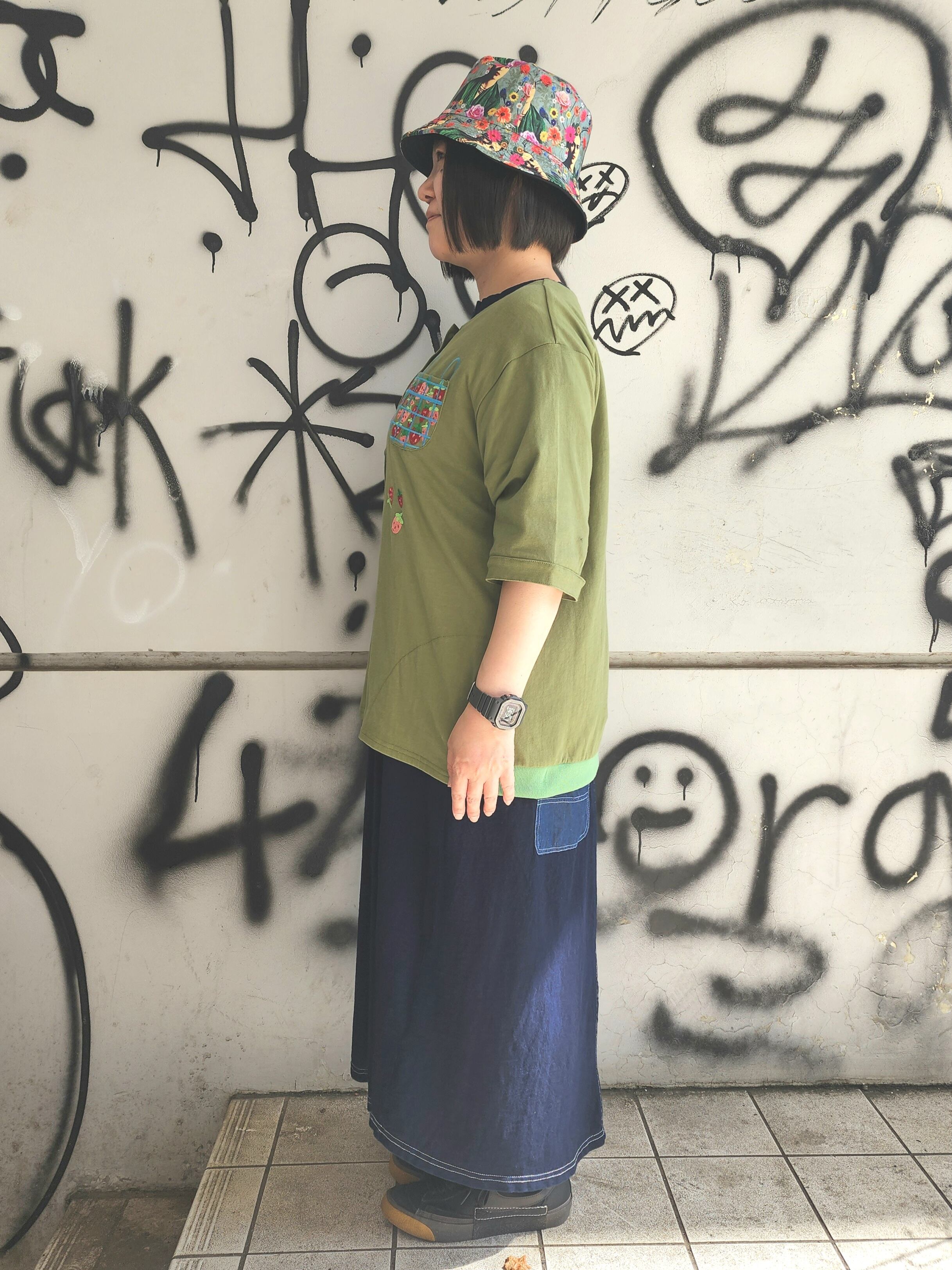 袖は肘の隠れる五分袖で、ゆったりとした身幅にお尻の隠れる丈の長さがあります。