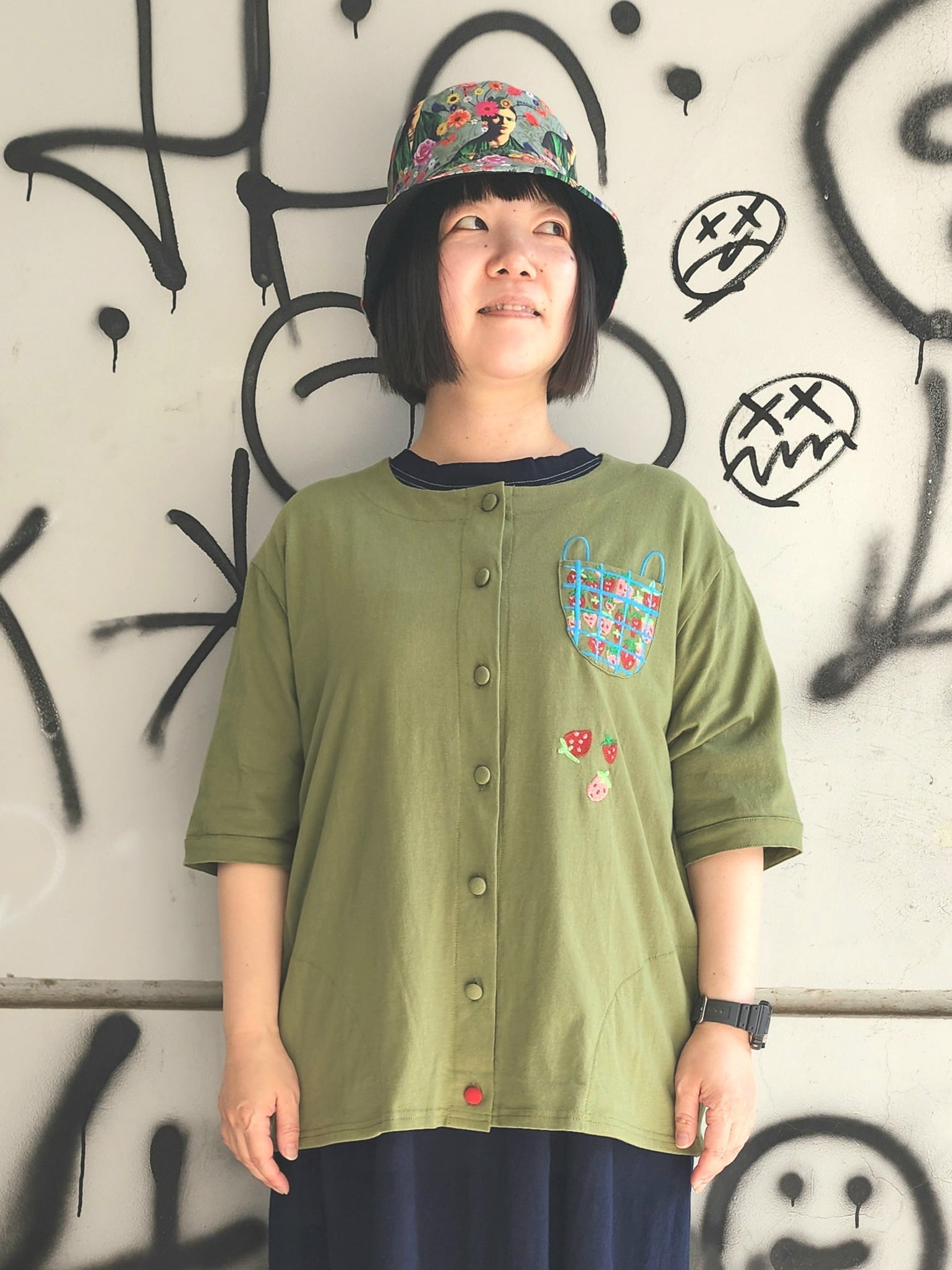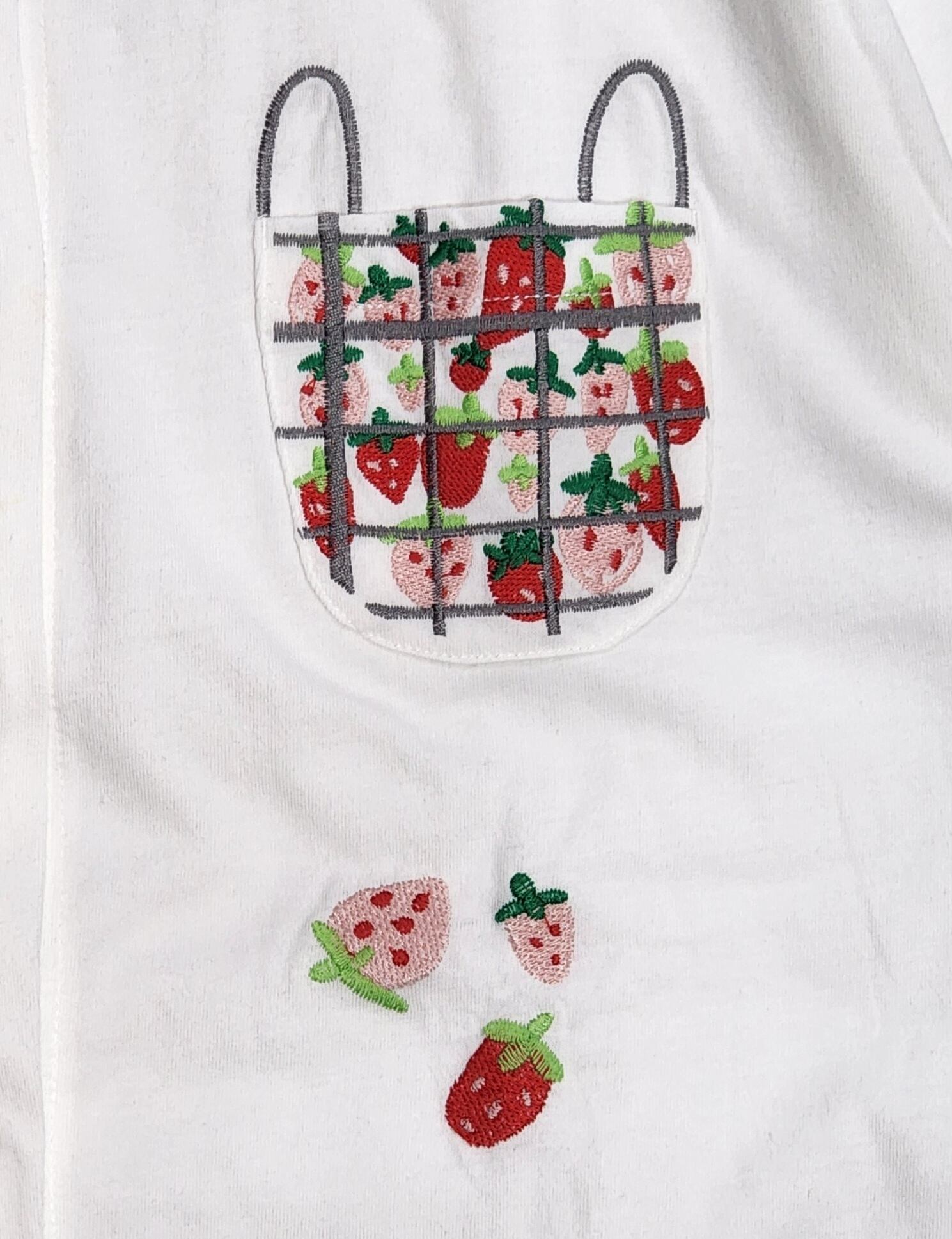 イチゴを入れたバスケットの刺繍がポケットになっている可愛らしいデザイン。