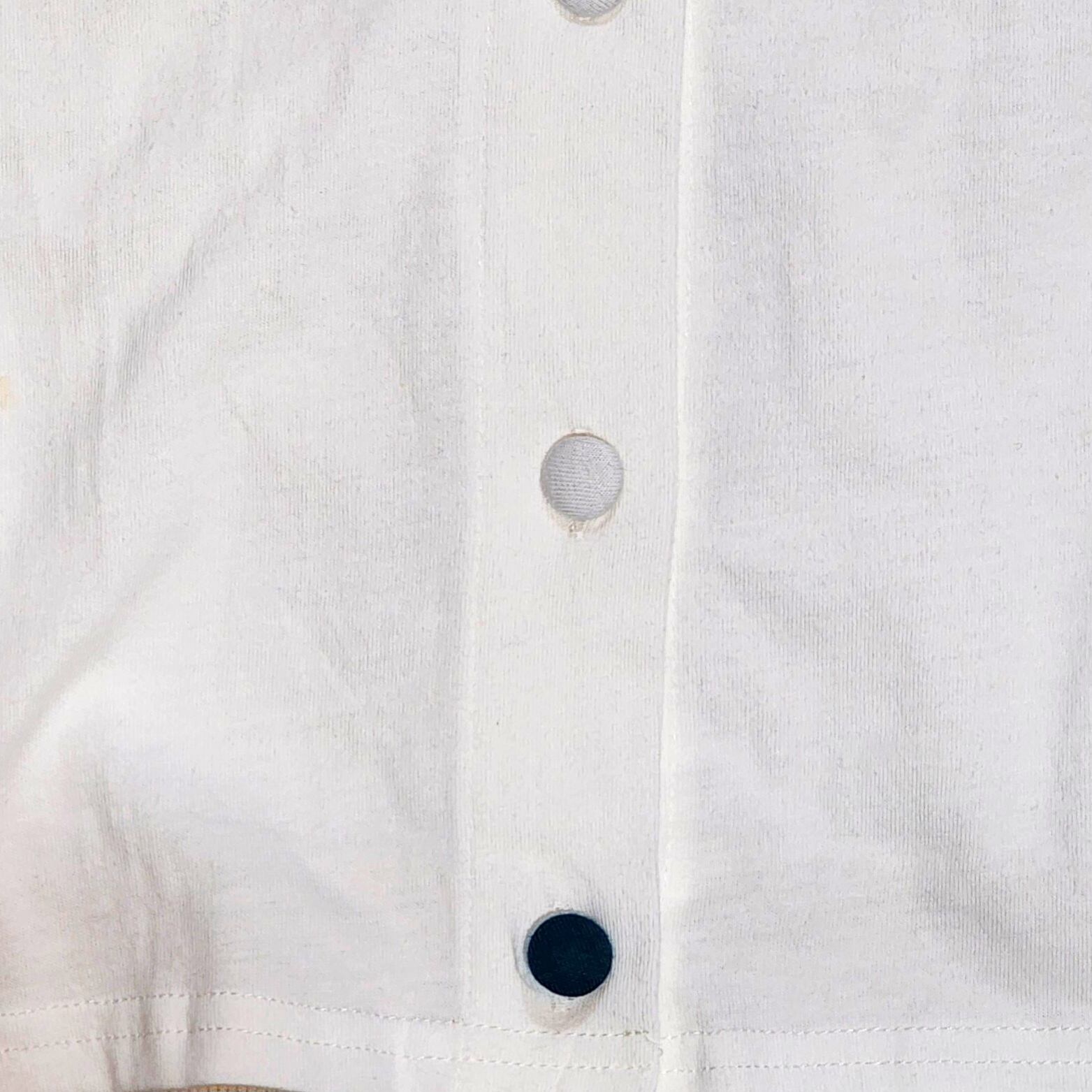 袖後ろが三角にあいている所や一番下のくるみ釦が配色になっている所など、Emagoらしいアクセントがデザインのポイント。