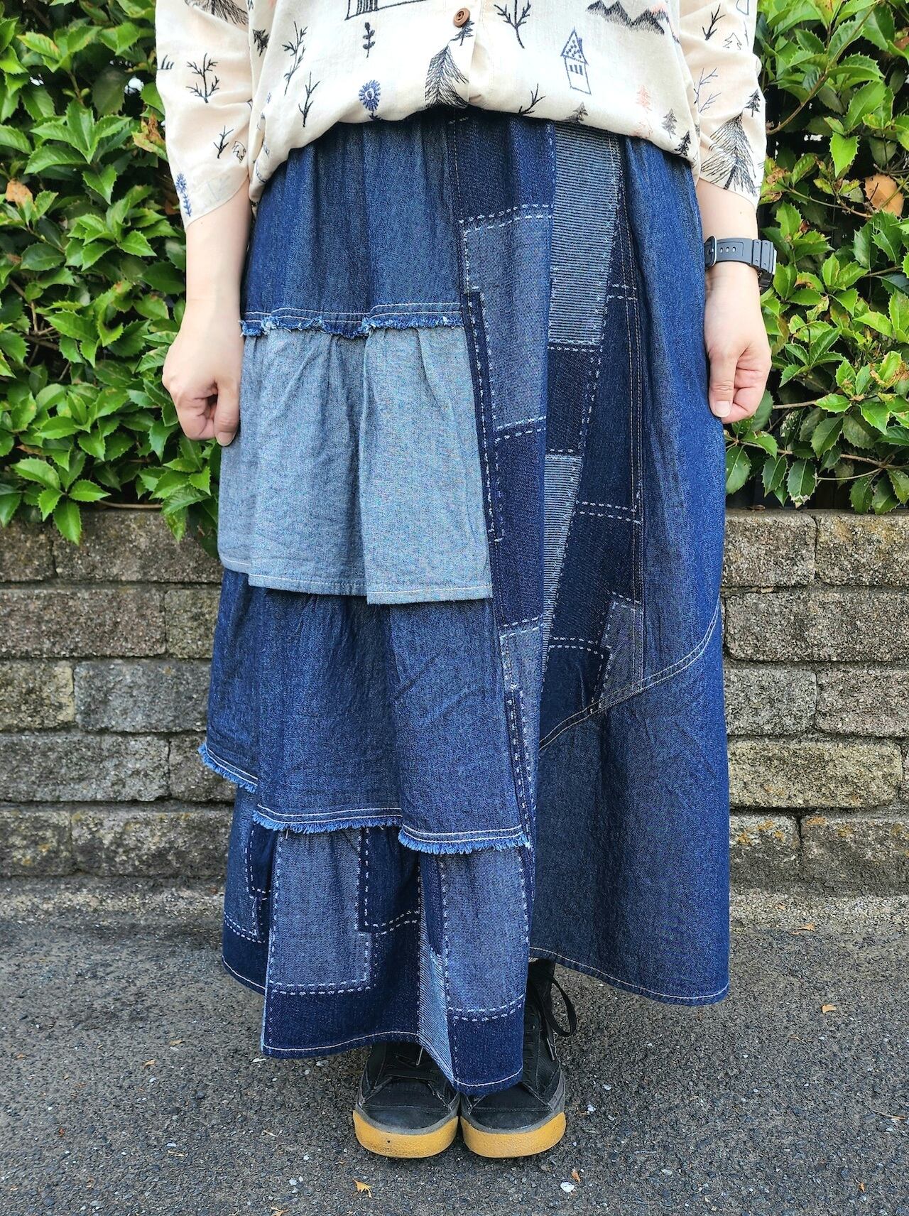 フリルやパッチワーク風のデニム生地などを組み合わせたアシンメトリーデザインのデニムスカート。