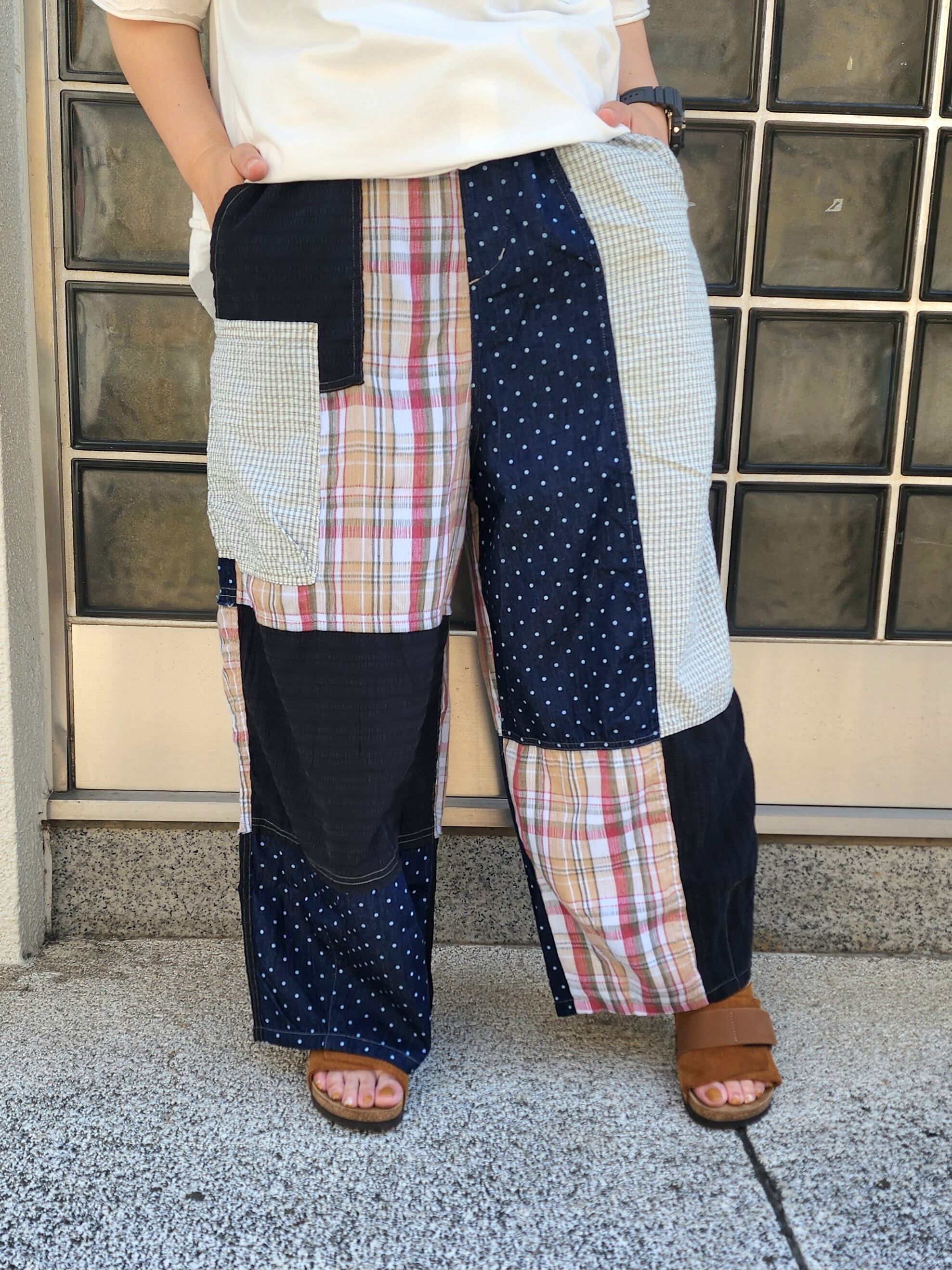 ゆるっとしたシルエットが可愛い、薄手で柔らかな生地をパッチワークしたワイドパンツ。
