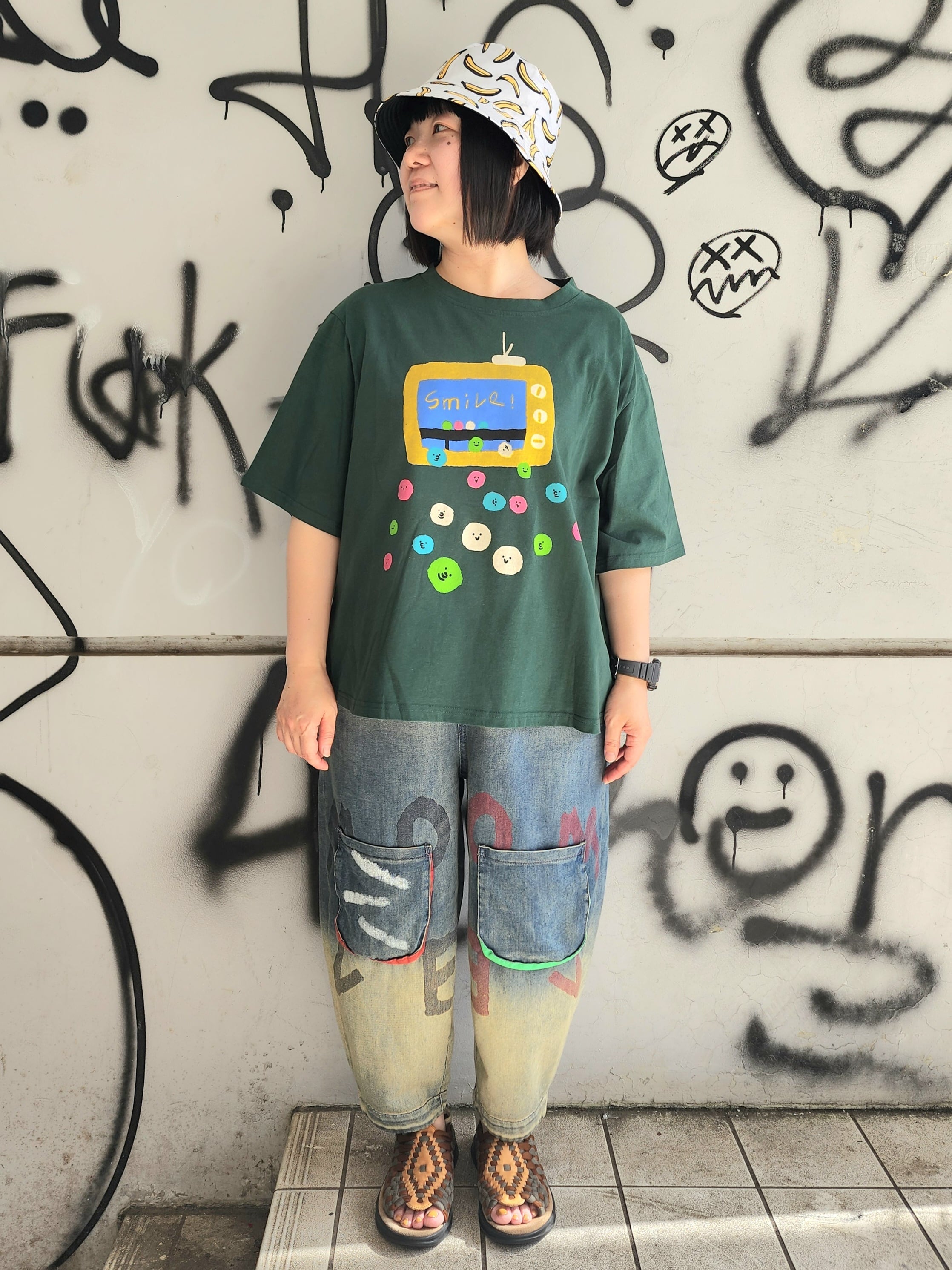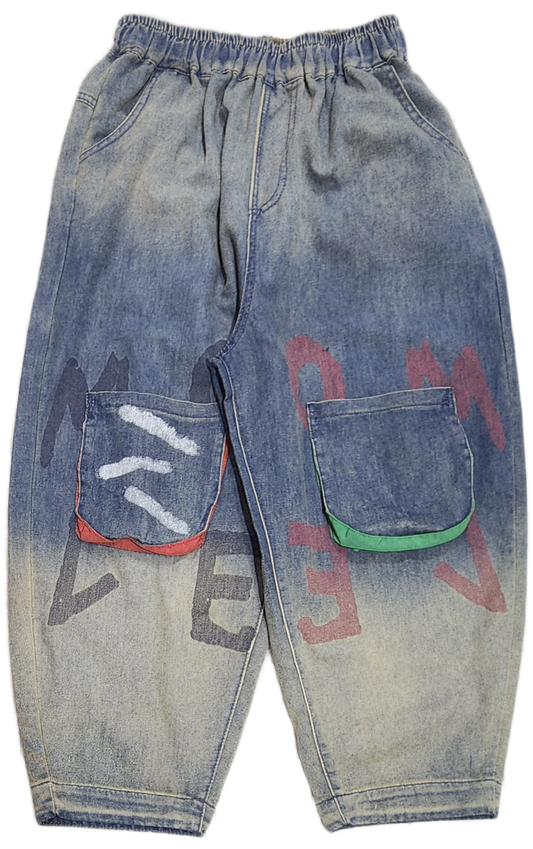 落書き風のアルファベットや両ひざのマチ付きポケットが個性的で、他にはない可愛らしさです☆