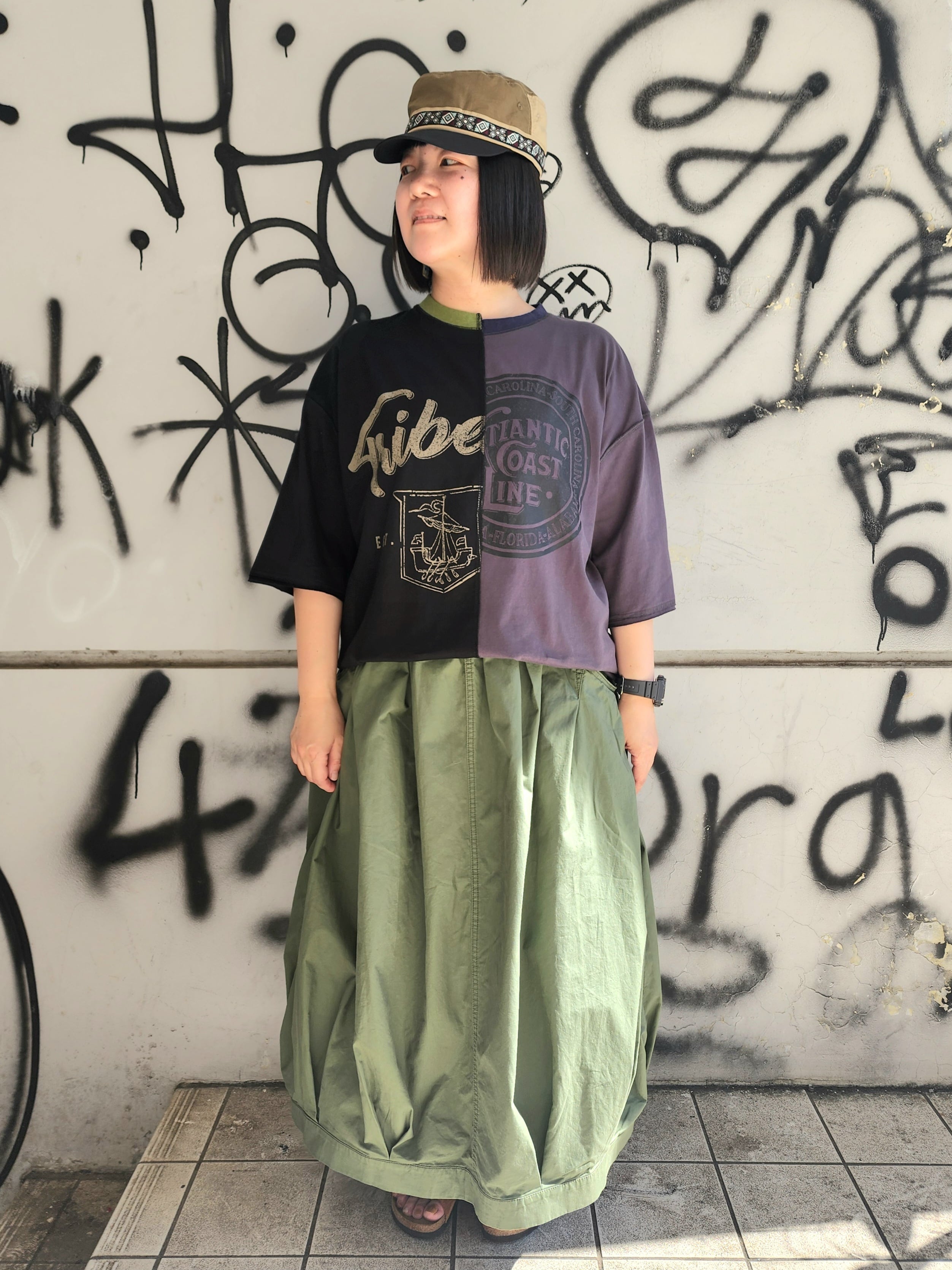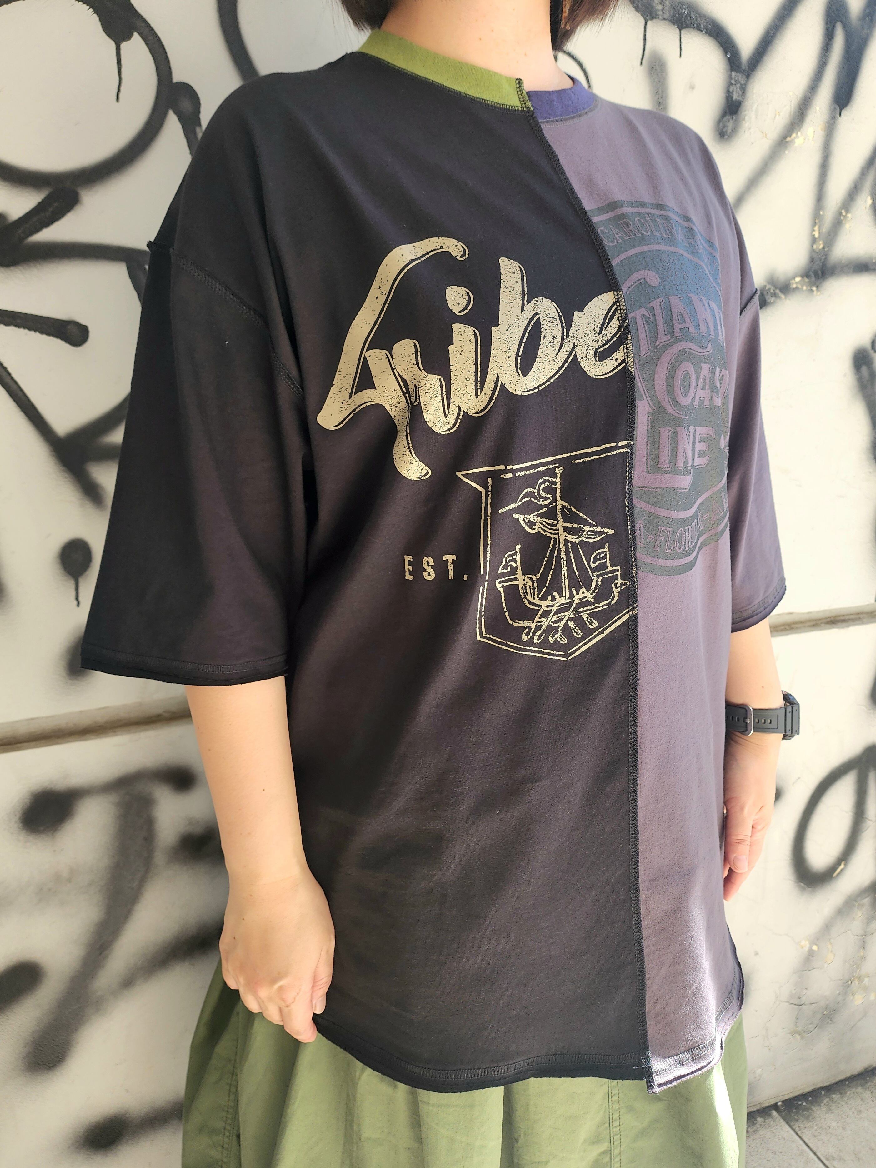 リメイク風に左右違ったTシャツを組み合わせたデザインのビックT。