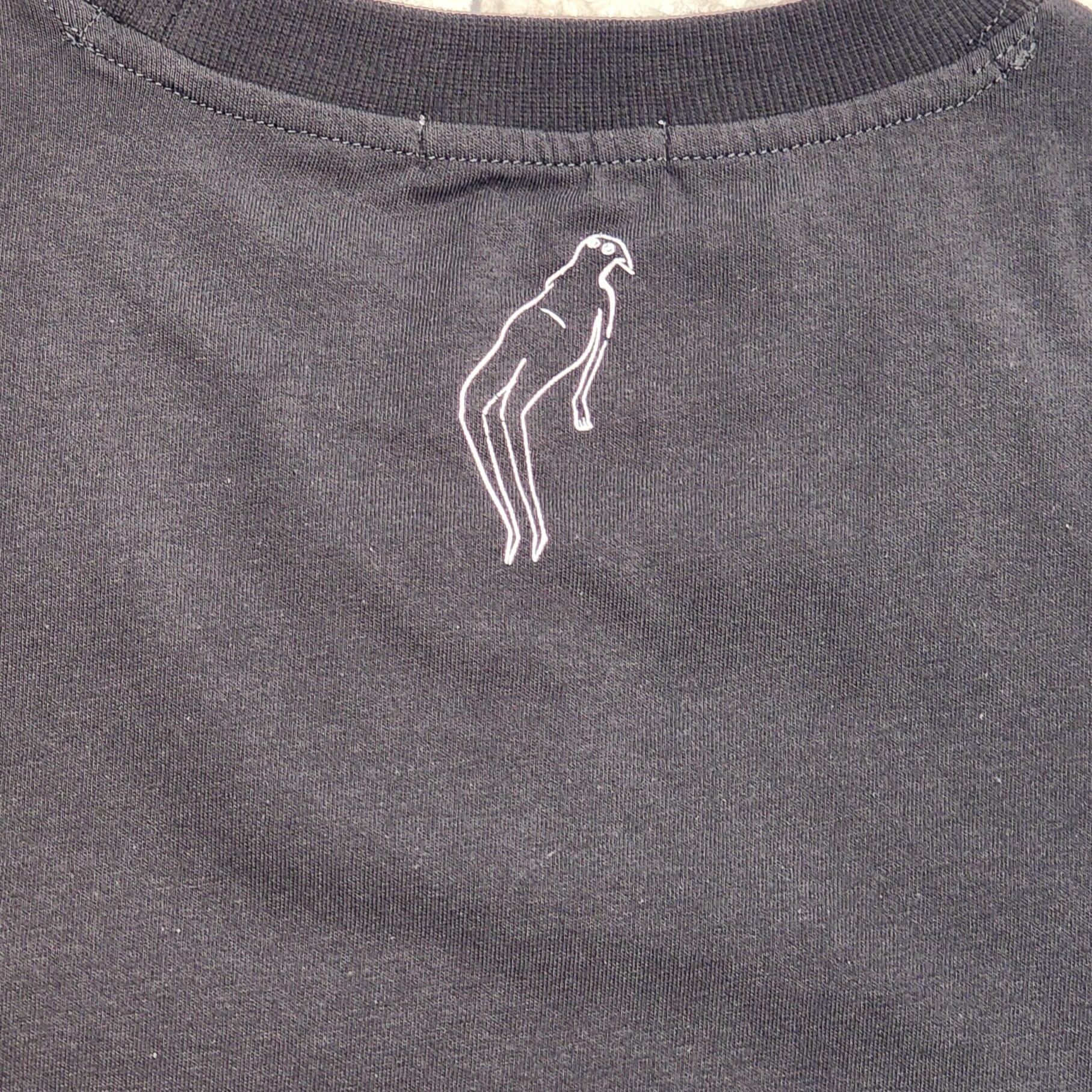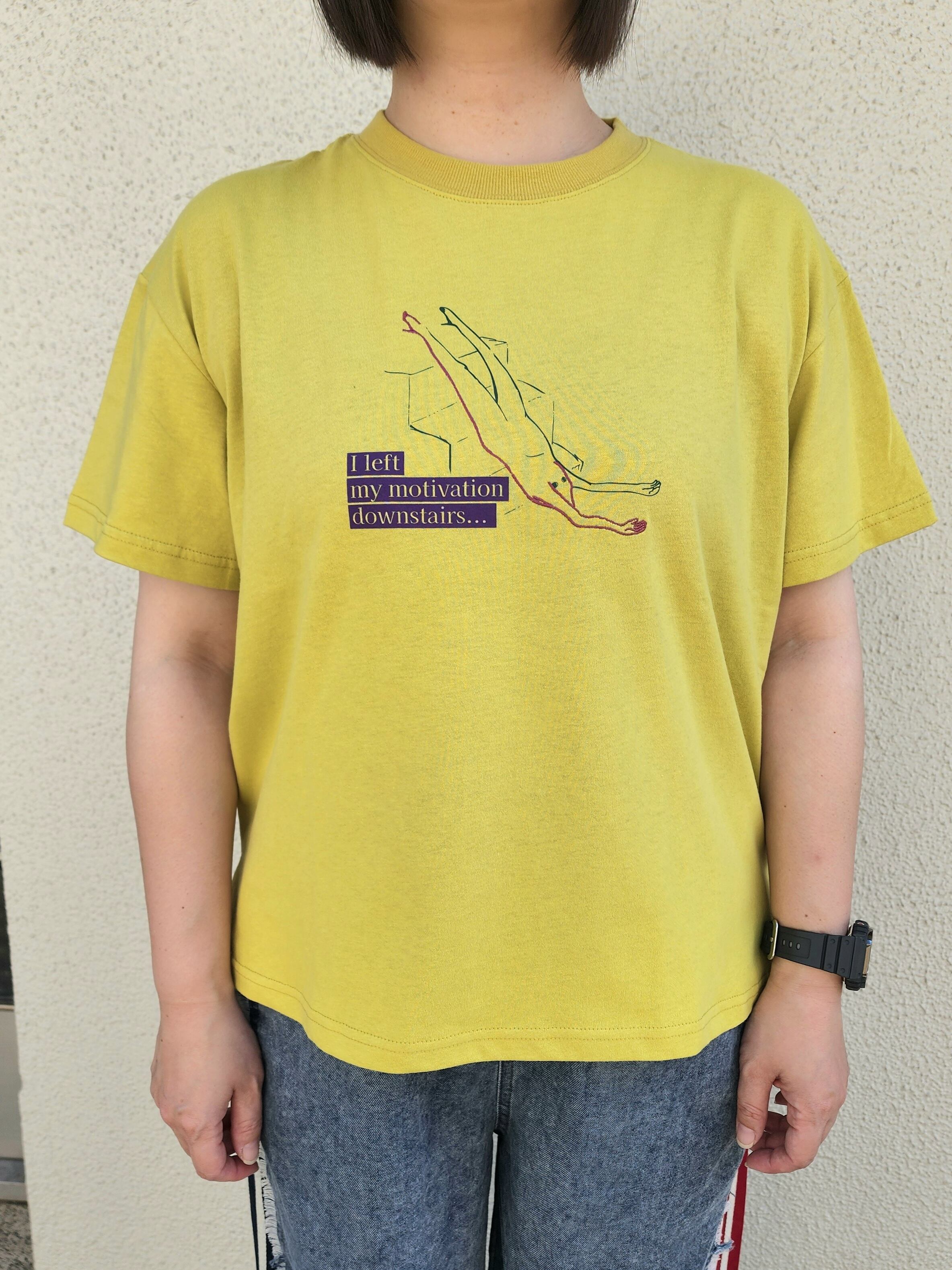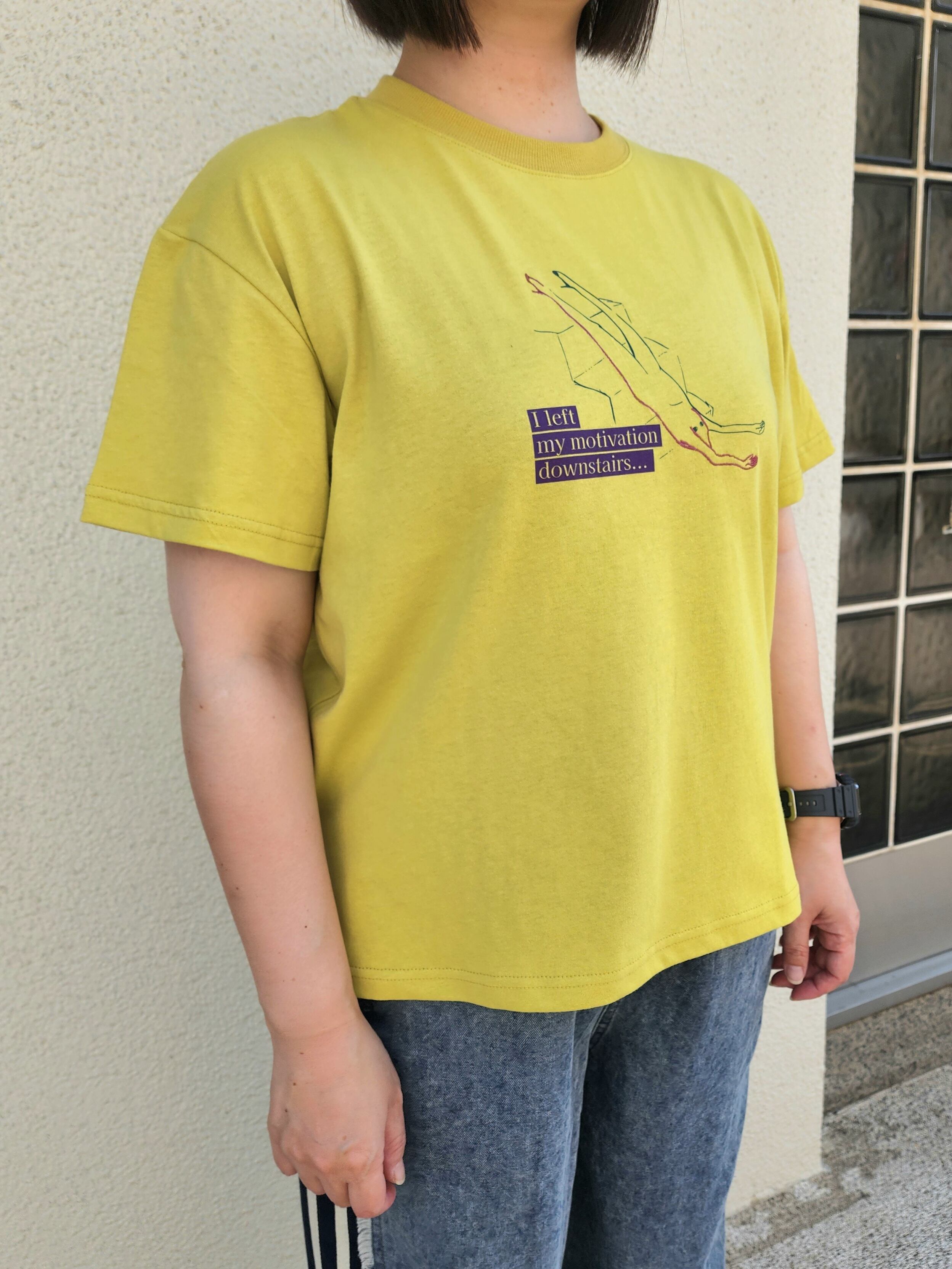 やる気を下の階に置いてきてしまった人の大胆な休憩がプリントされたTシャツ。