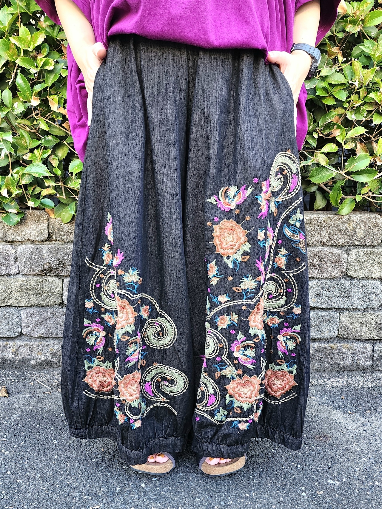 花と鳥刺繍ワイドデニムバルーンパンツ