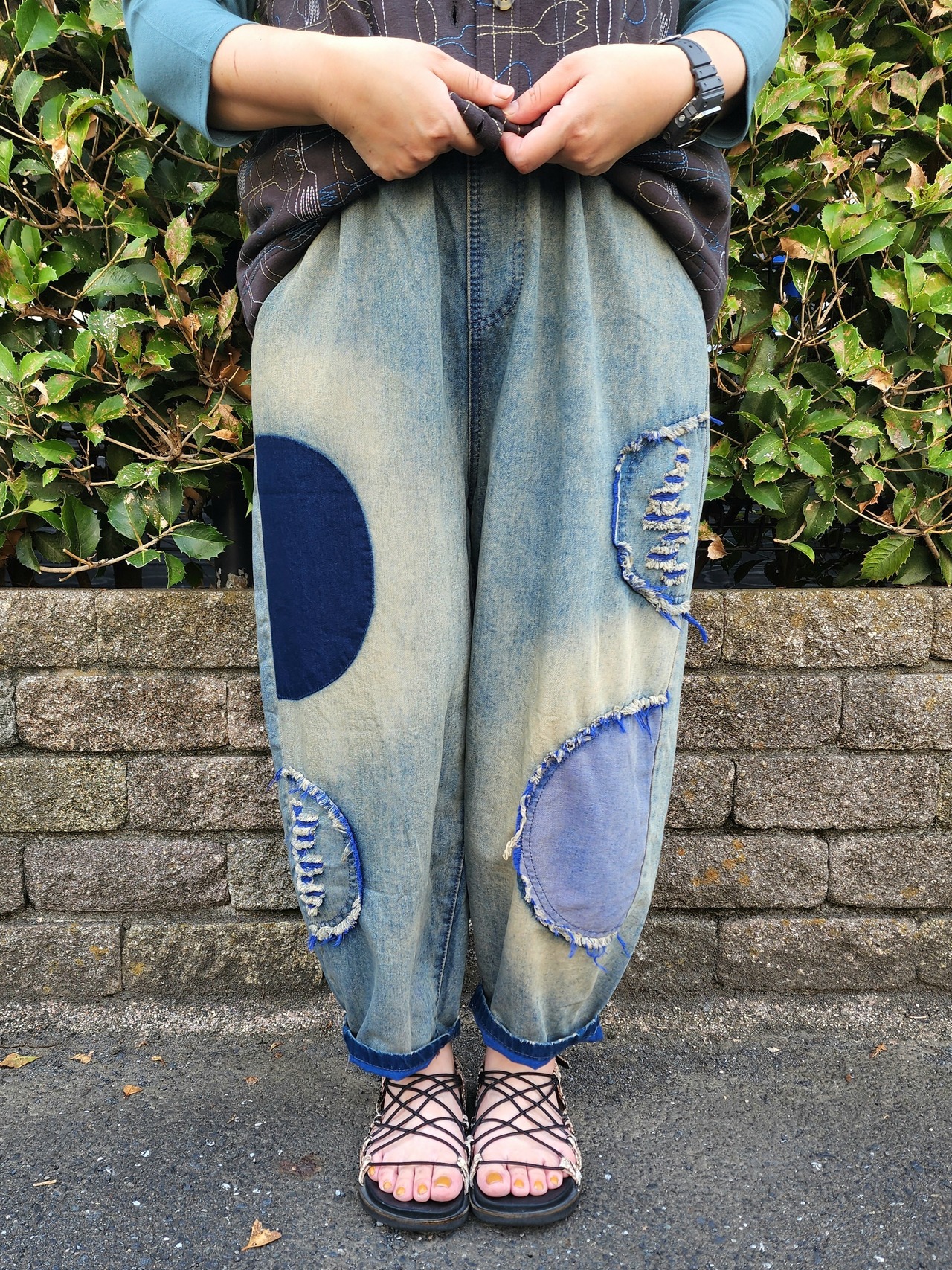 デニムをくり抜いてパッチワークしたり、ペイントしてあったりと、色々な半円モチーフが面白いデザイン。