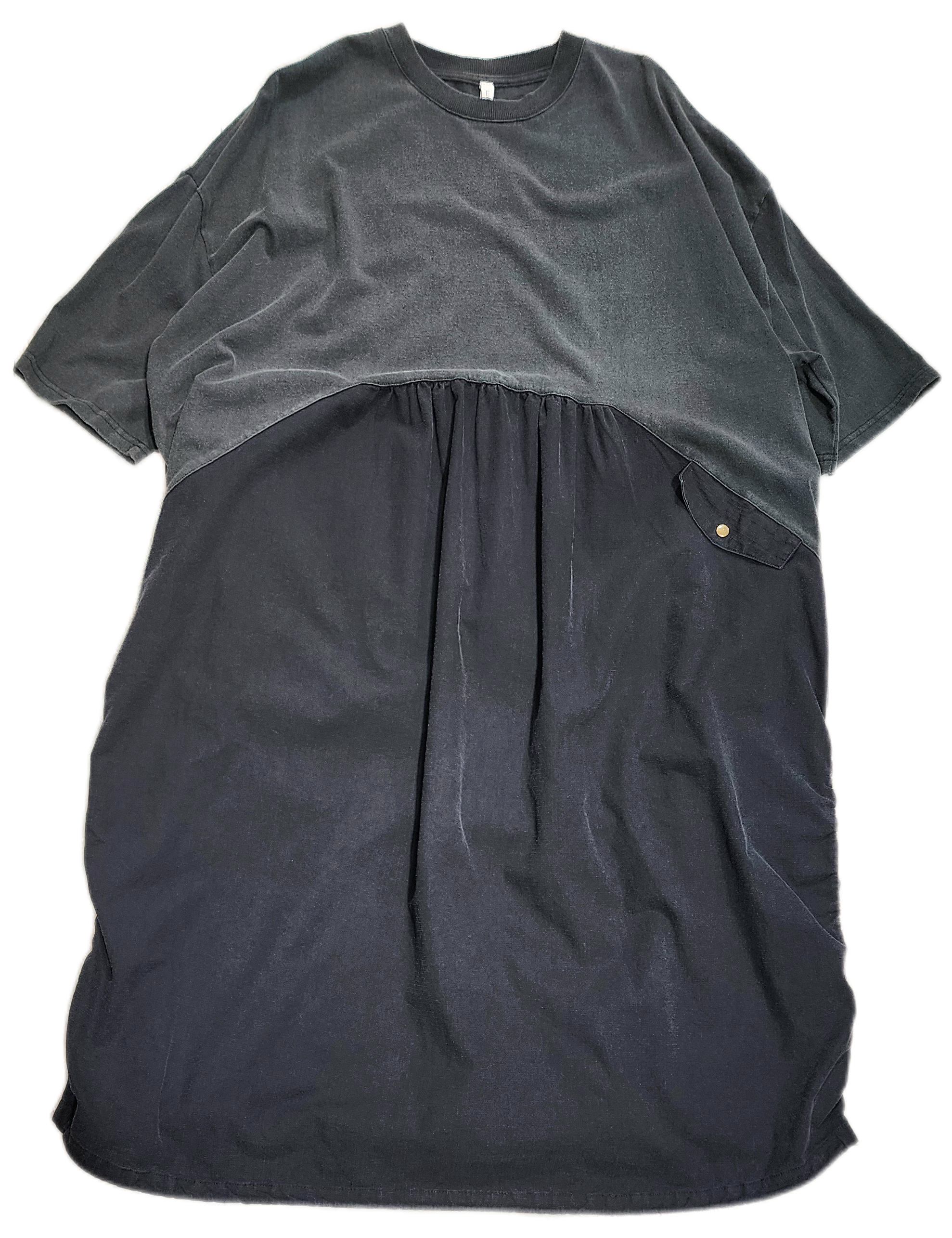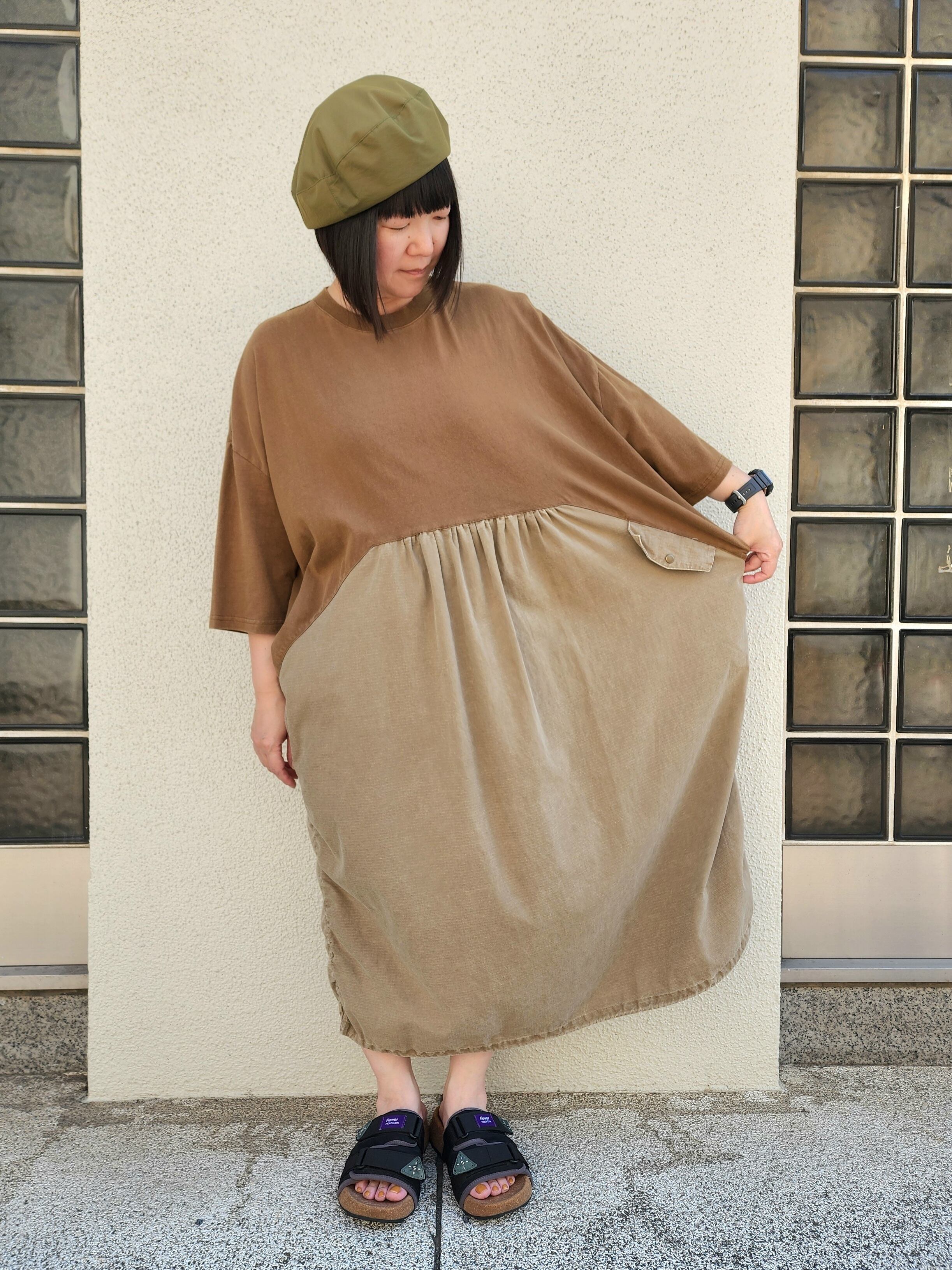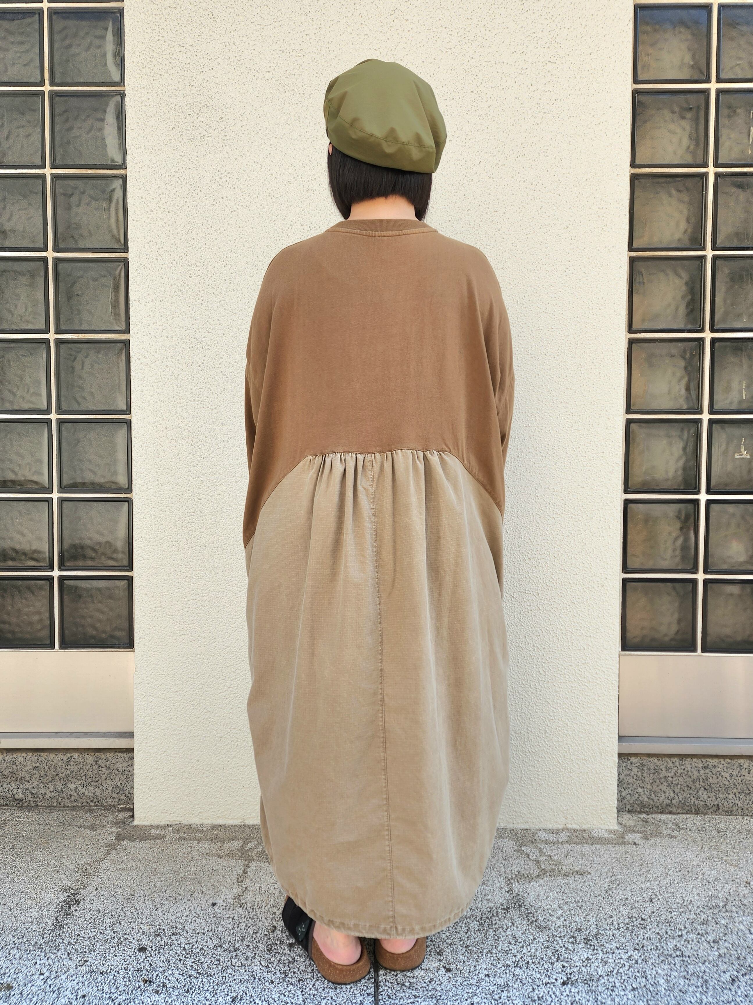 上はカットソー下は布帛で切り替えたロングワンピース。