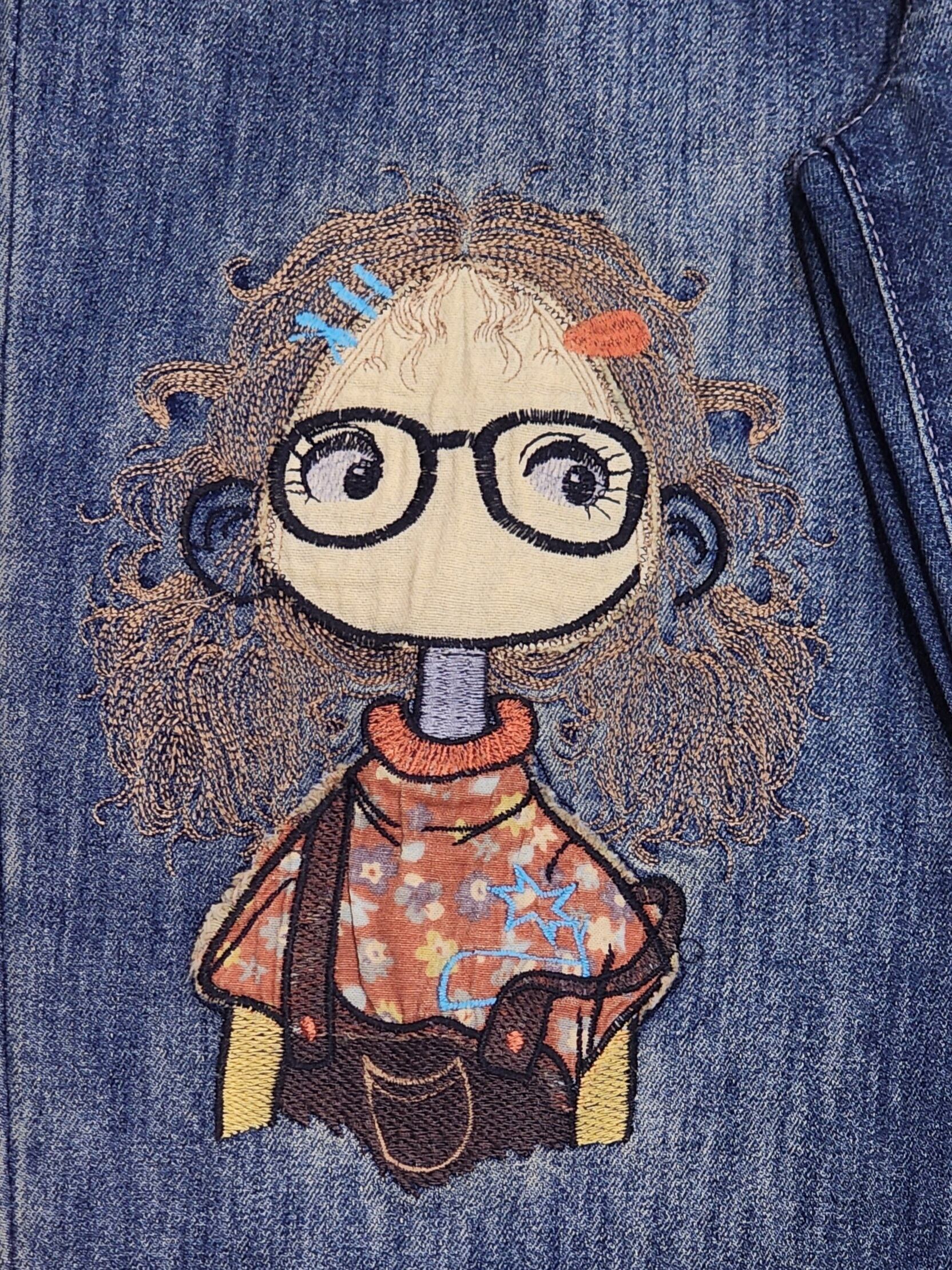 眼鏡の女の子刺繍のデニムパンツ