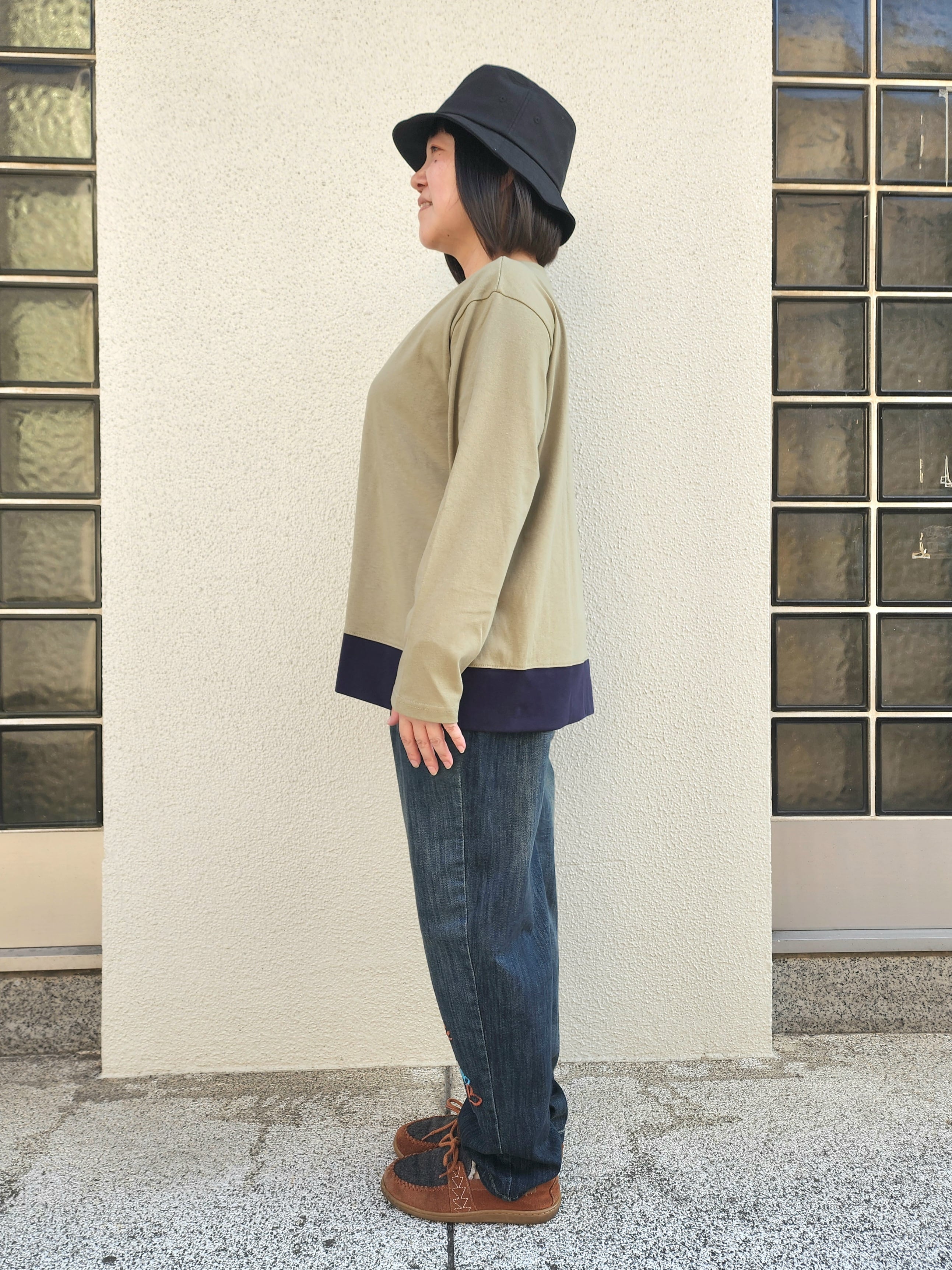 バイカラー切り替えも目を引くゆったり長袖Tシャツです。