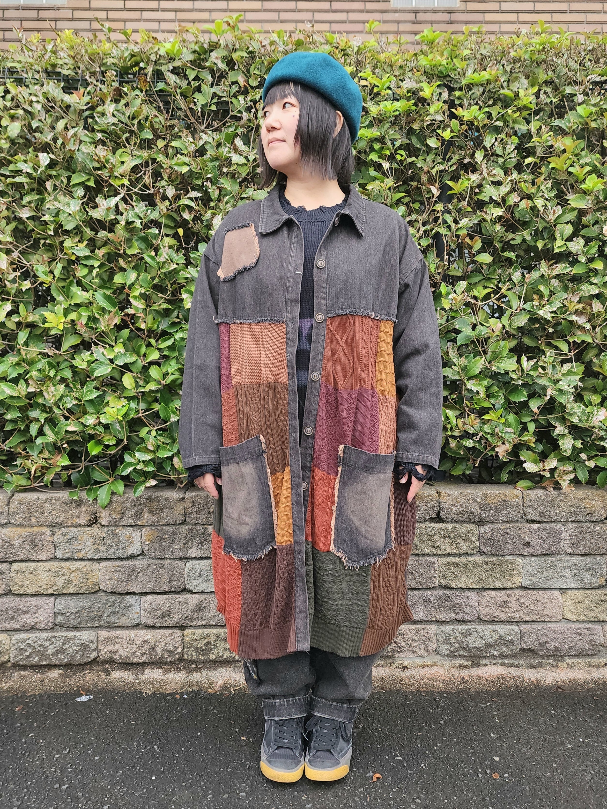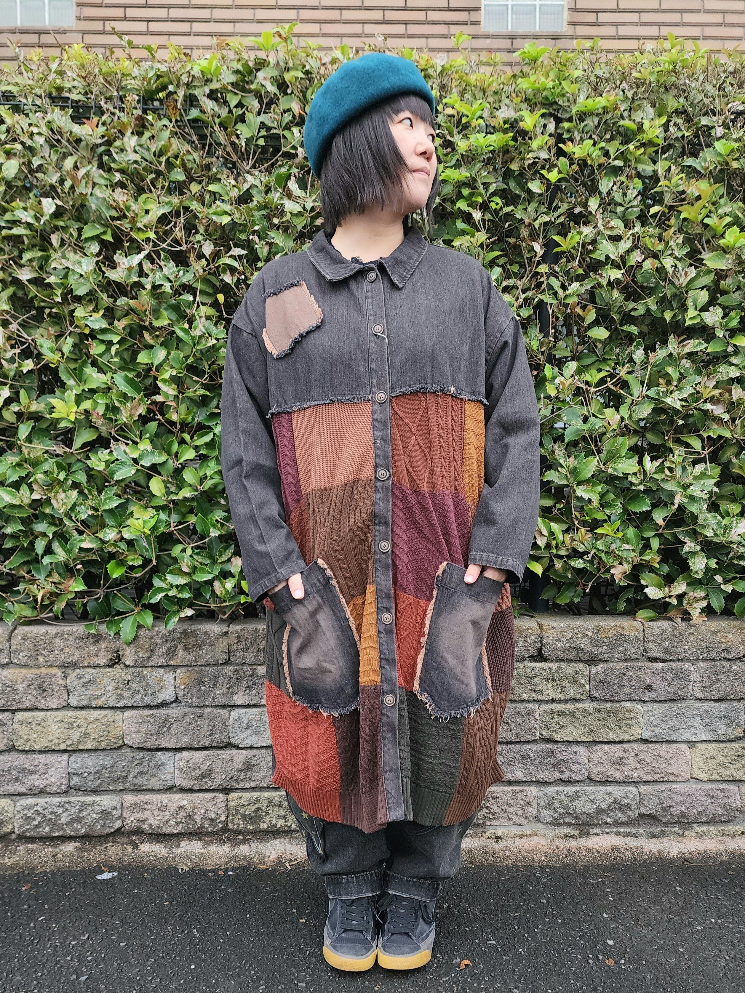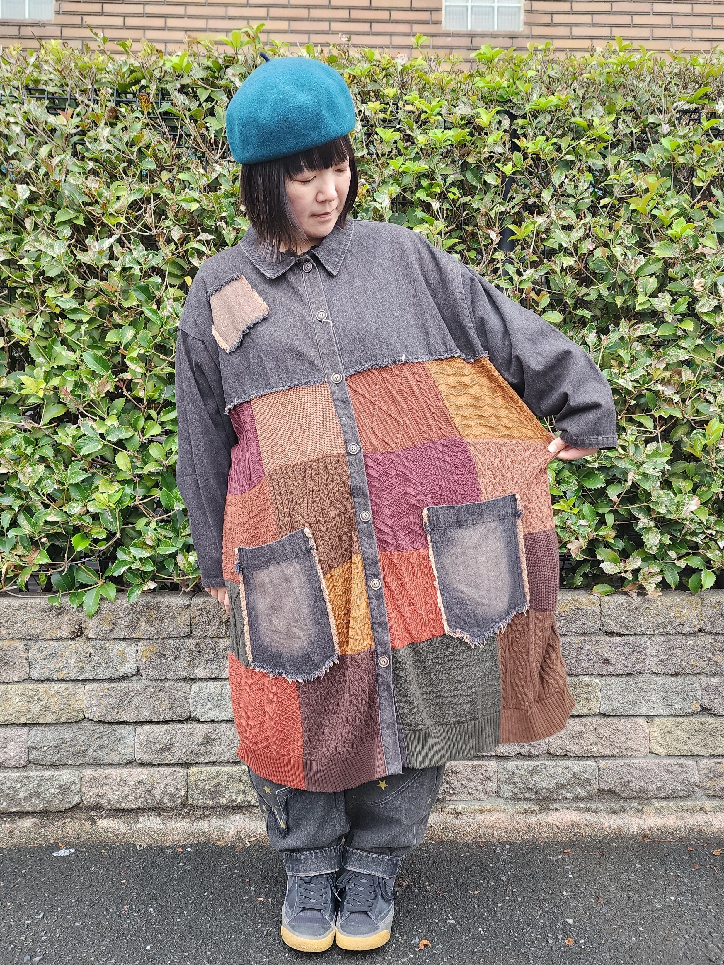 デニムとランダムにニットをパッチワークした生地を組み合わせた個性的で目を引くアウター。
