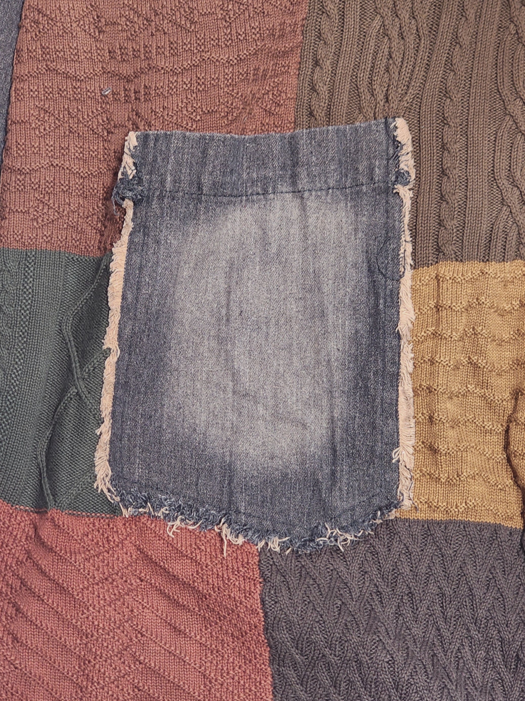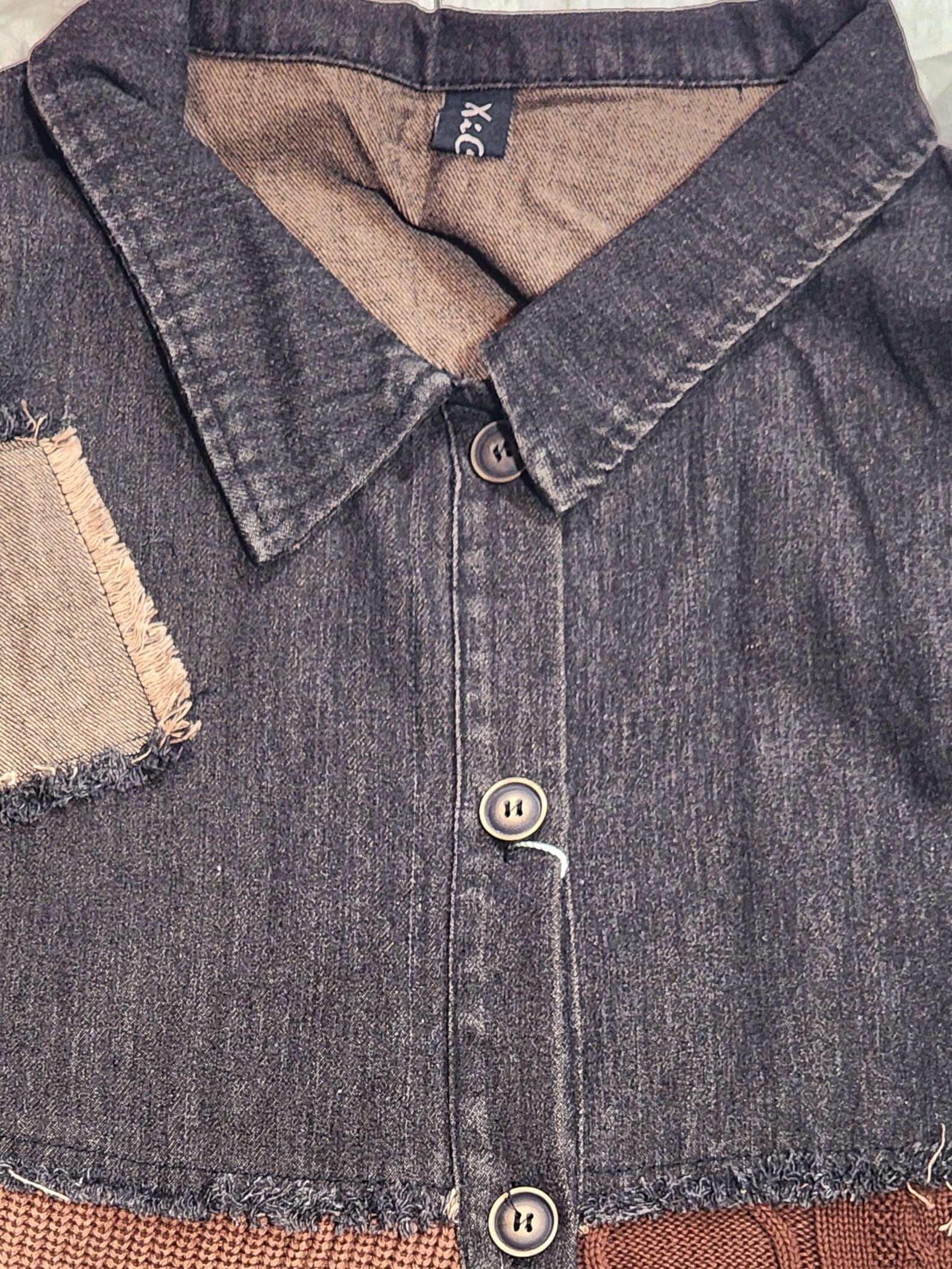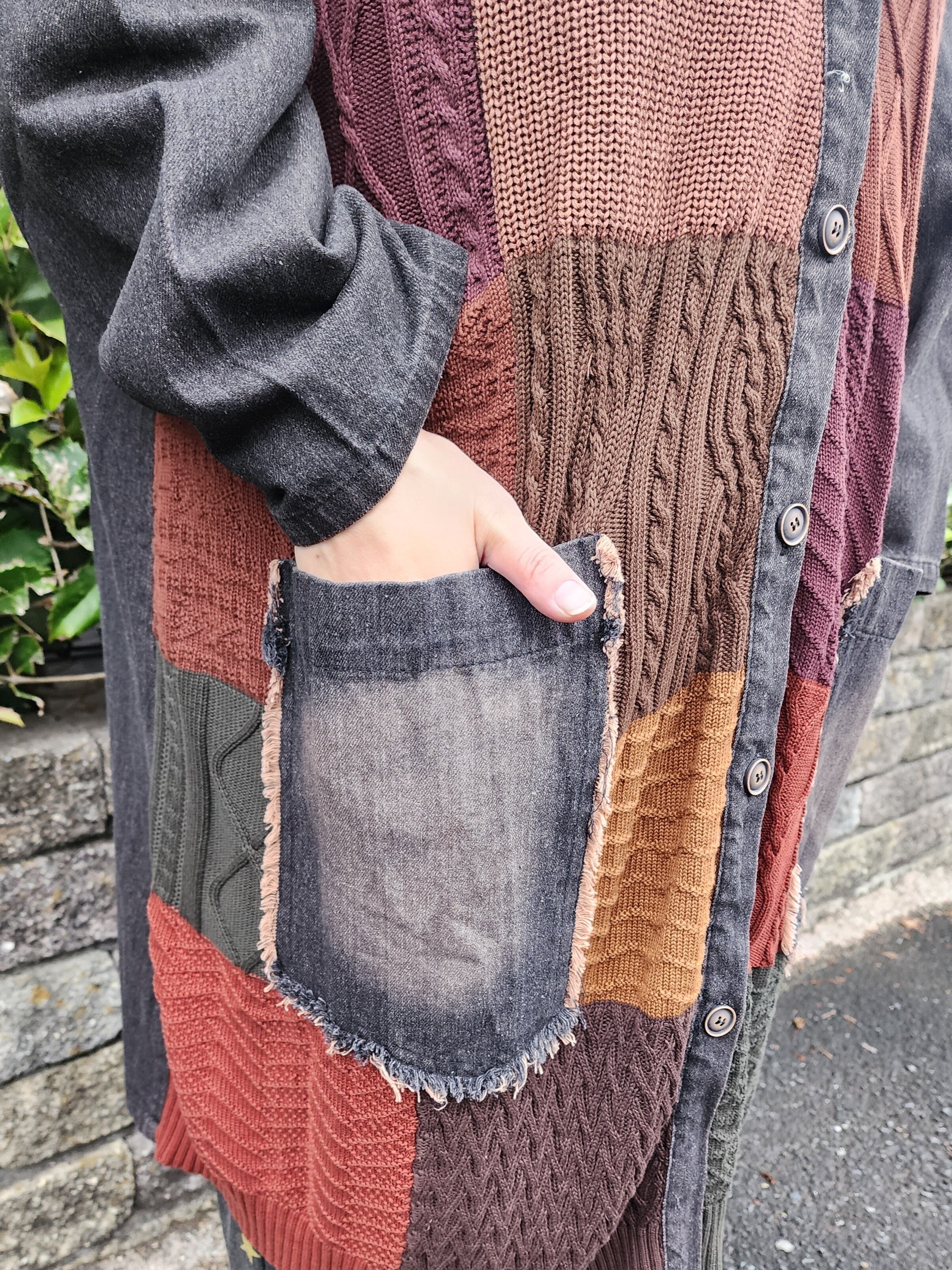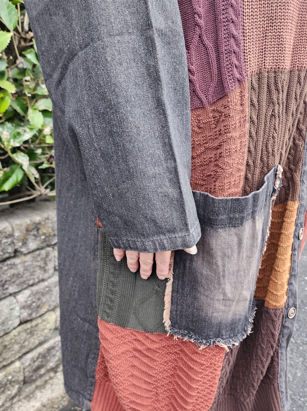 デニムとランダムにニットをパッチワークした生地を組み合わせた個性的で目を引くアウター。