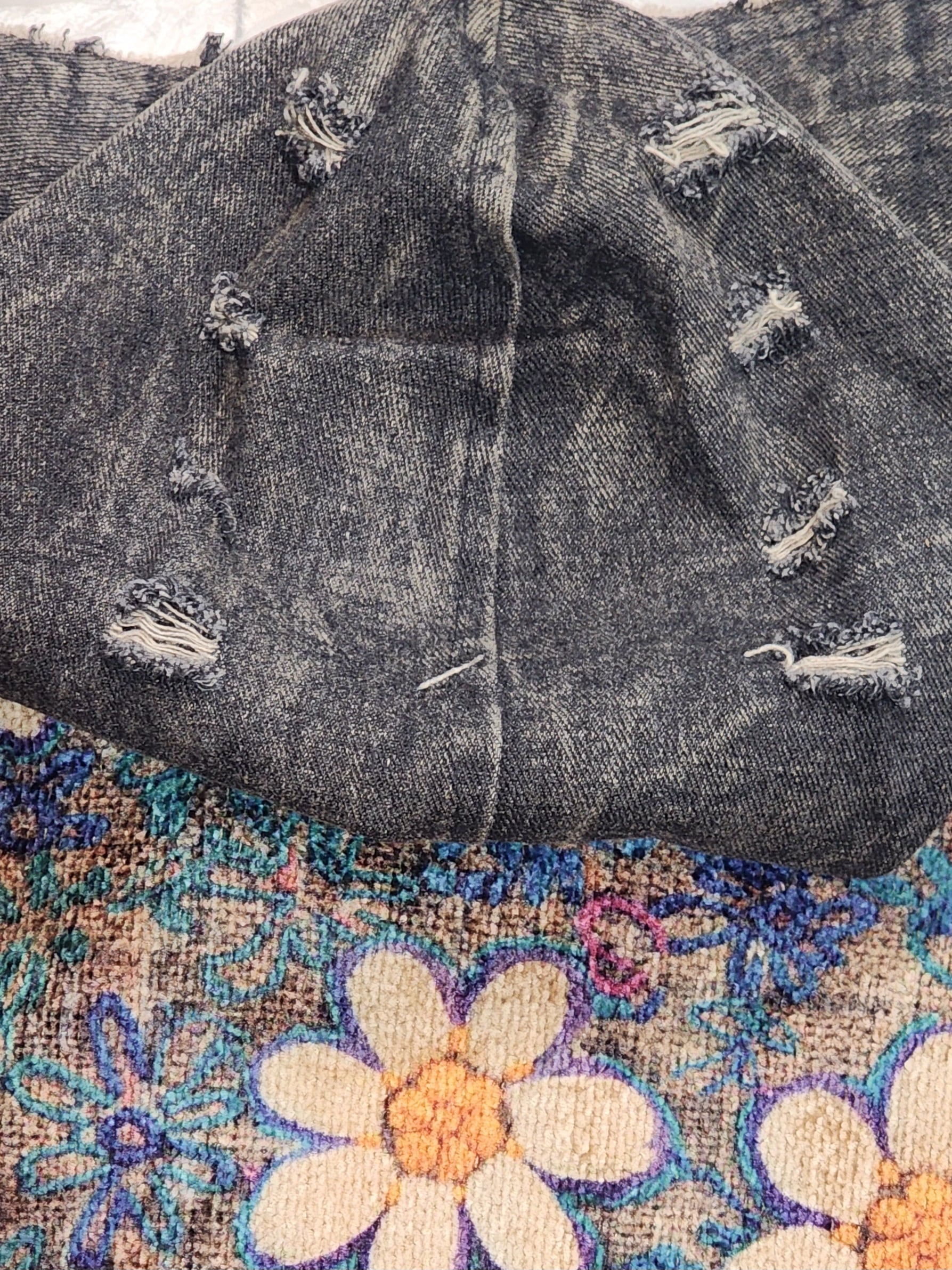 フードや袖をブラックデニム、身頃を花柄のプリントニットで切り替えています。