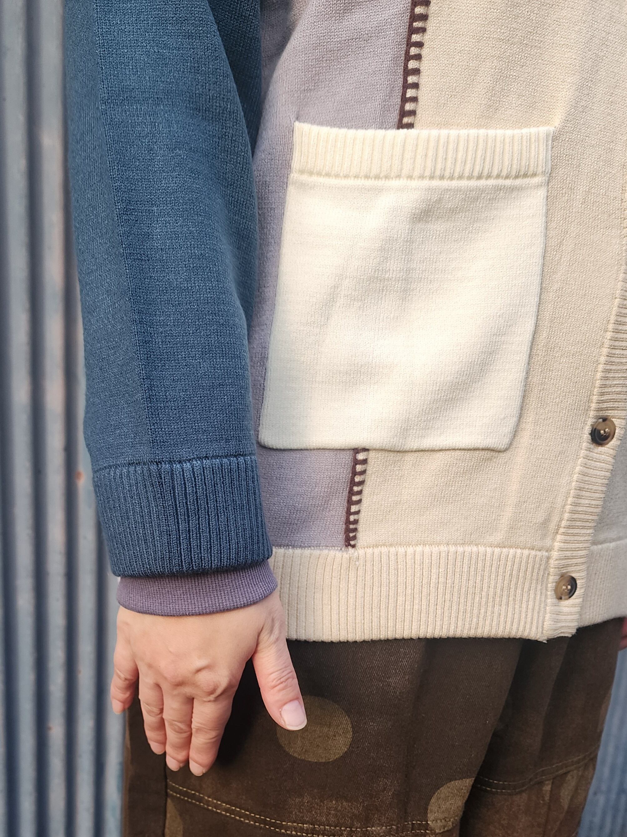 襟付きでアウター感のあるデザインが特徴的で、レトロな配色の組み合わせや手縫い風の配色ステッチが目を引きます。