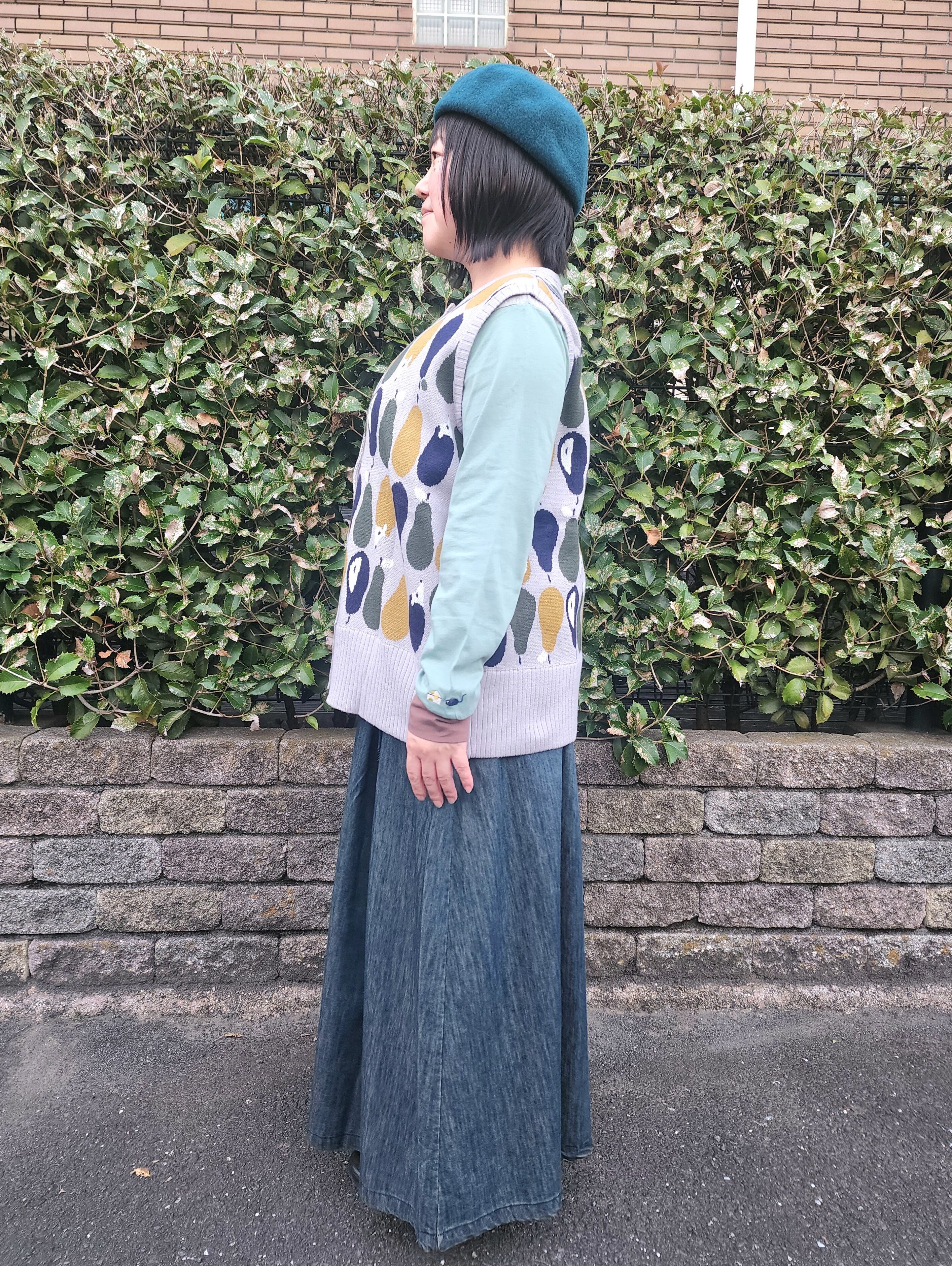 中にシャツやタートルネックを合わせたり、ワンピースに羽織ったりと色々着まわしを楽しめるアイテムです。