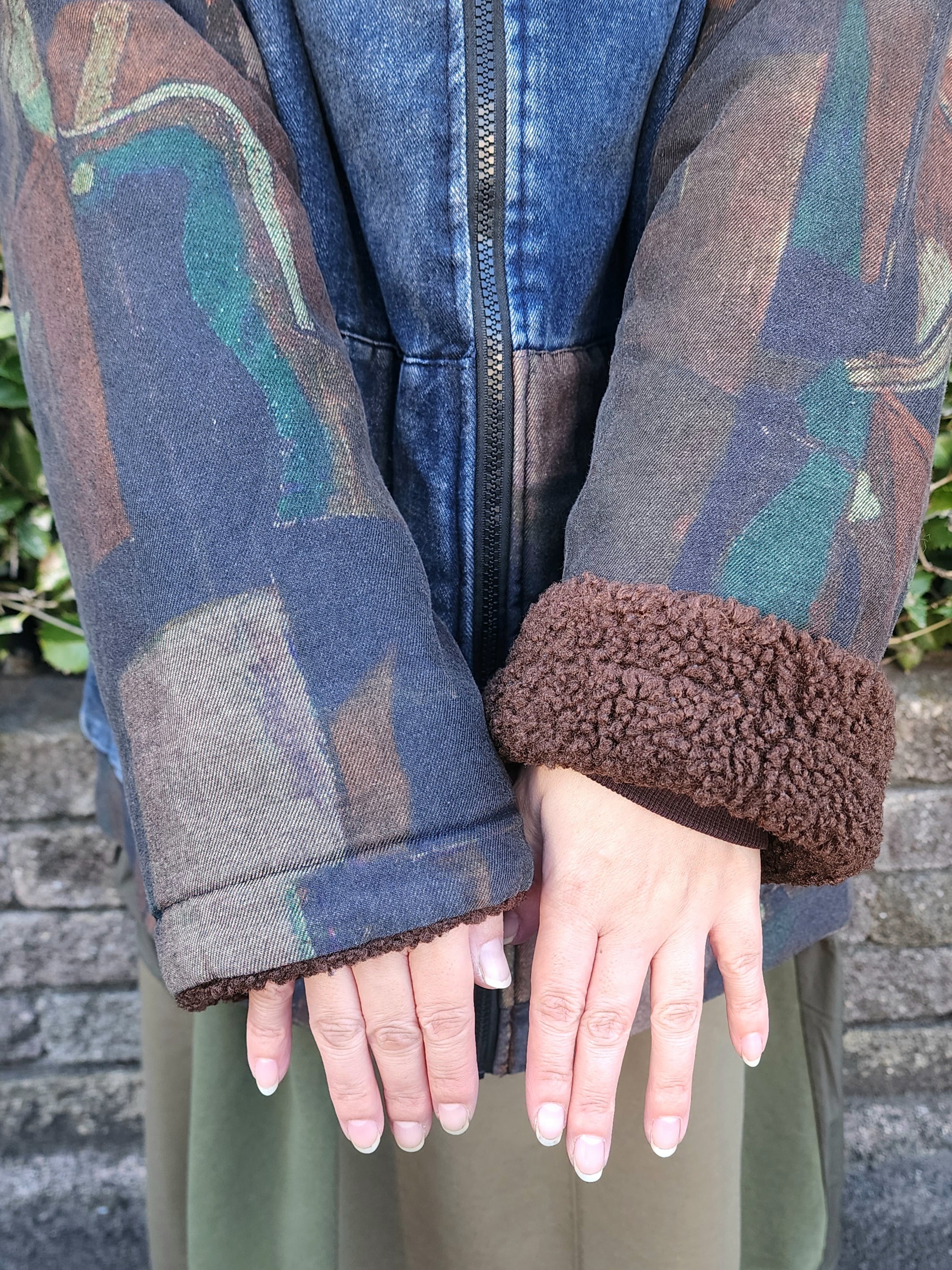 ブラウンを基調としたレトロな柄で切り替えたフード付きのデニムアウター。