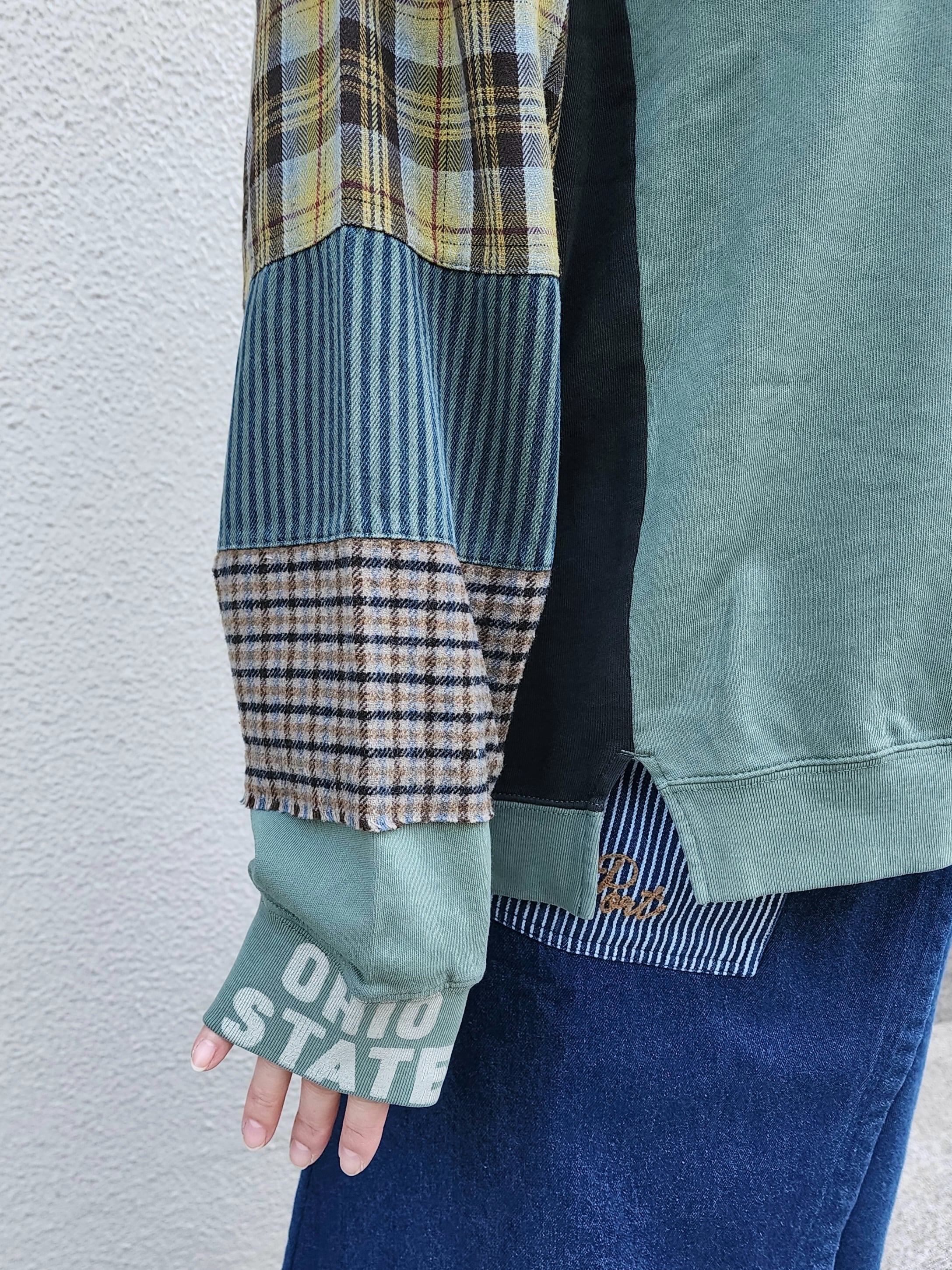 〈Lime.inc〉袖をチェックやストライプなど3種類の生地で切り替えた、ミニ裏毛のプルオーバー。