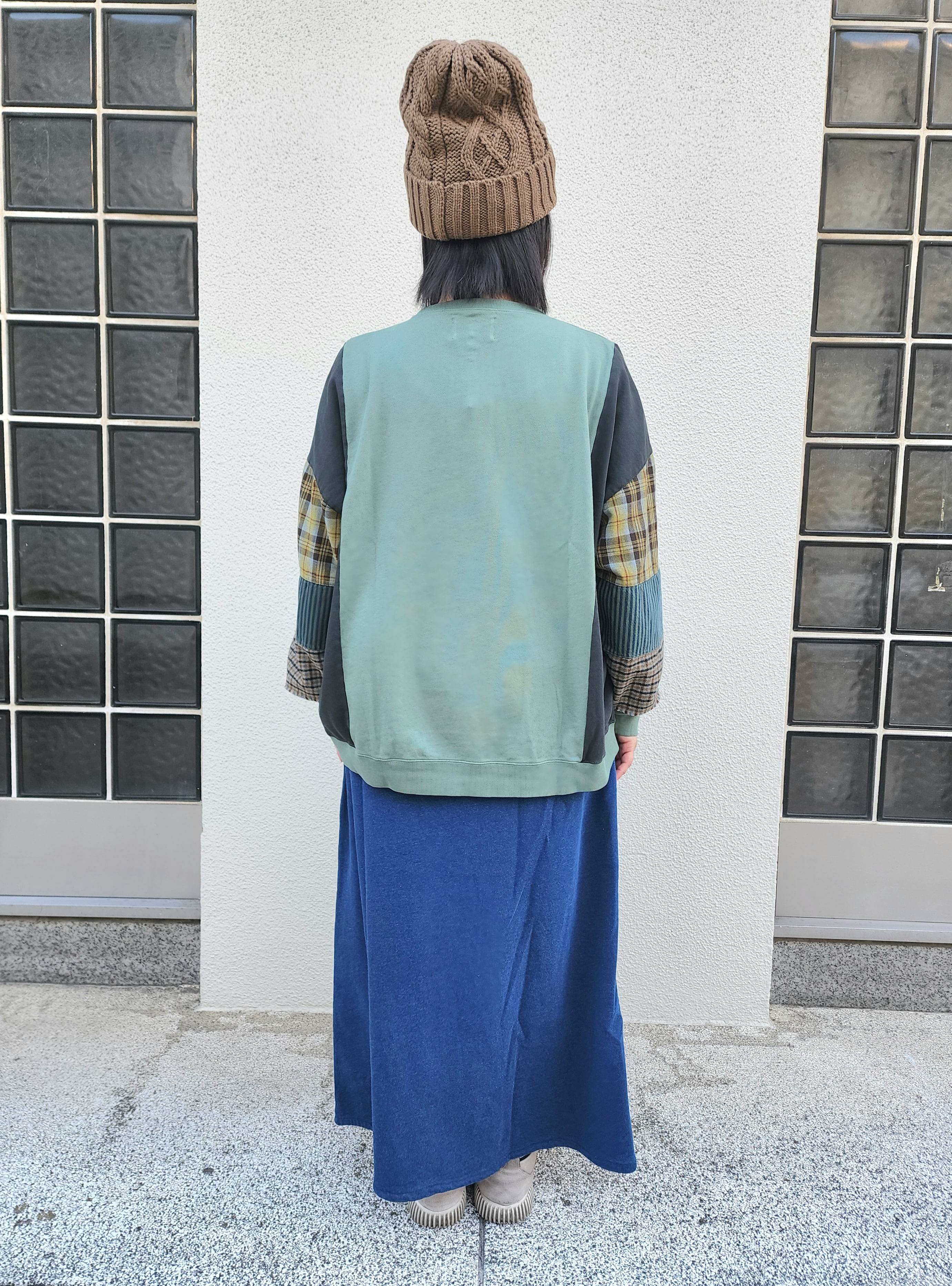 〈Lime.inc〉裏毛のカットスカートに布帛生地を組み合わせた巻きスカート風仕立て。