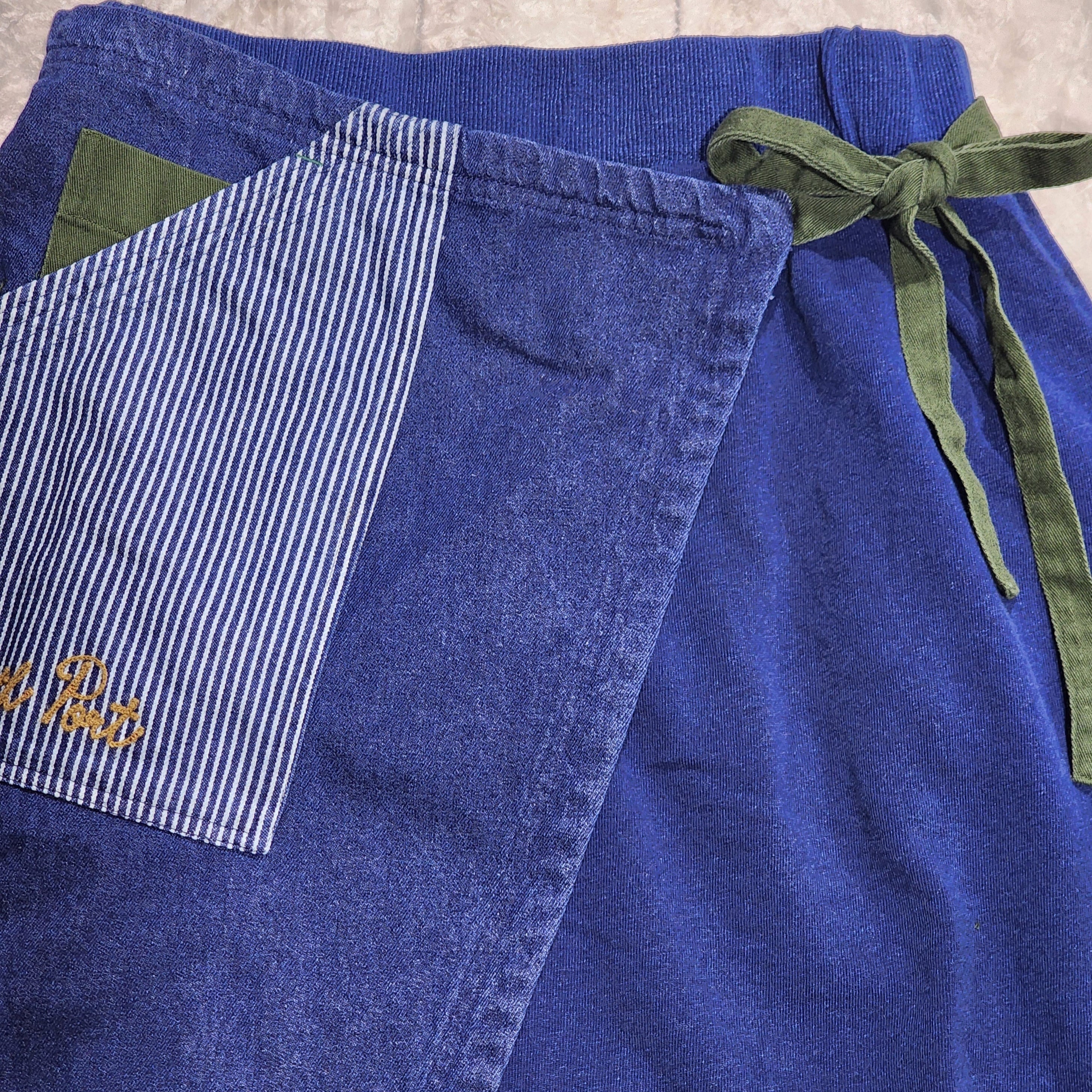 巻きスカート風についたポケット付きの布帛生地部分は本体とリボンで結ぶ仕様になっています。