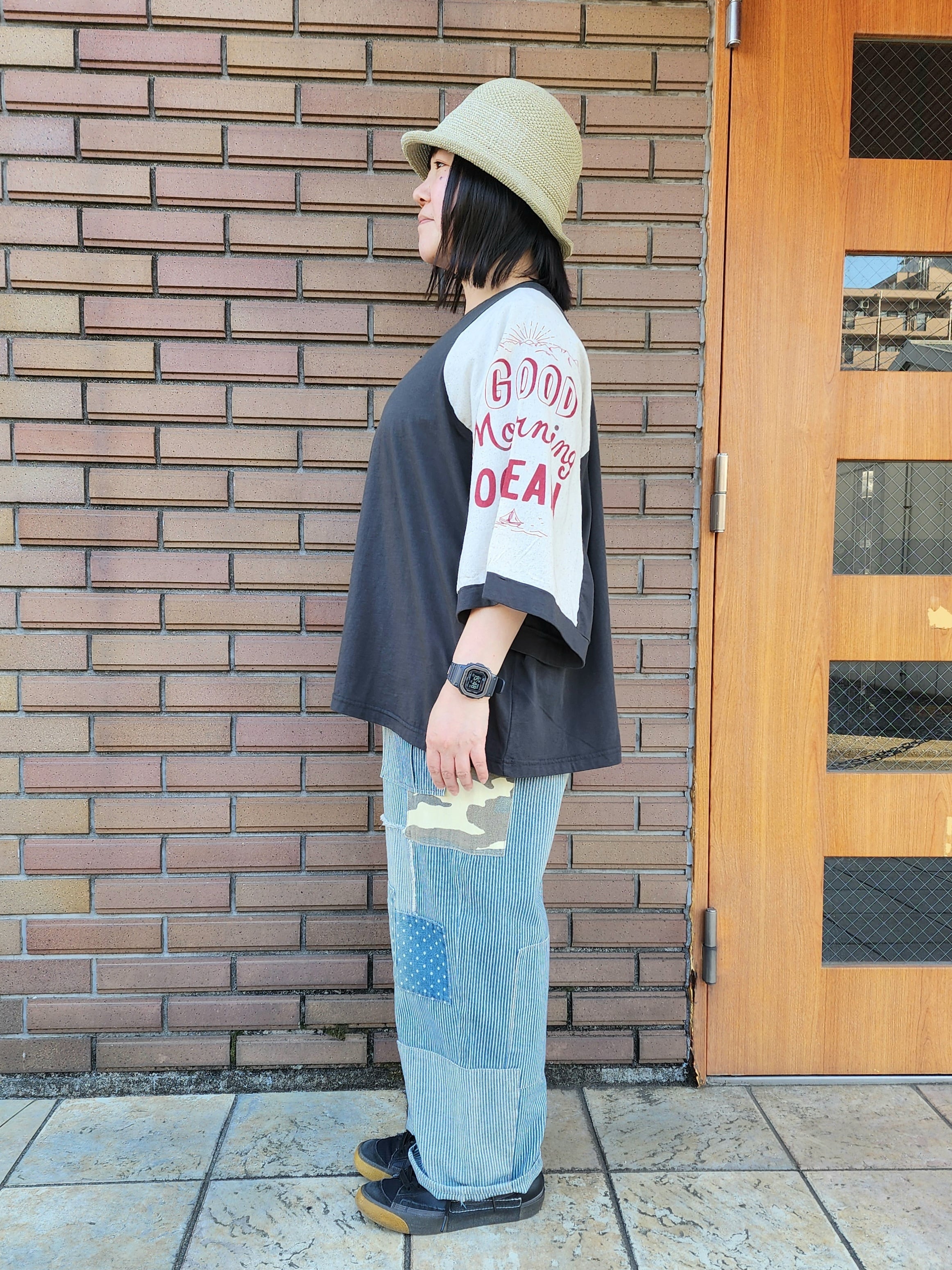 切りっぱなしデニムやドット柄に迷彩柄など様々なパッチワークやポッケが付いた贅沢な1枚。