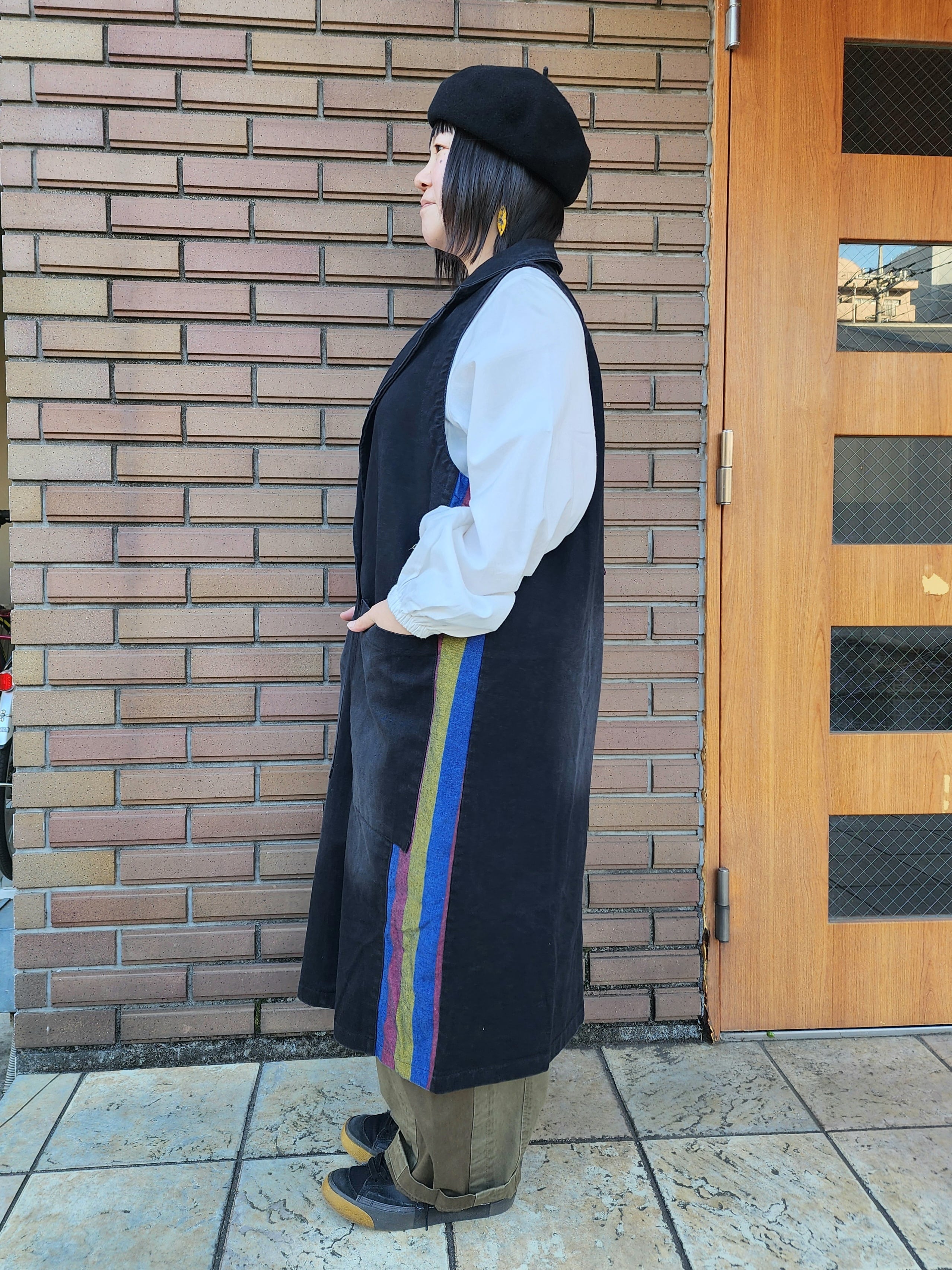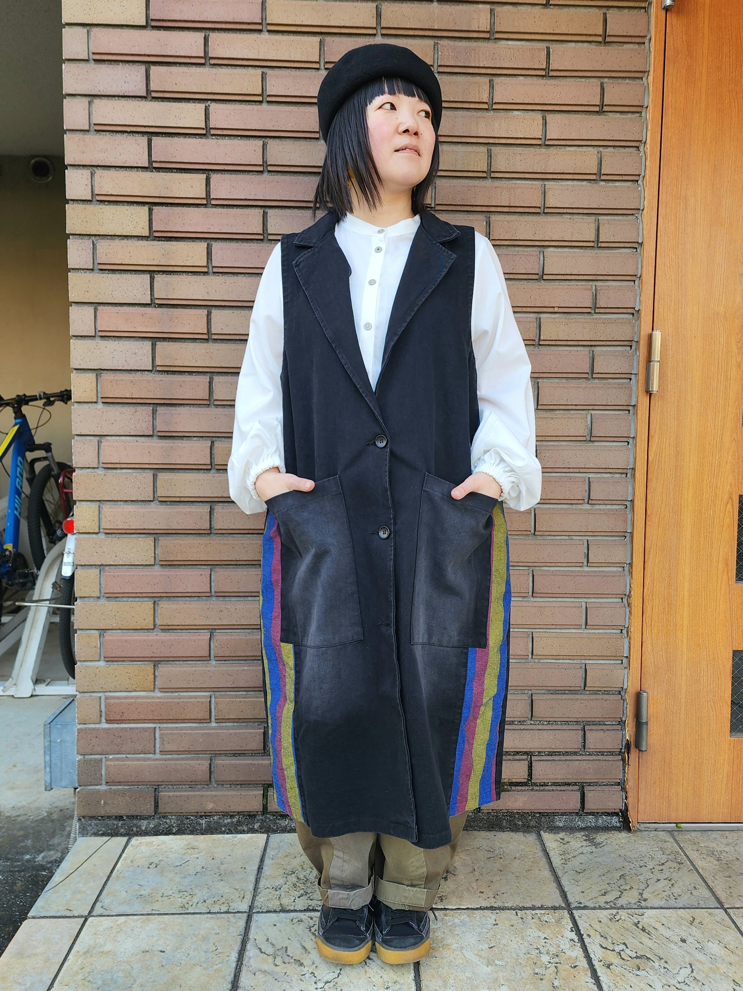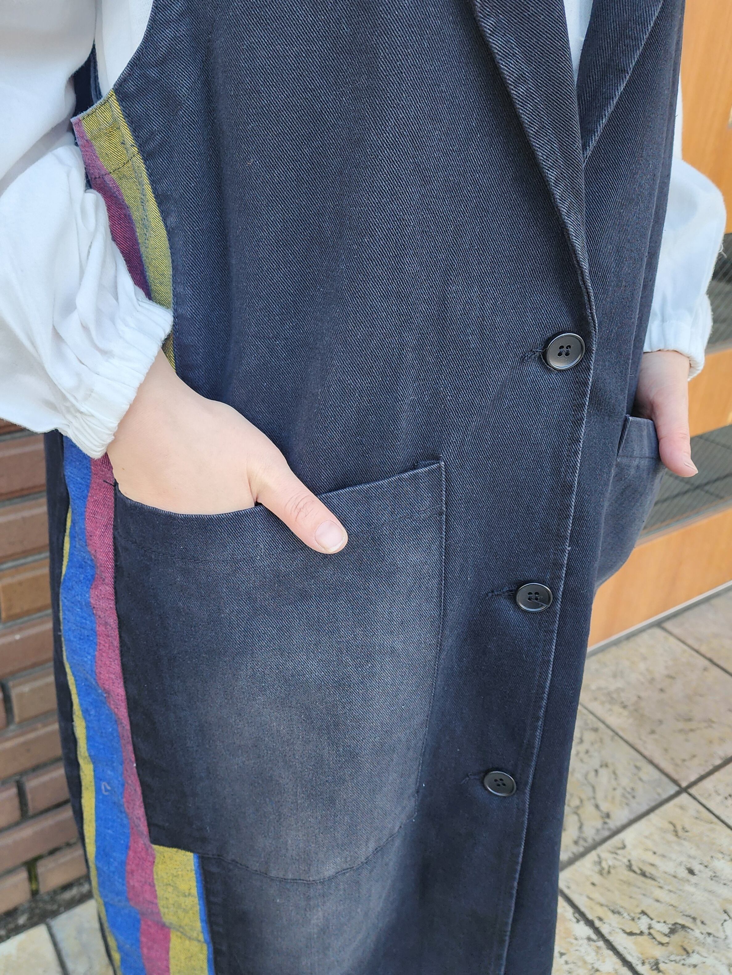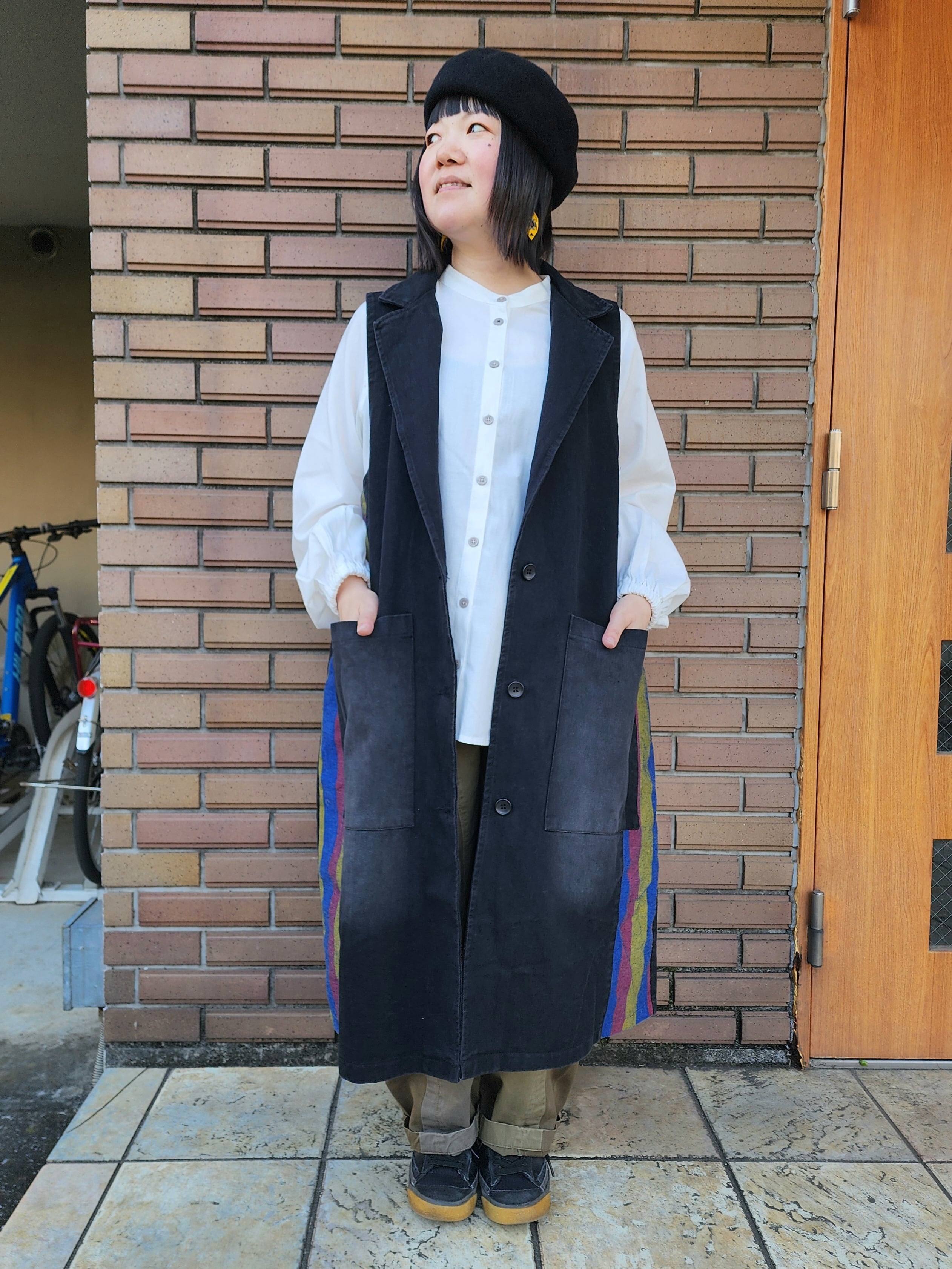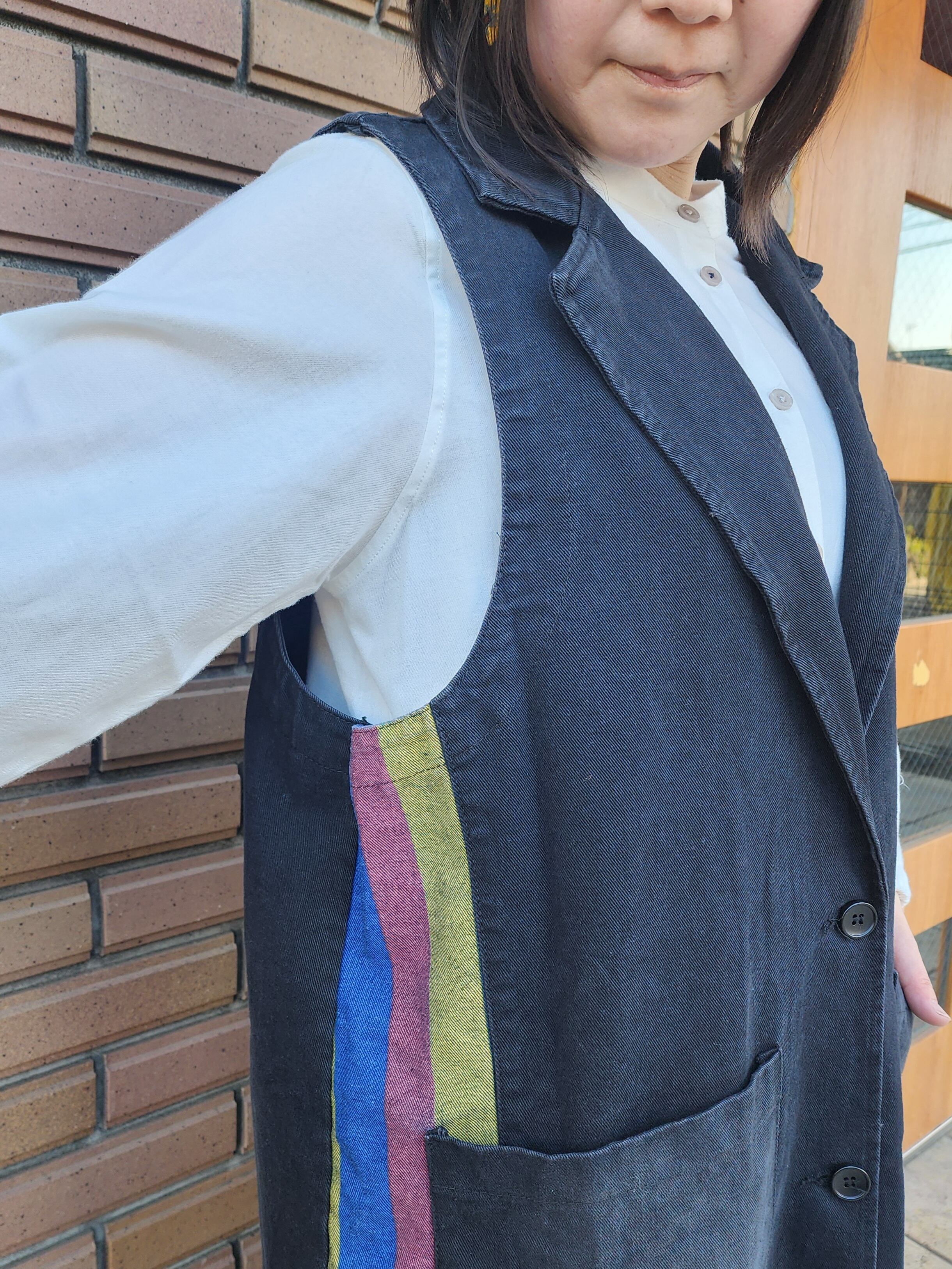 テーラードカラーがポイントのロングタイプのベスト。