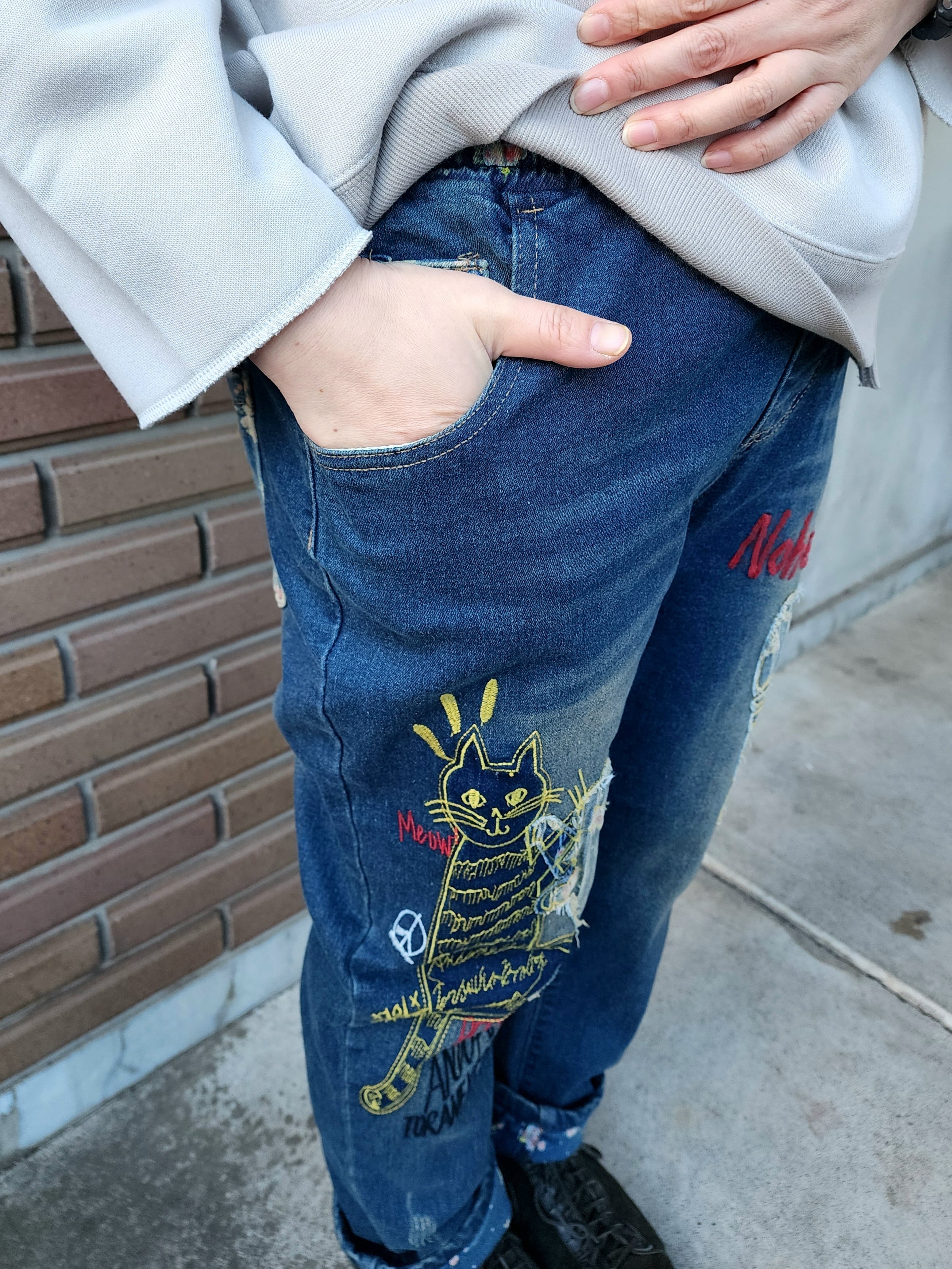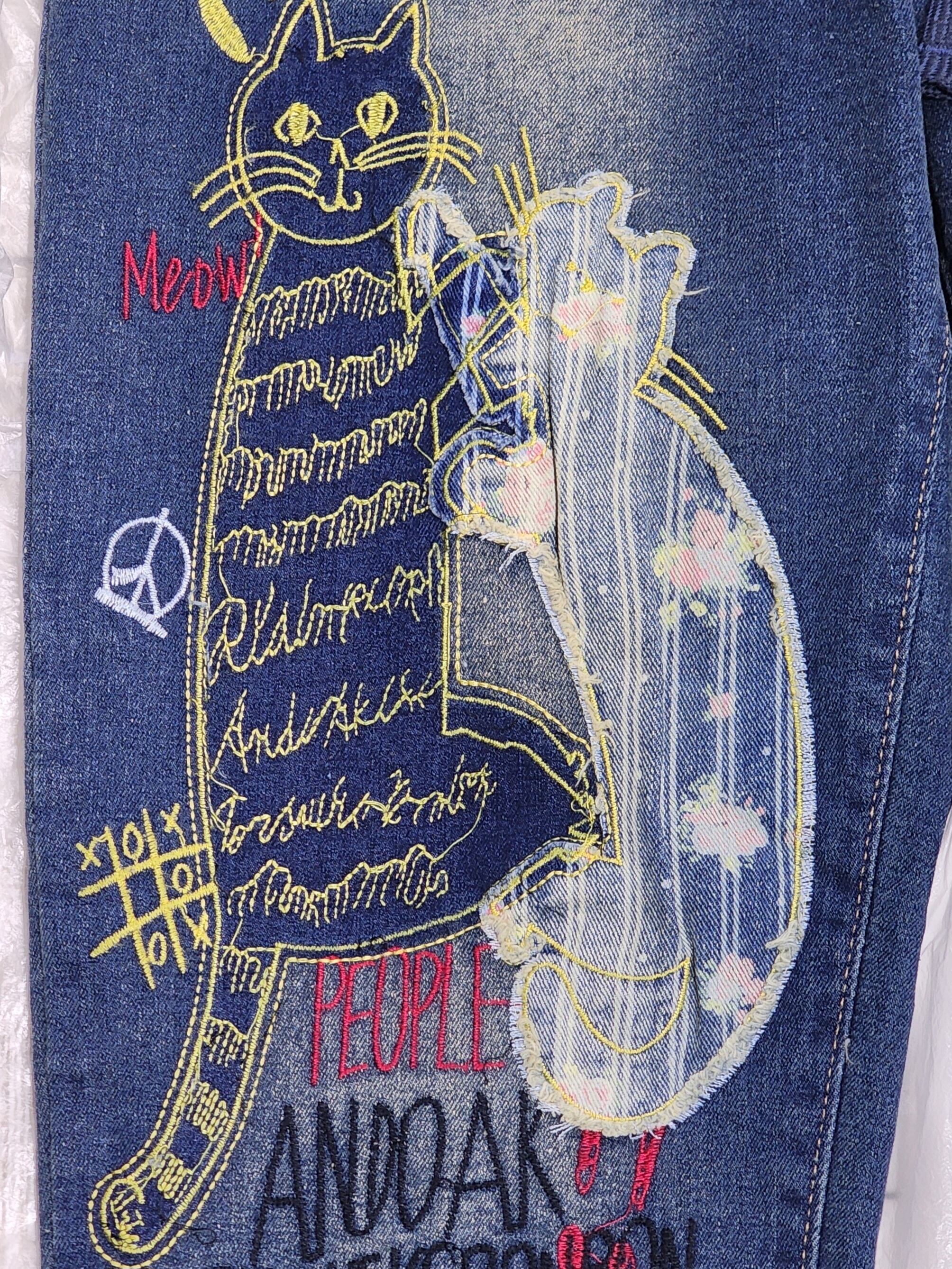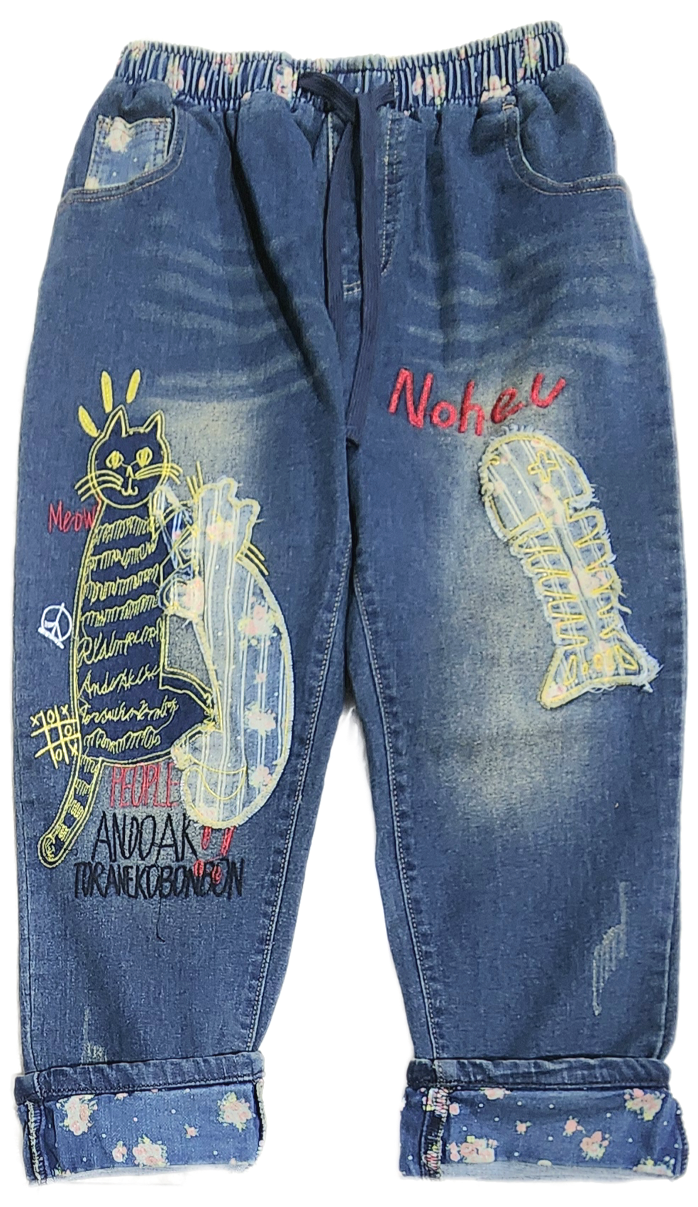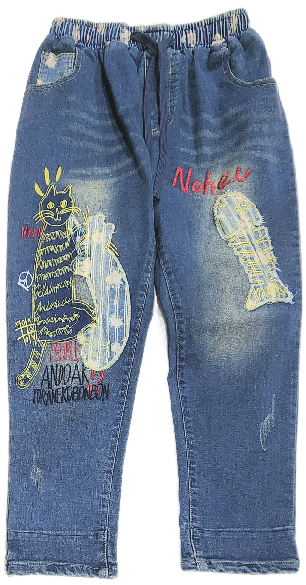 猫と魚刺繍のストレッチデニムパンツ