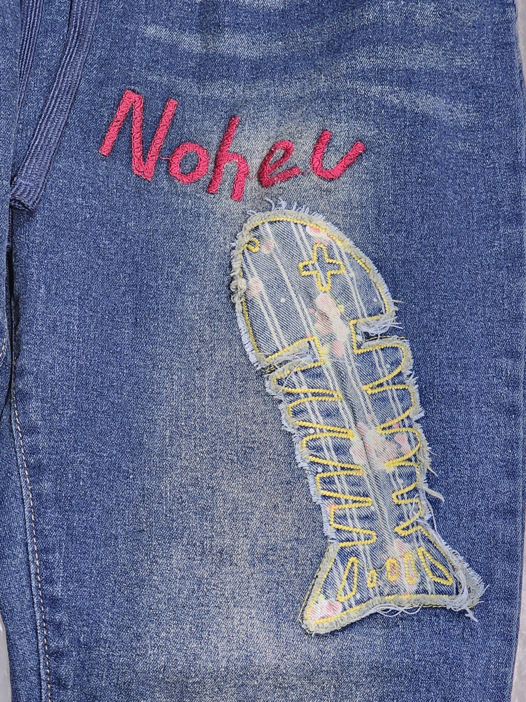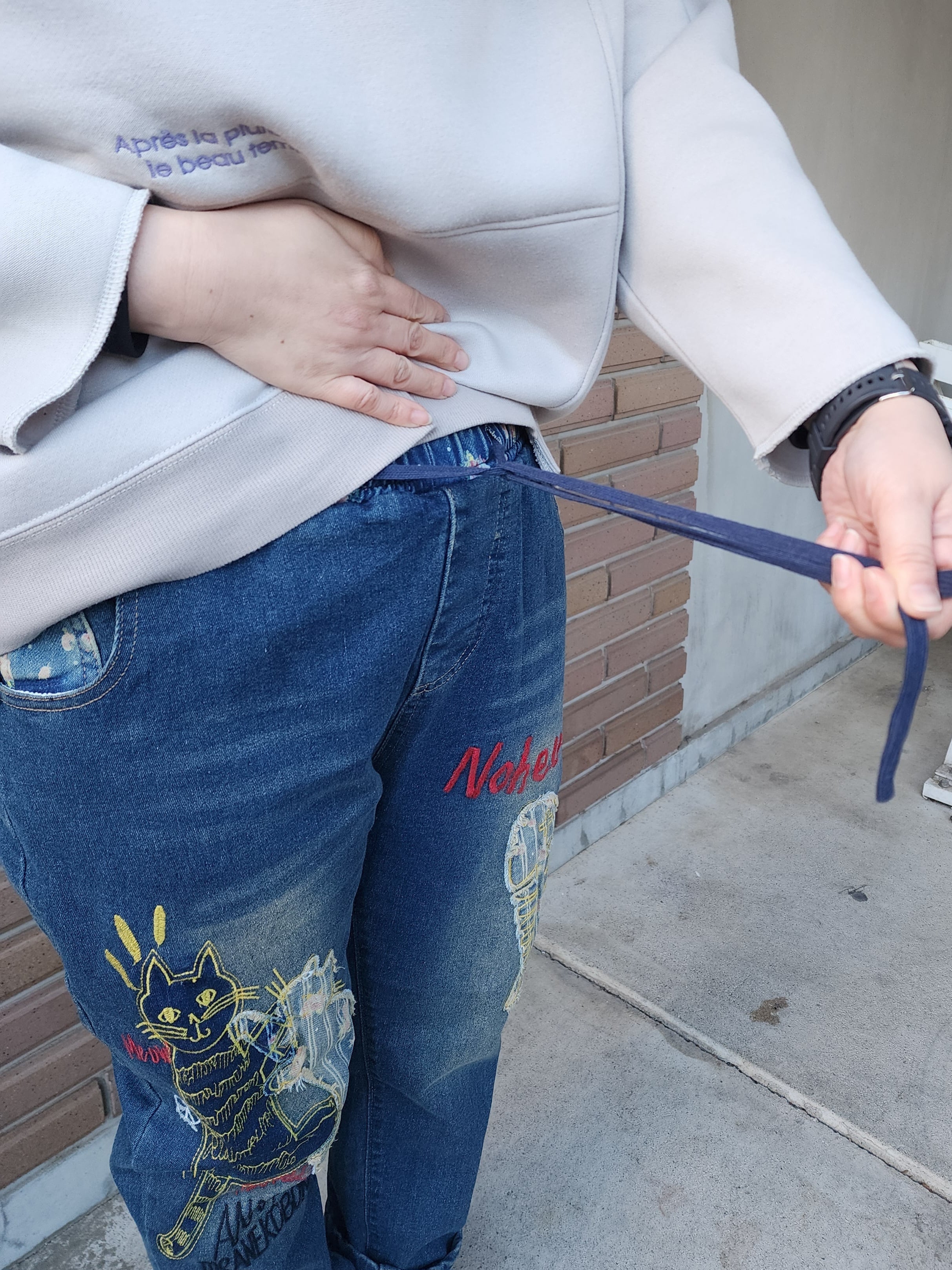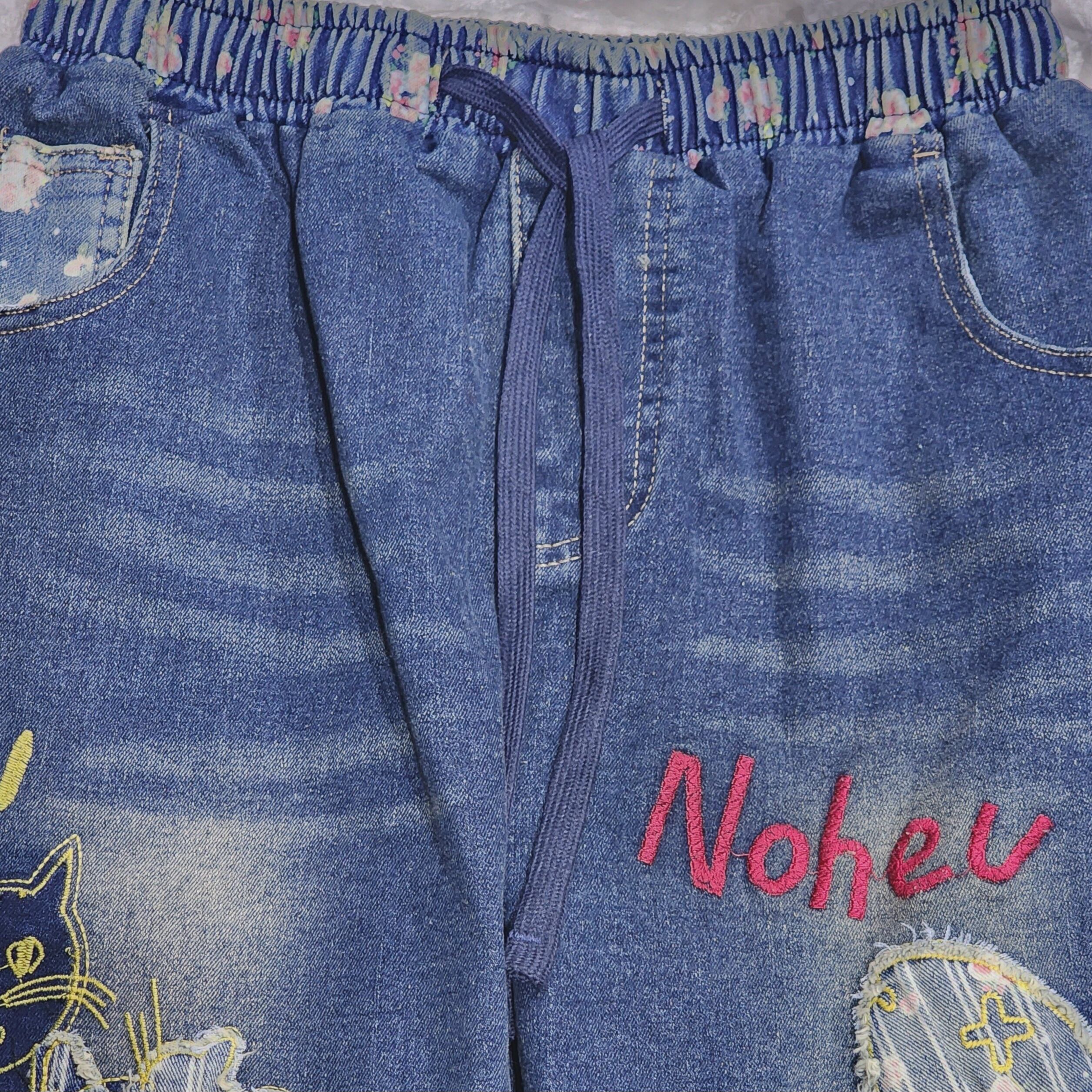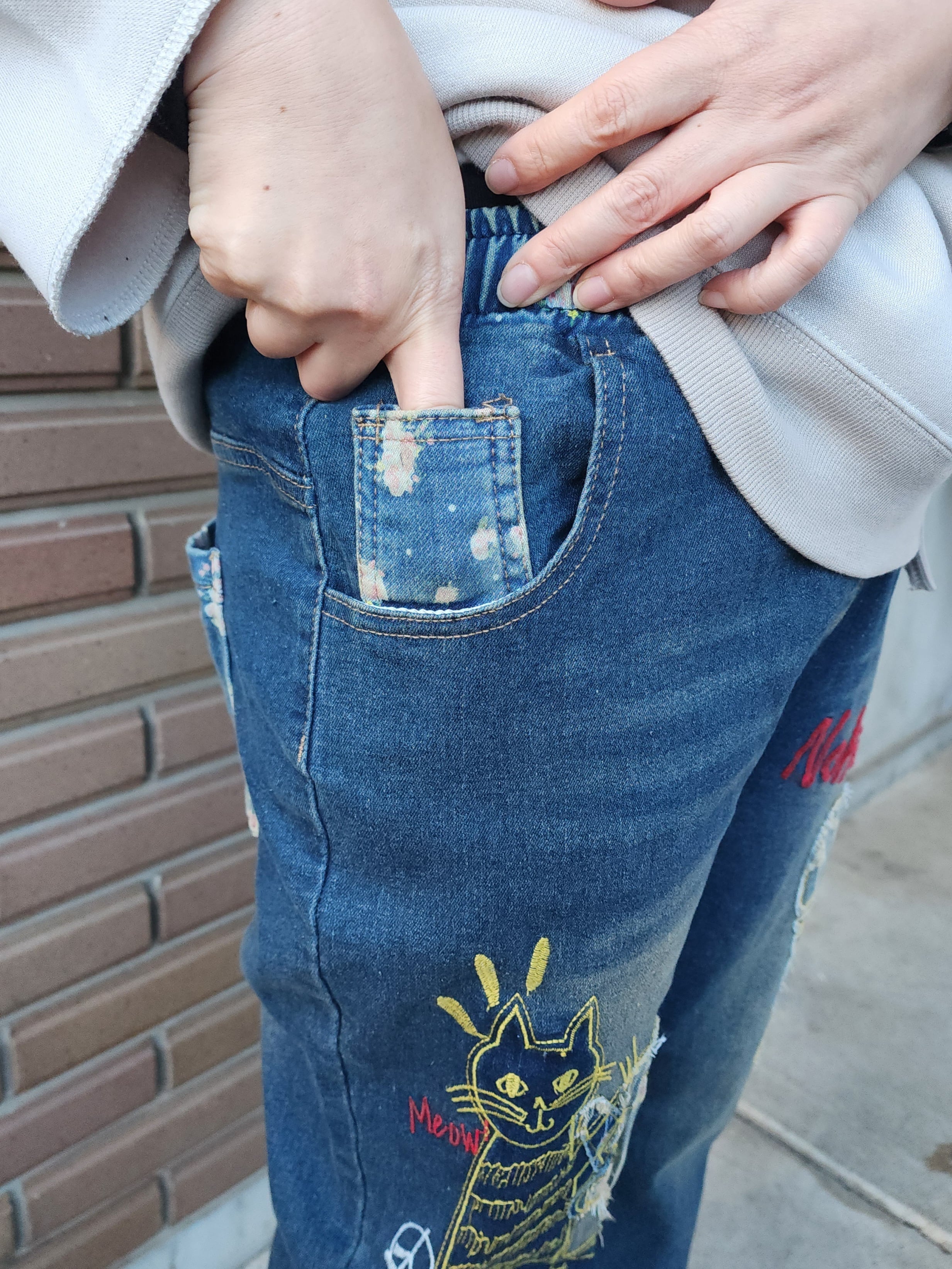 猫と魚刺繍のストレッチデニムパンツ