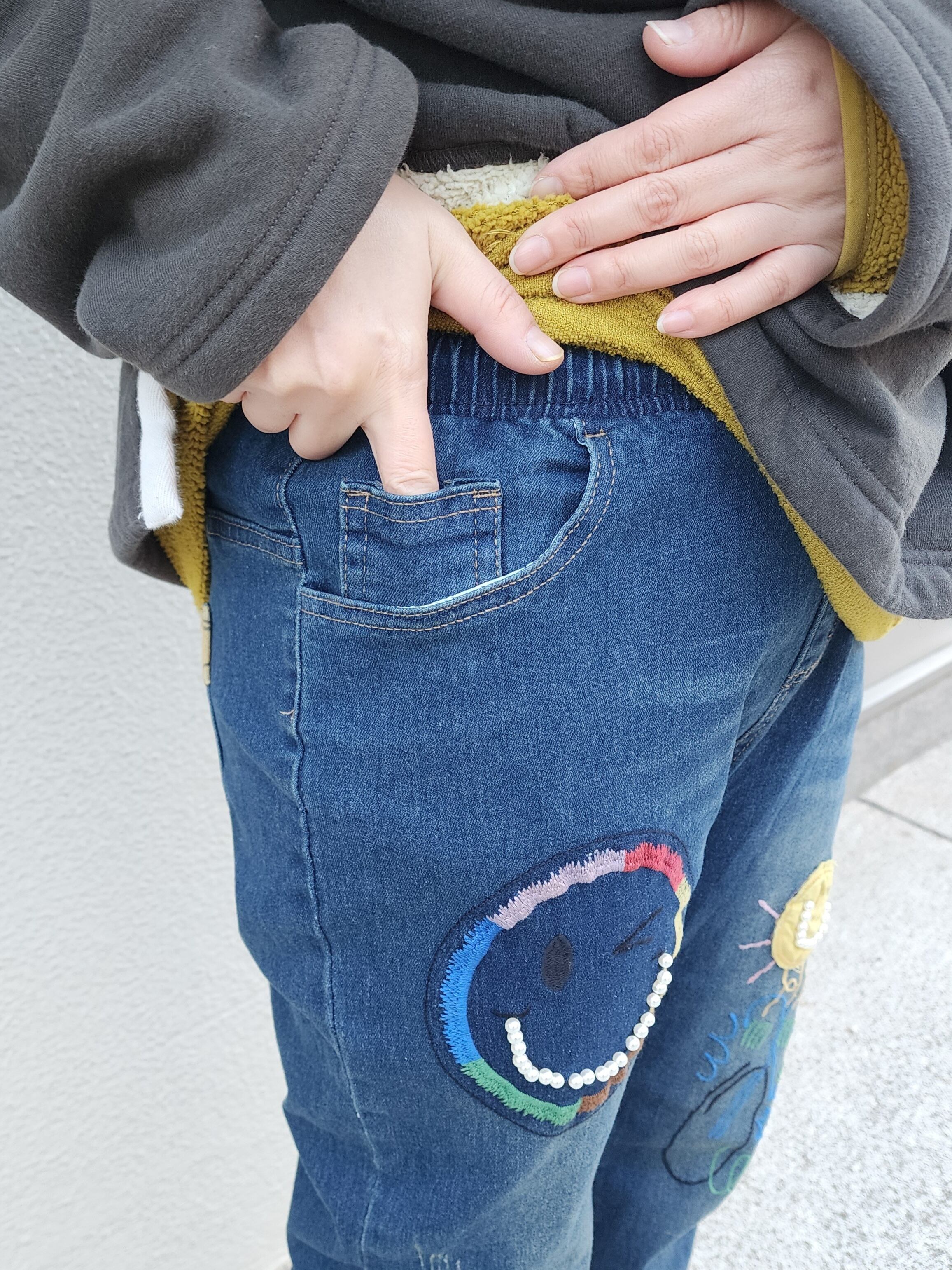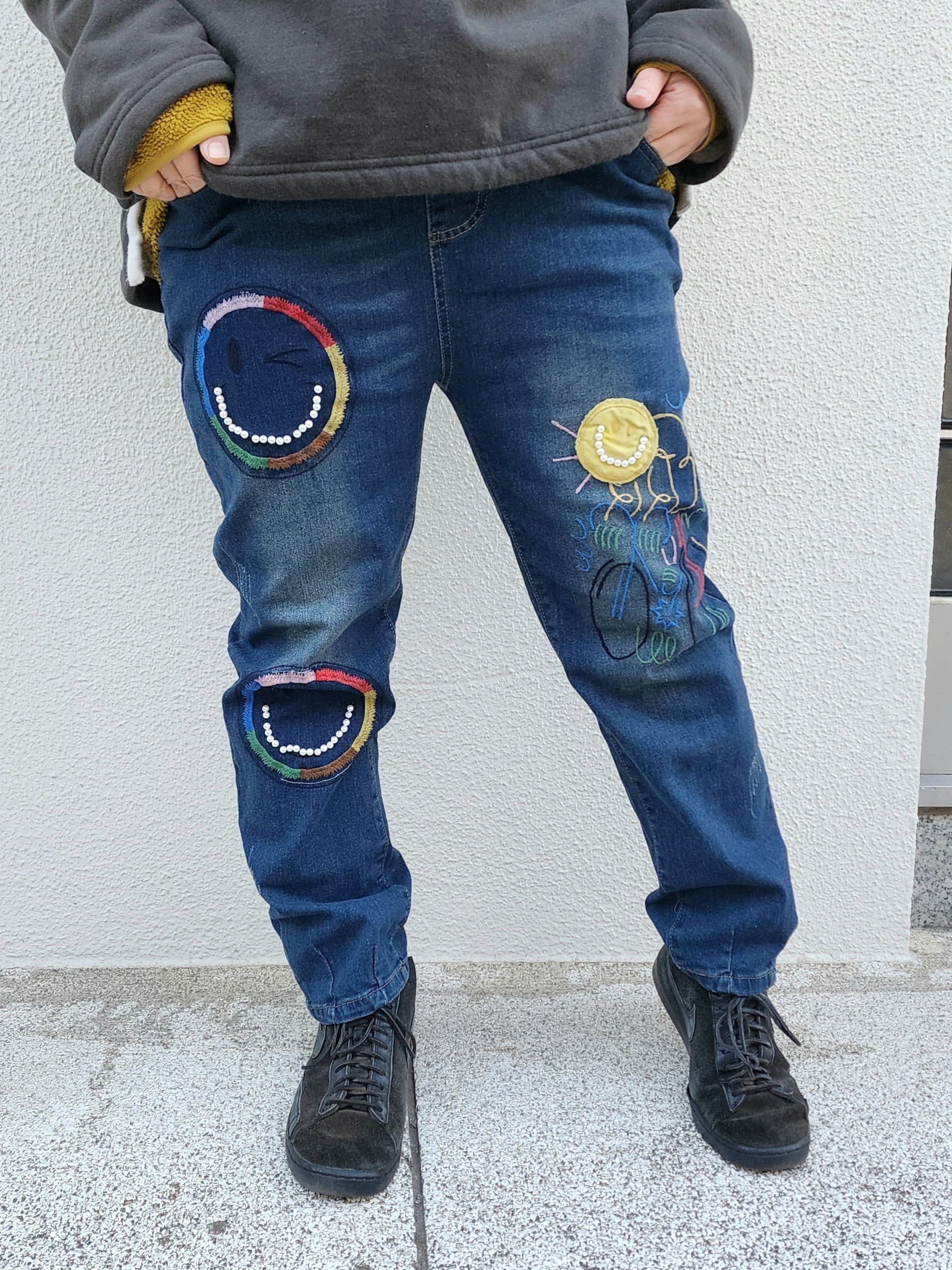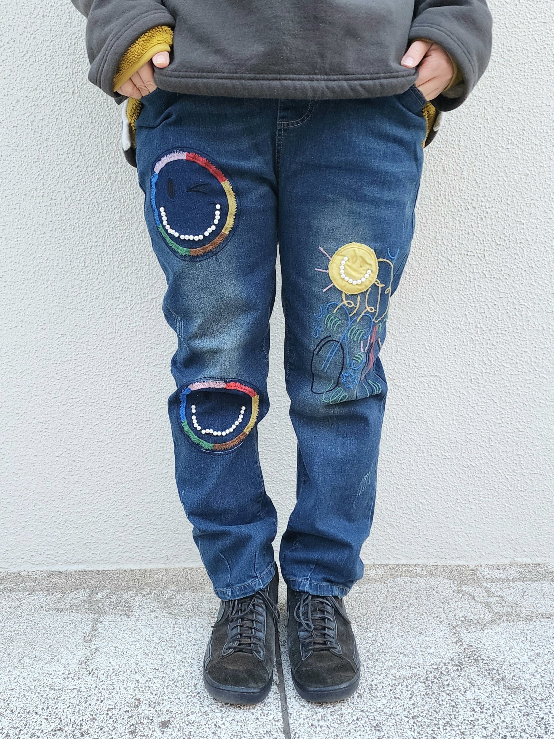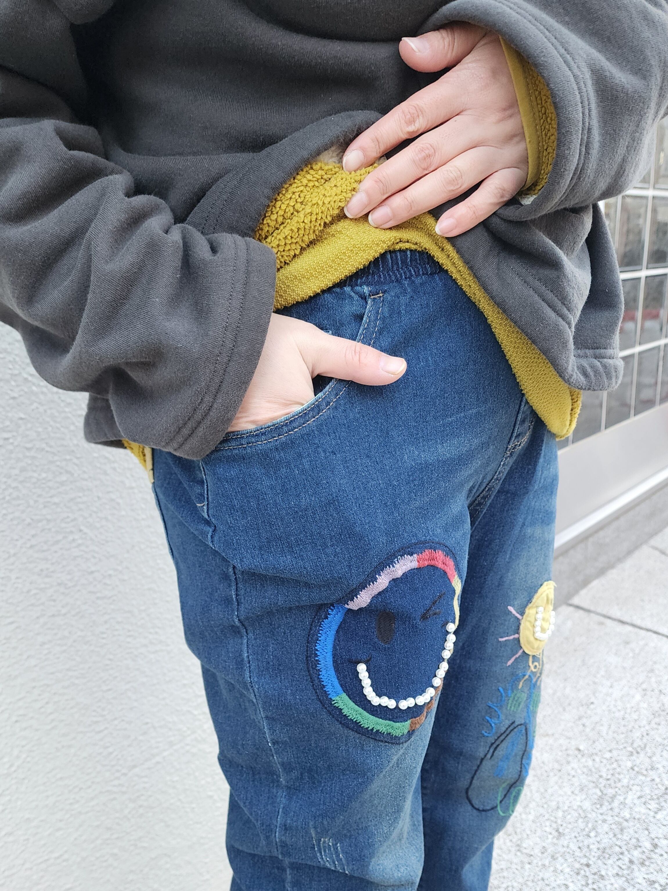 デニムのブルーにカラフルな刺繍がよく映えた、人気モチーフのスマイル刺繍入りデニムパンツ。