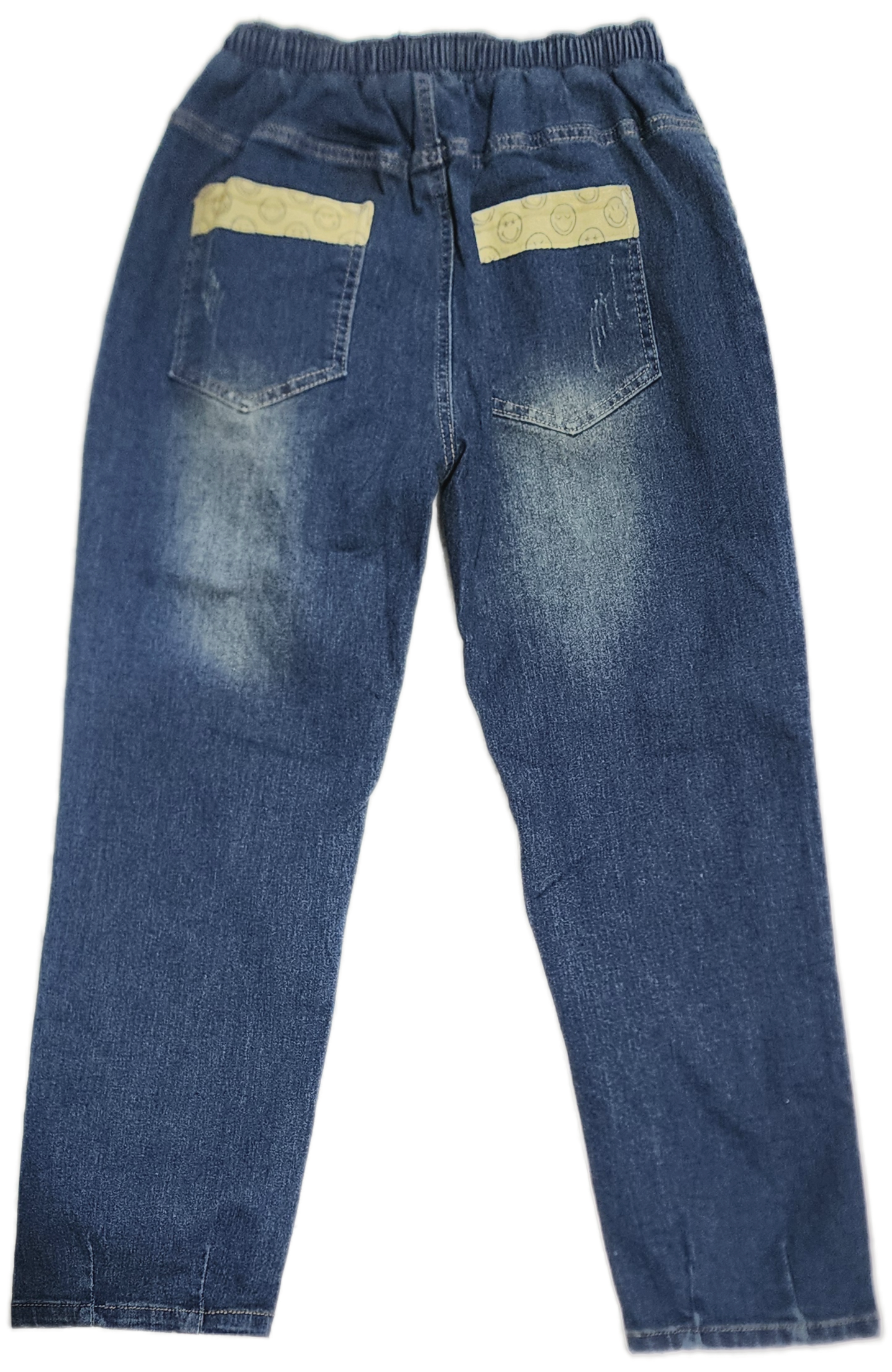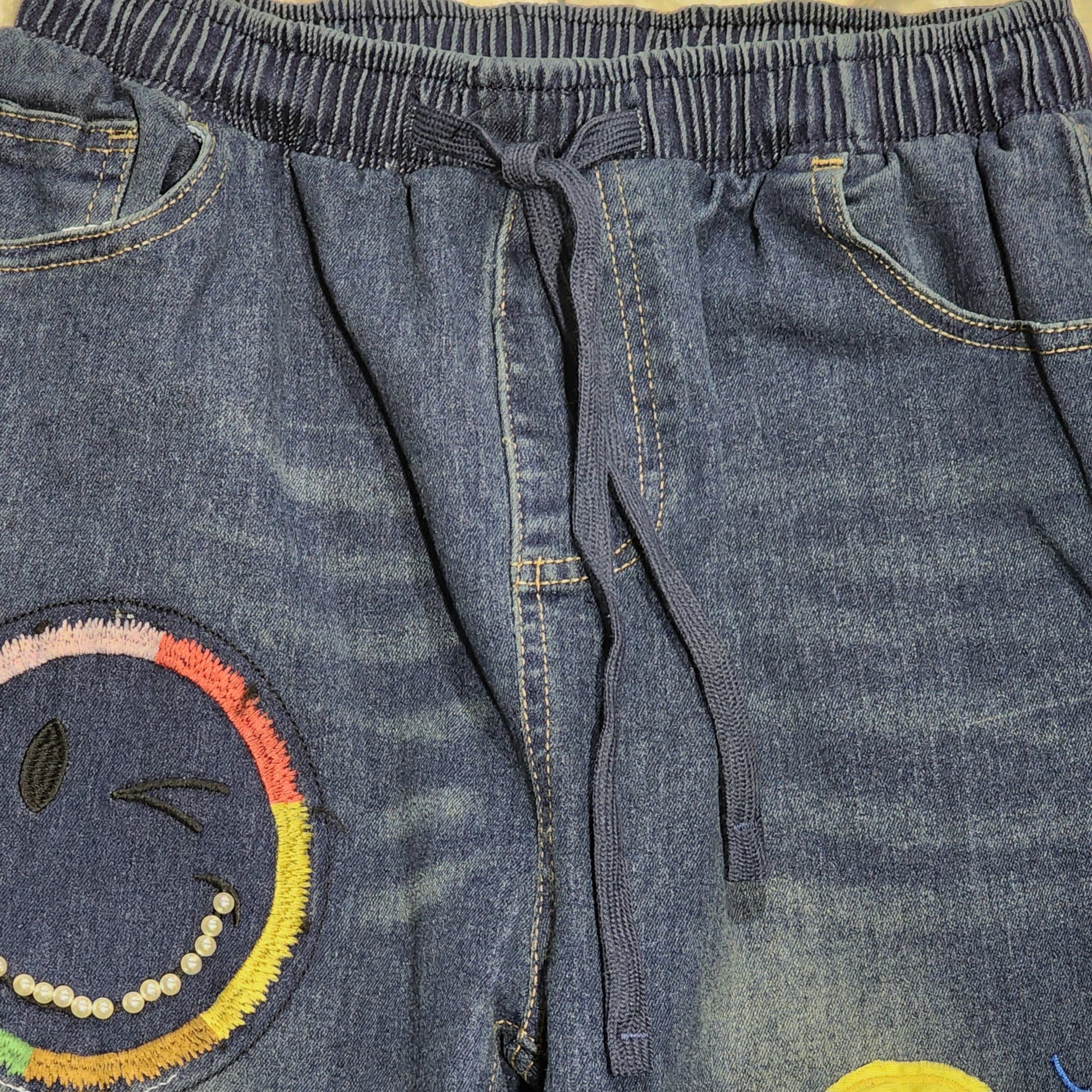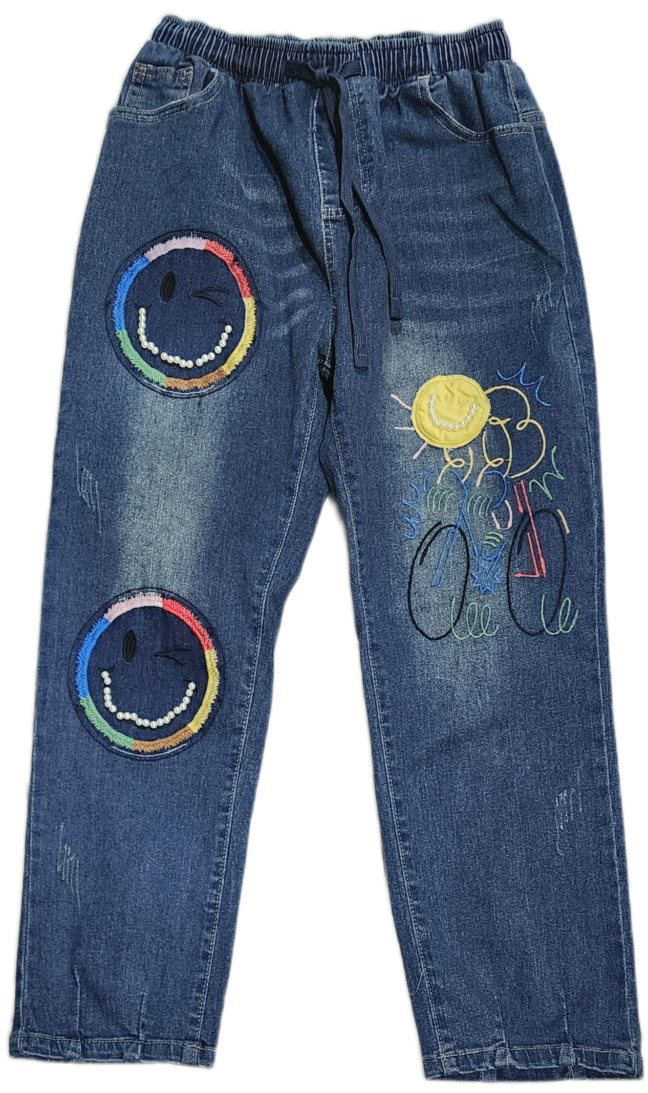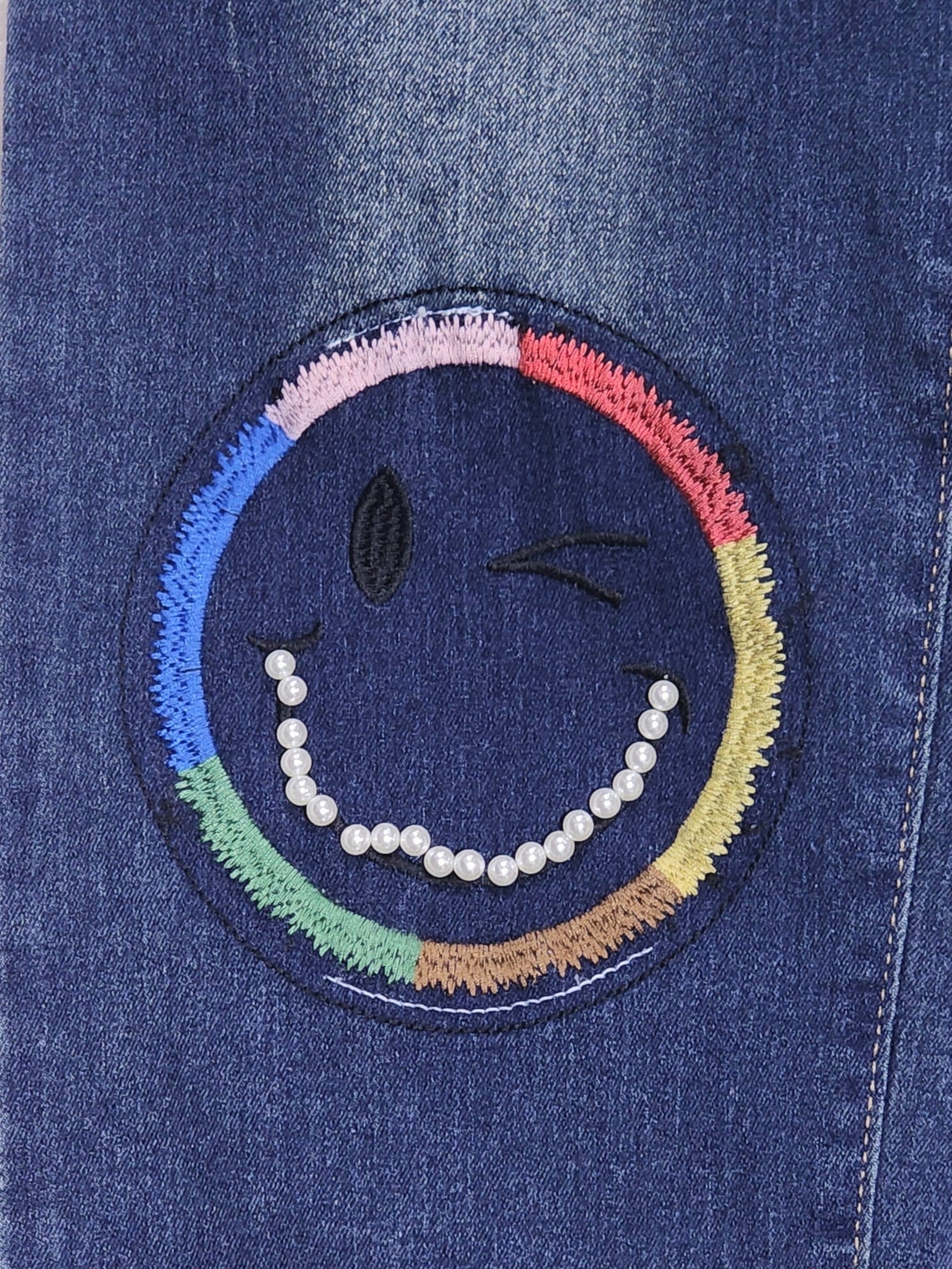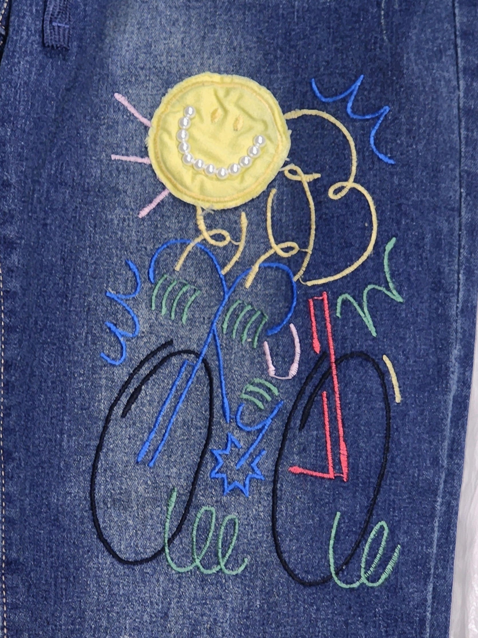 デニムのブルーにカラフルな刺繍がよく映えた、人気モチーフのスマイル刺繍入りデニムパンツ。