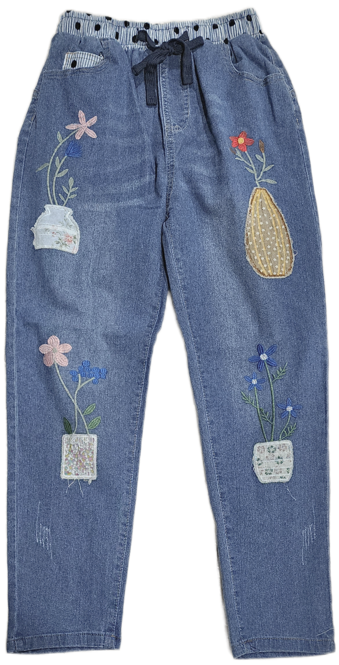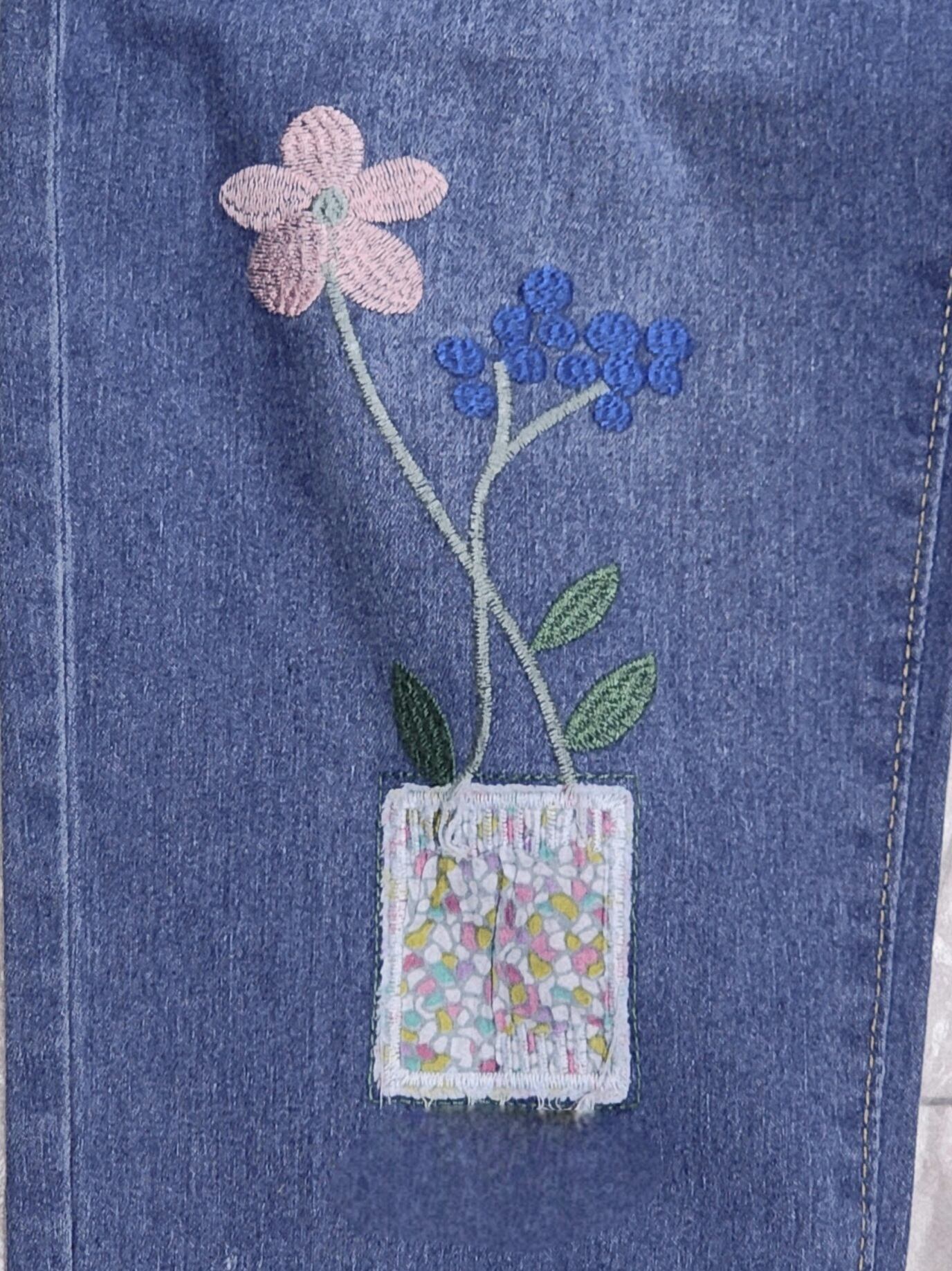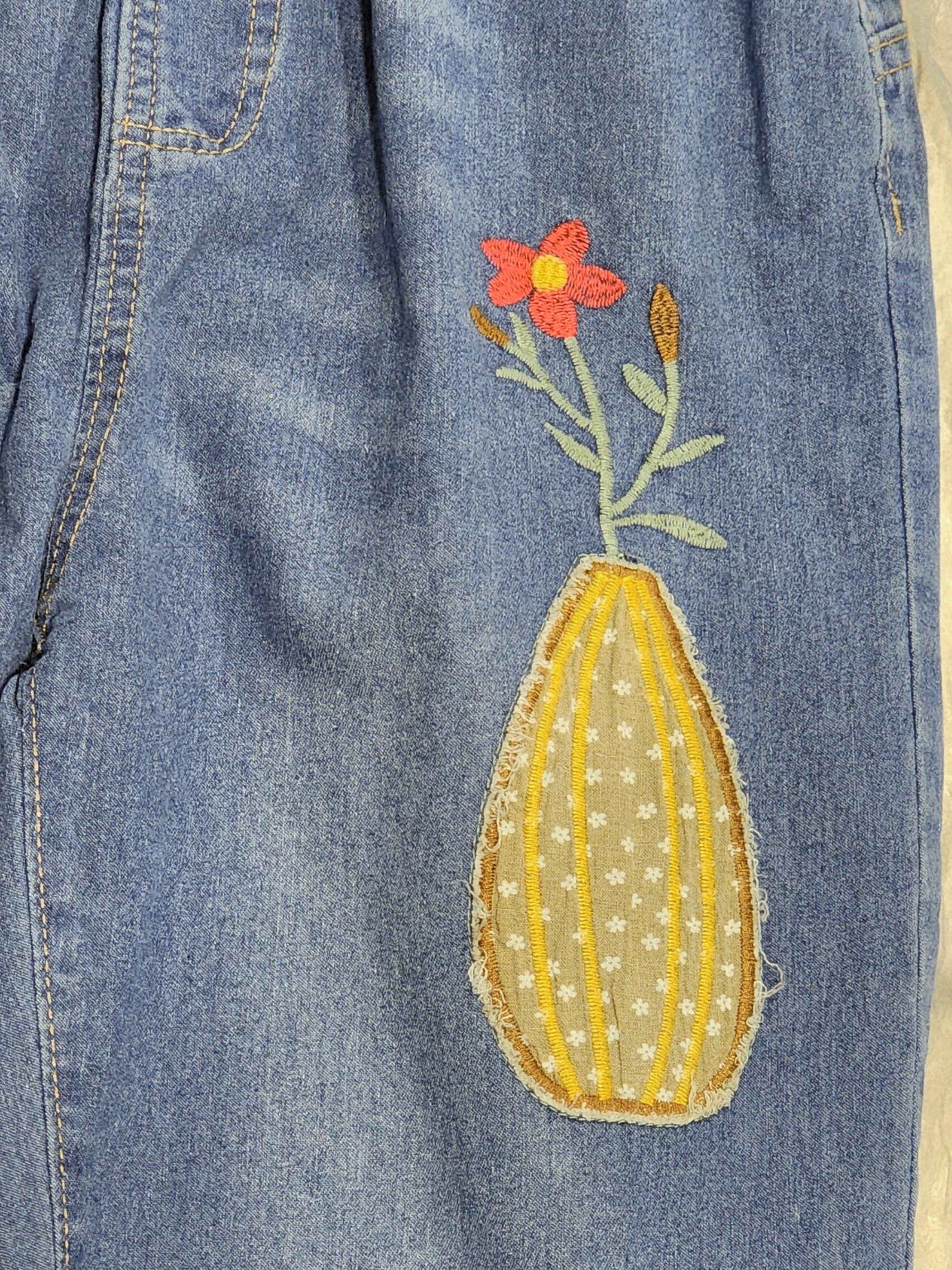 ちょっぴり素朴でほっこりかわいい、お花と花瓶刺繍のデニム。