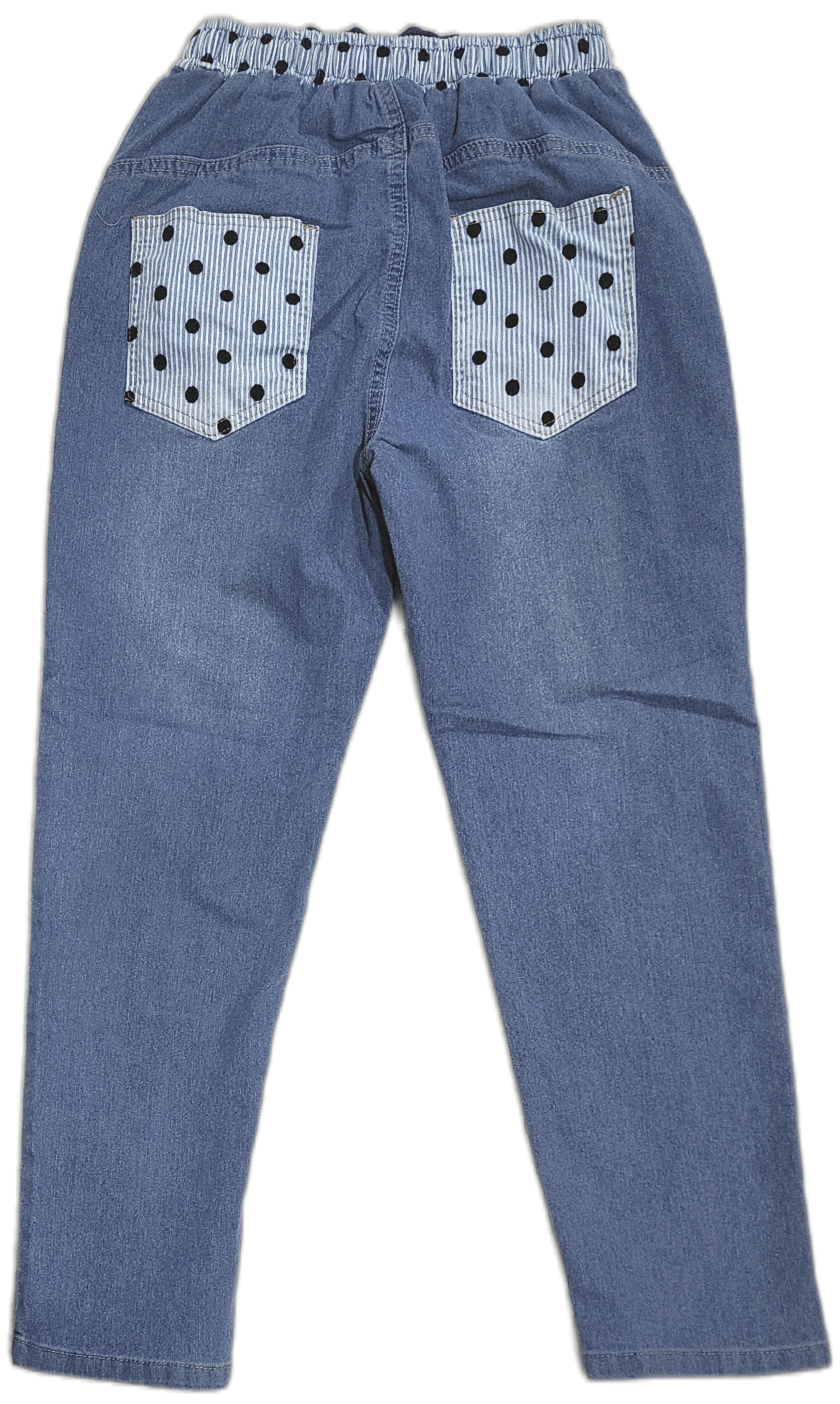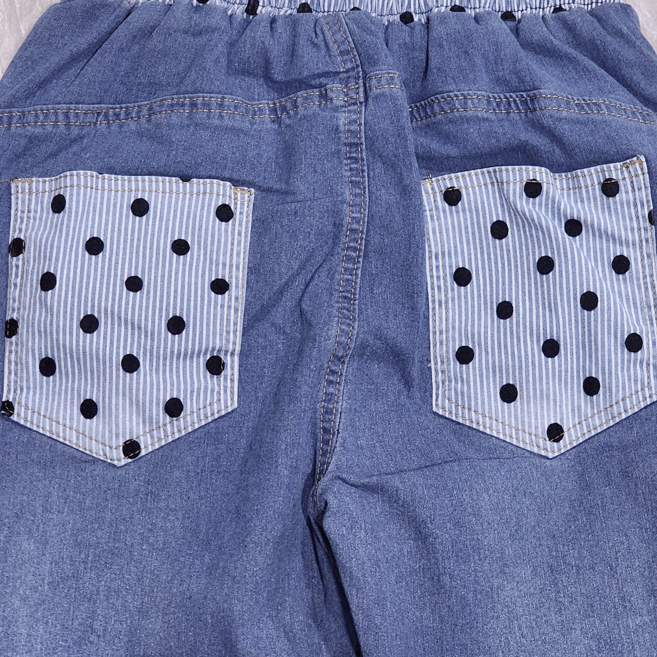 ウエストや後ろポッケはフロッキードットプリントのヒッコリー生地で切り替えています。