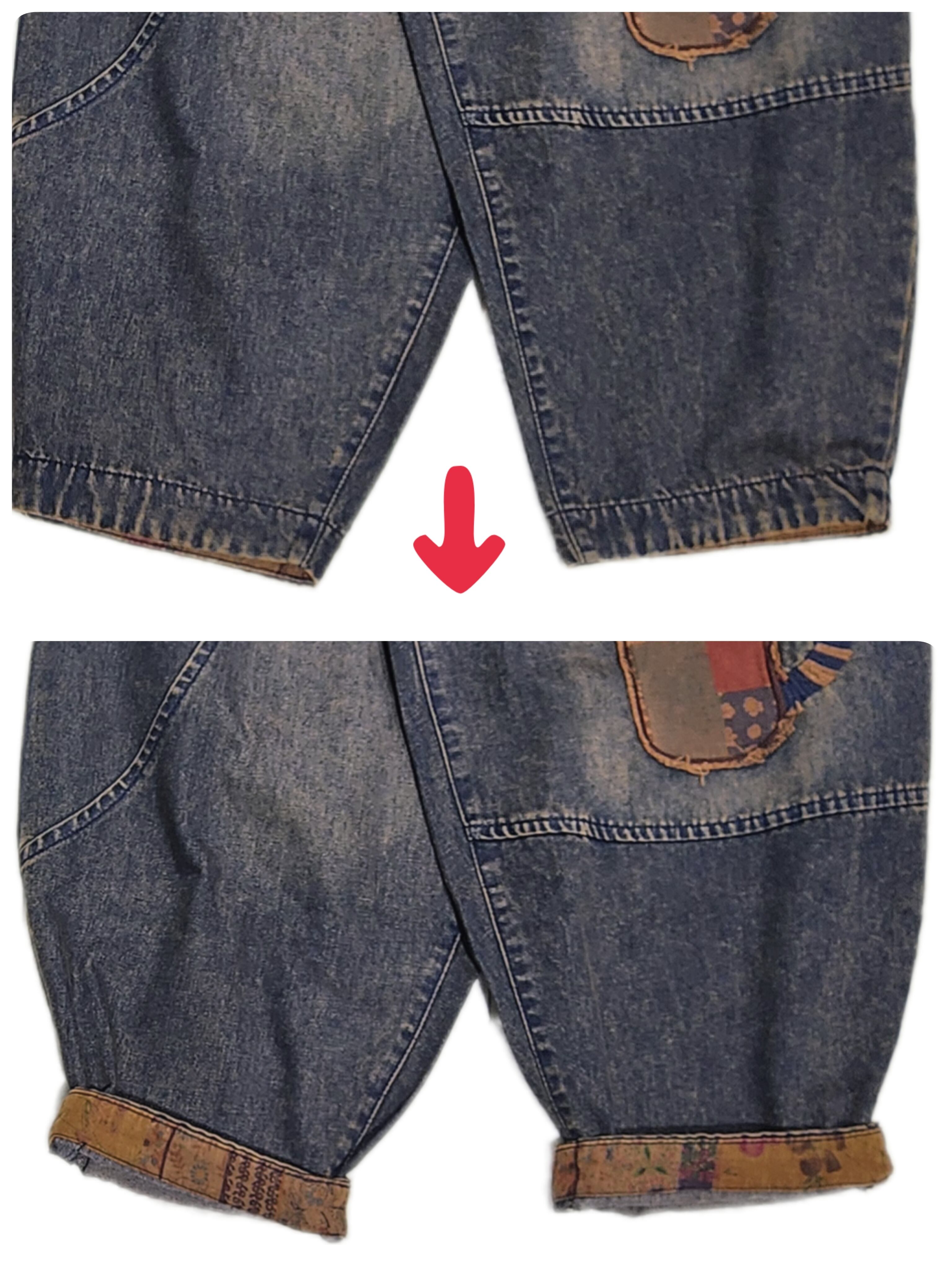 デニムの切り替えをさり気なく左右で変えているところや、裾の折り返しに柄の入った生地を貼っているところも◎