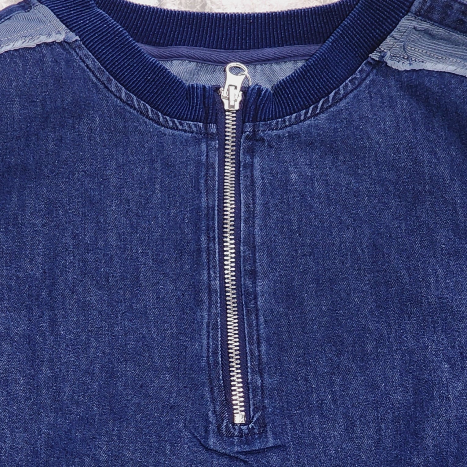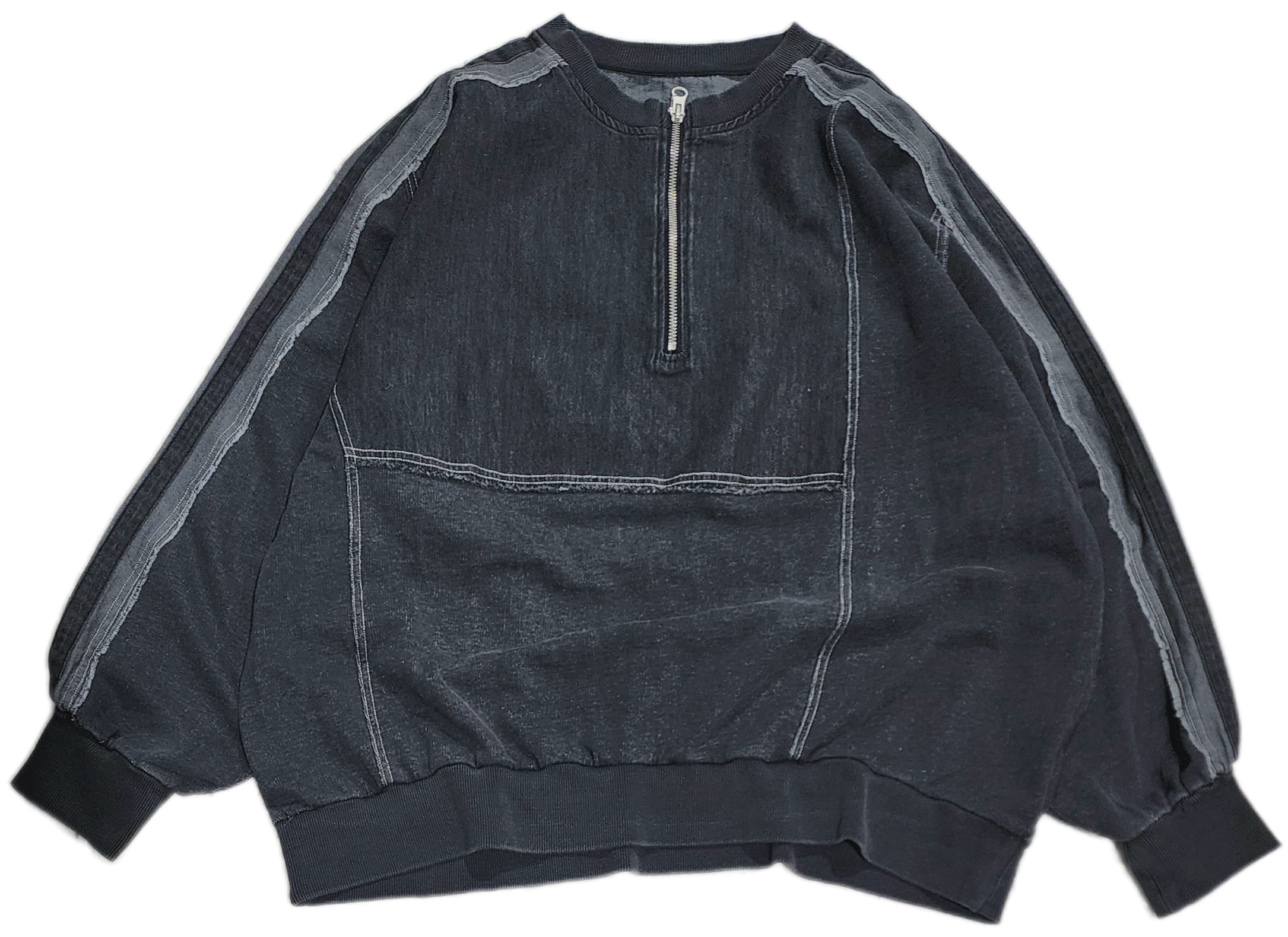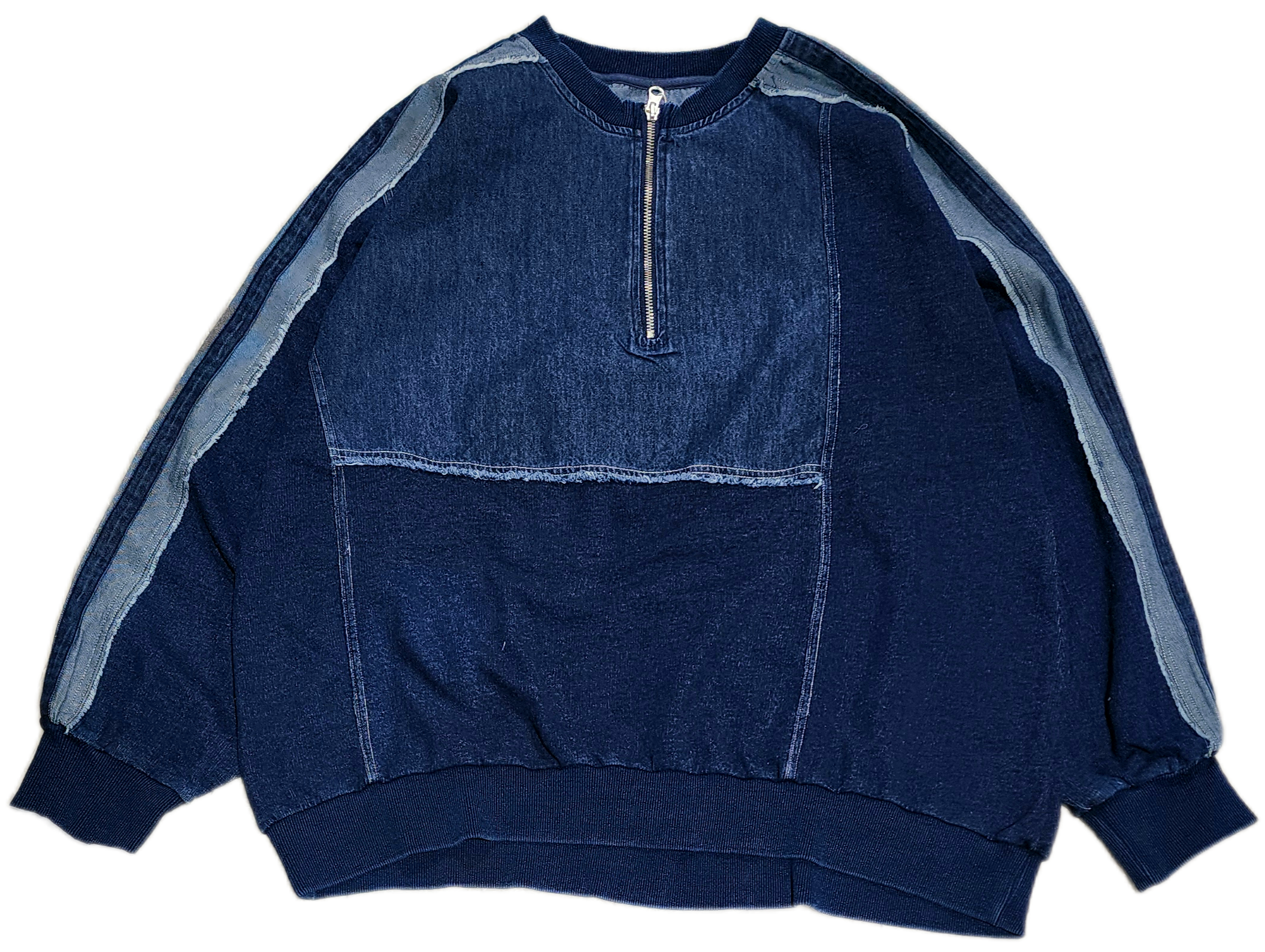 袖のデニム切替ラインがアクセントになった異素材切り替えのプルオーバー。