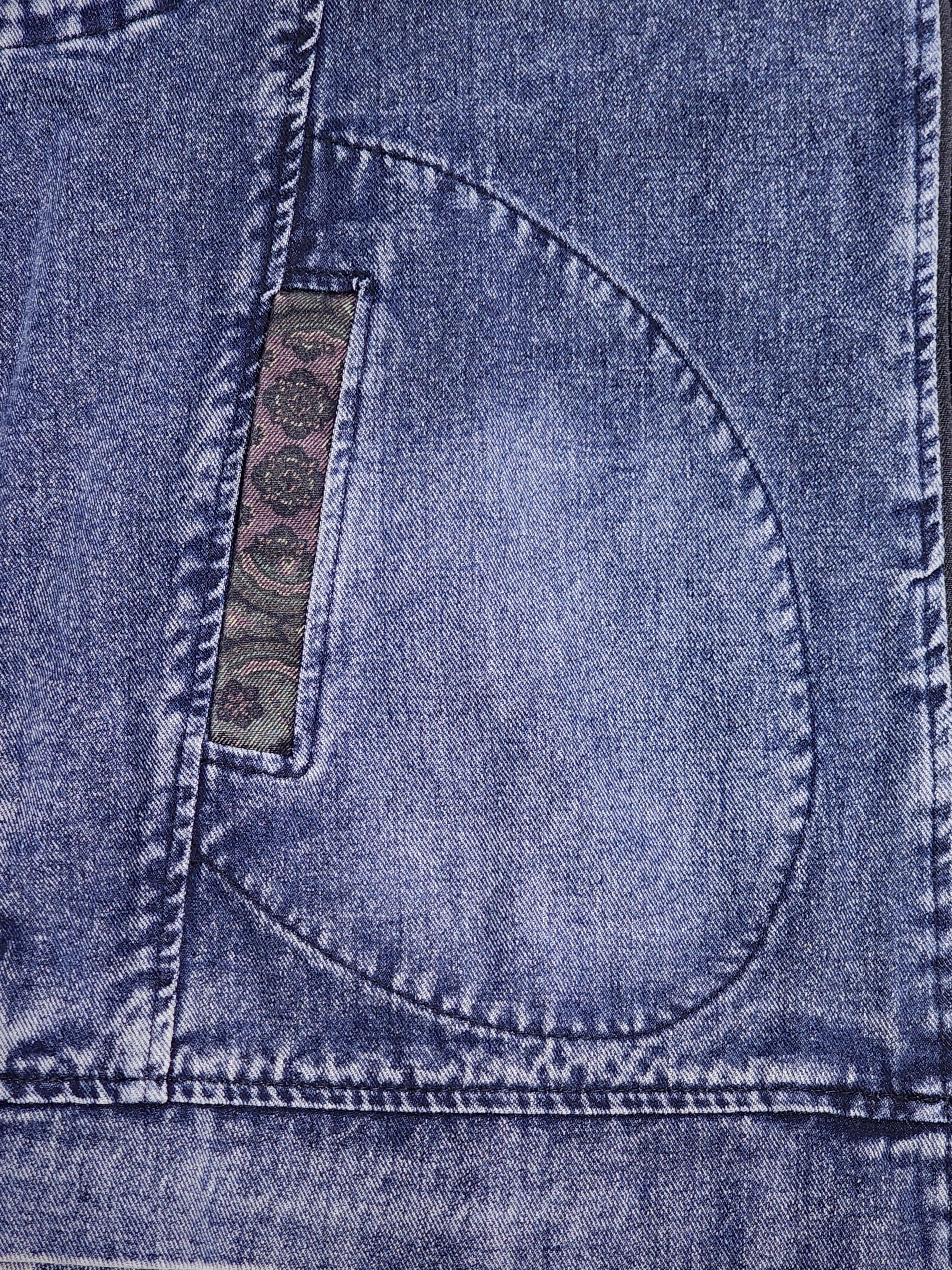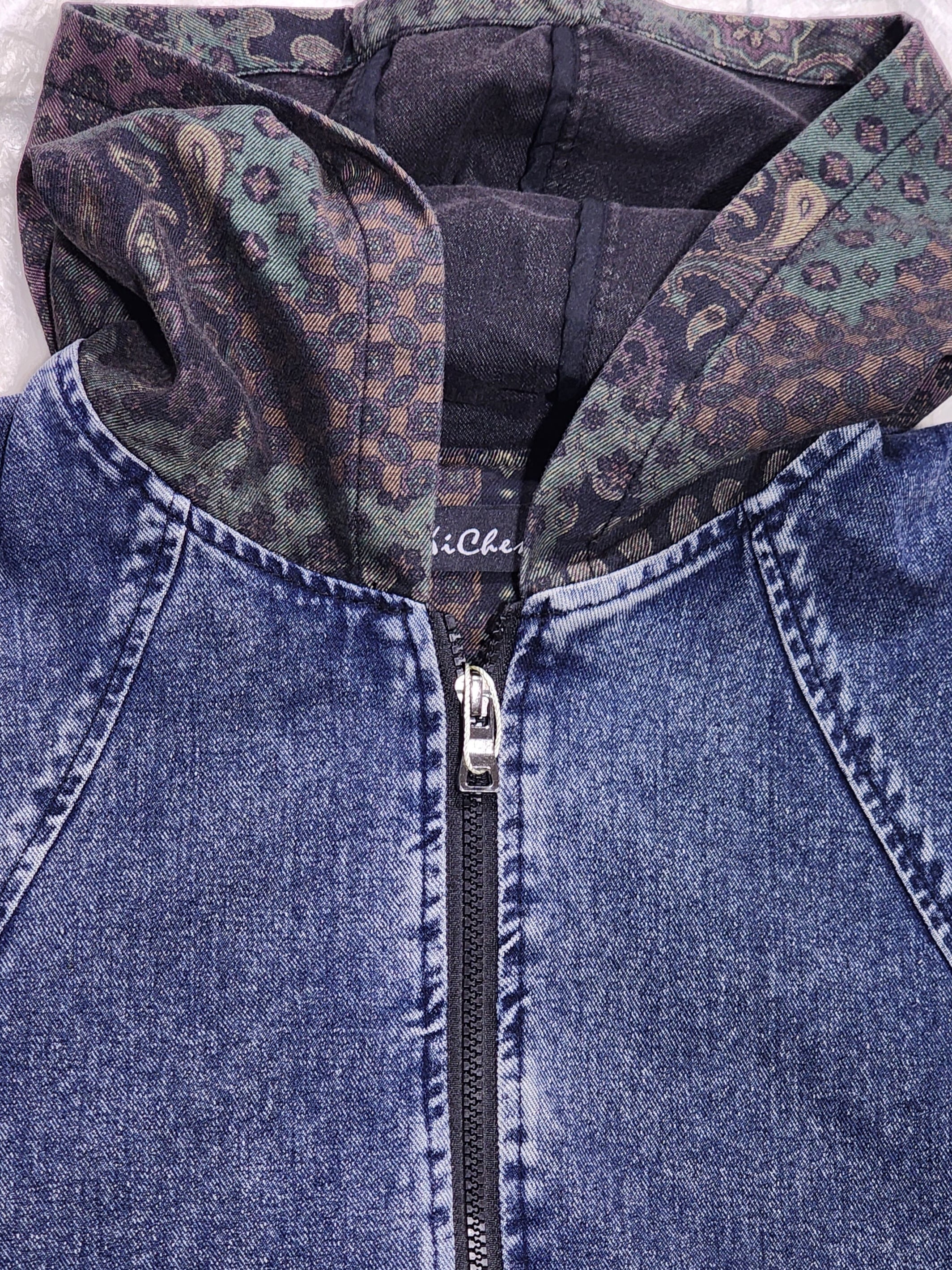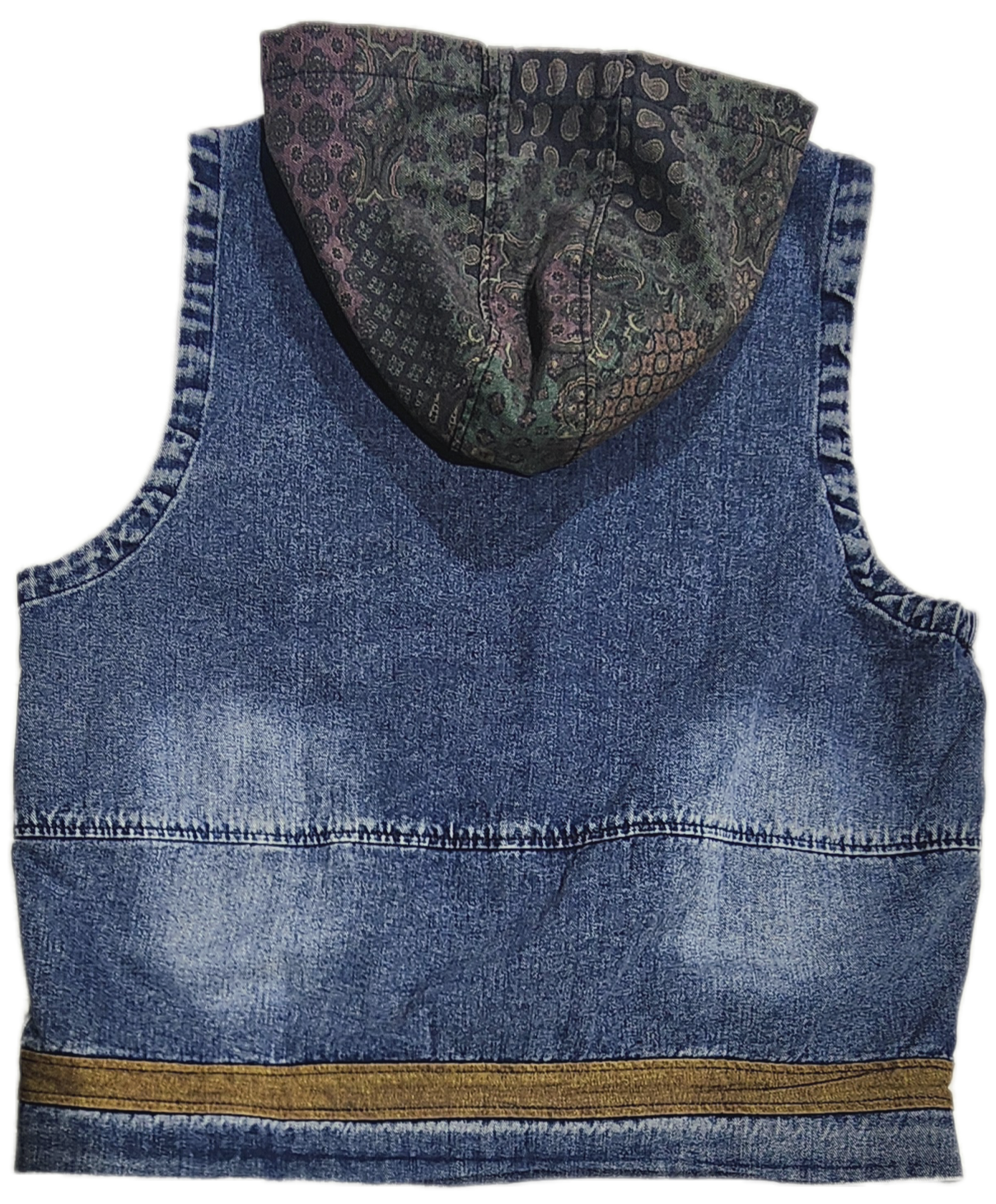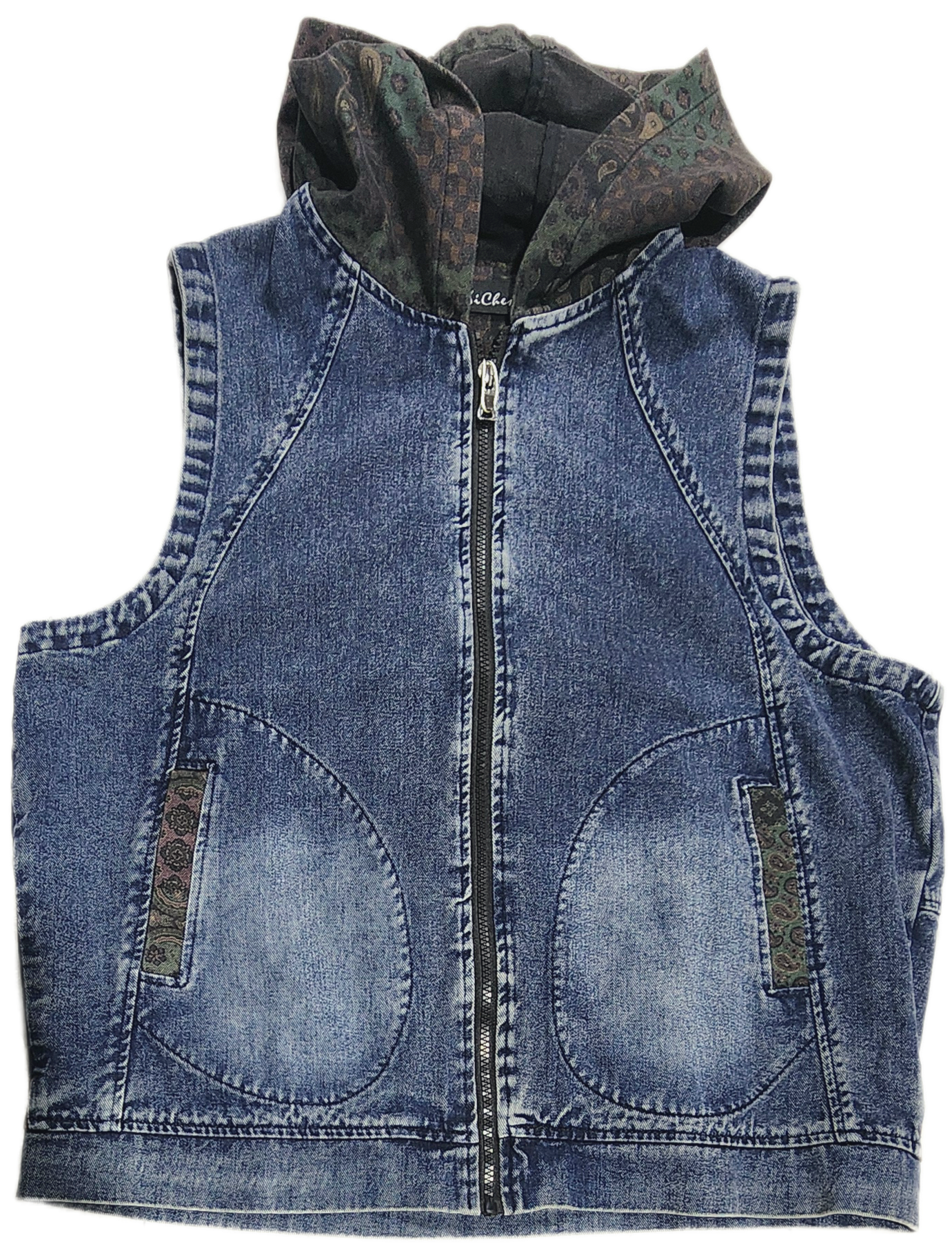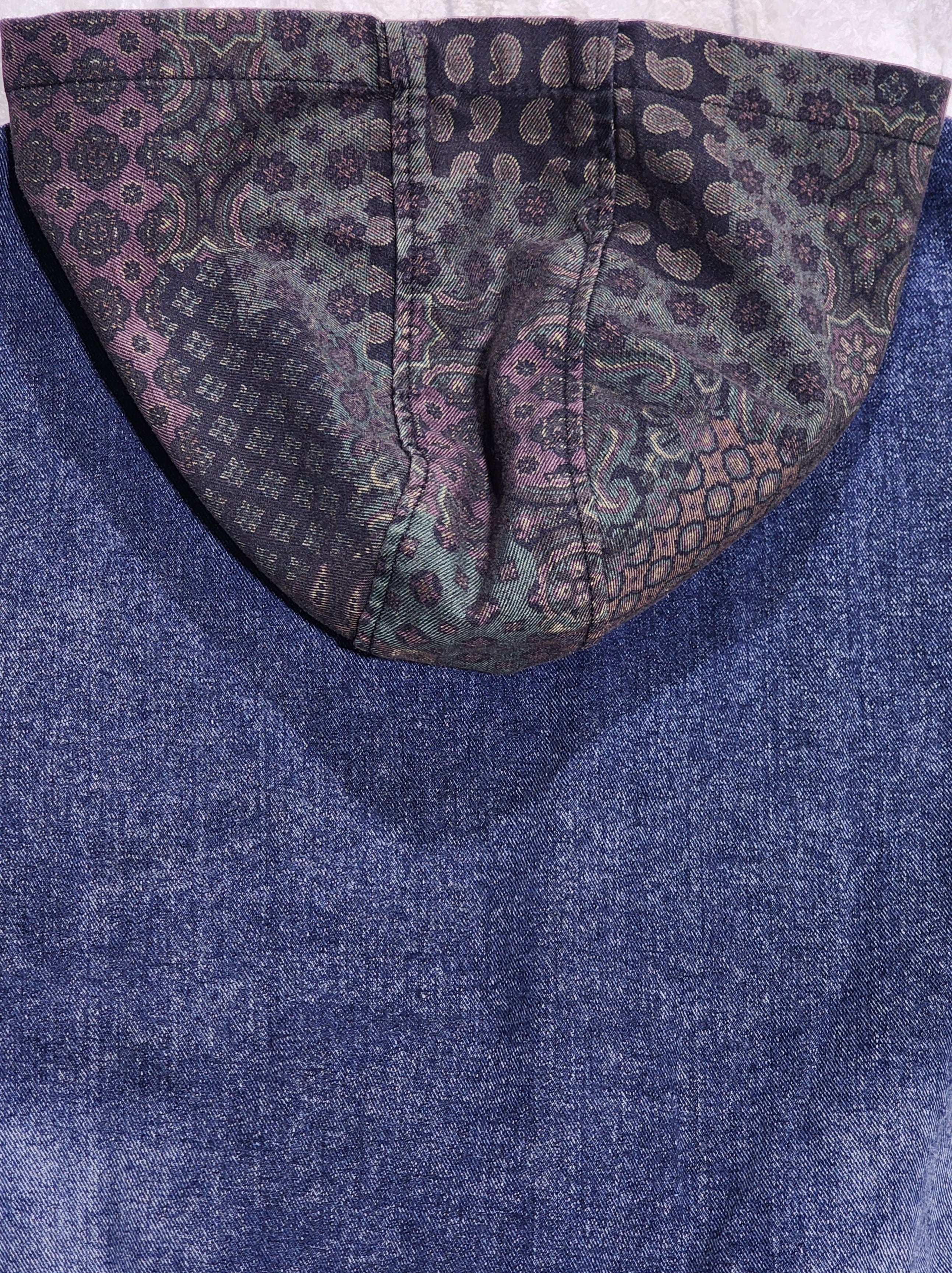 フードをペイズリーなどのパッチワーク風プリントで切り替えたデニムベスト。