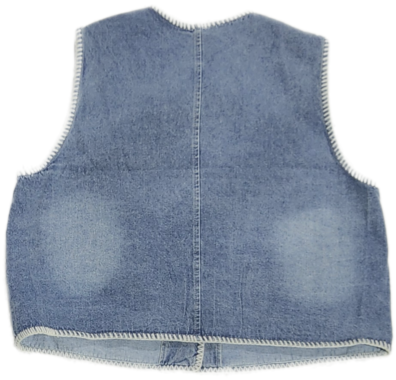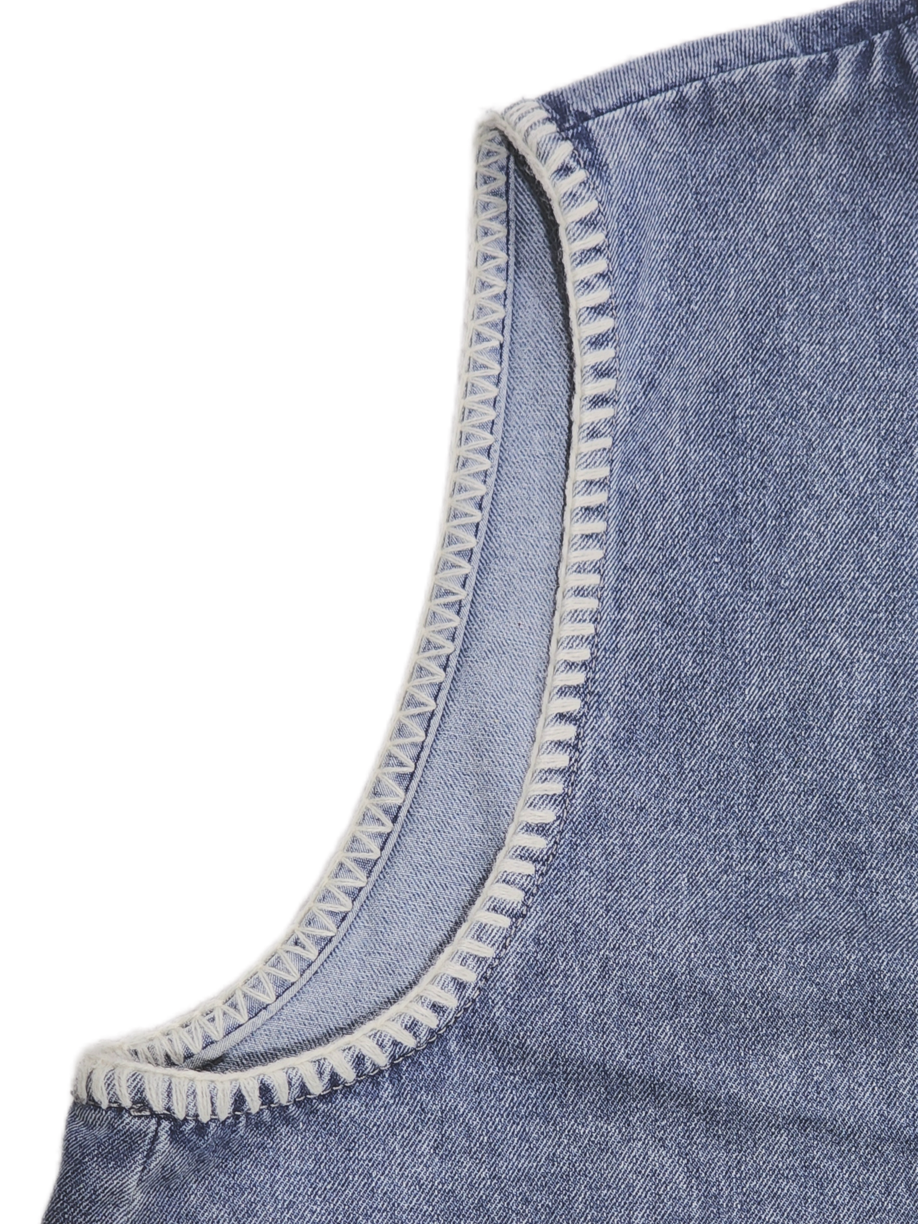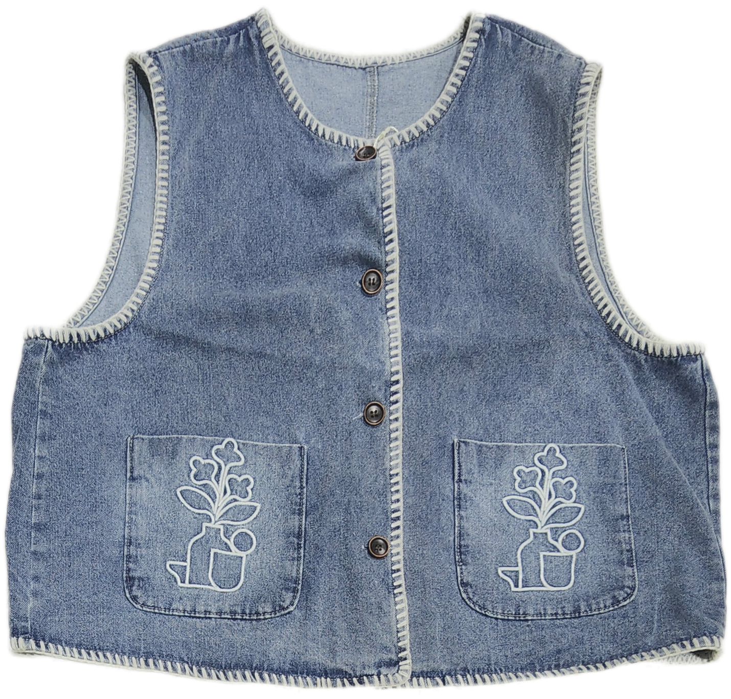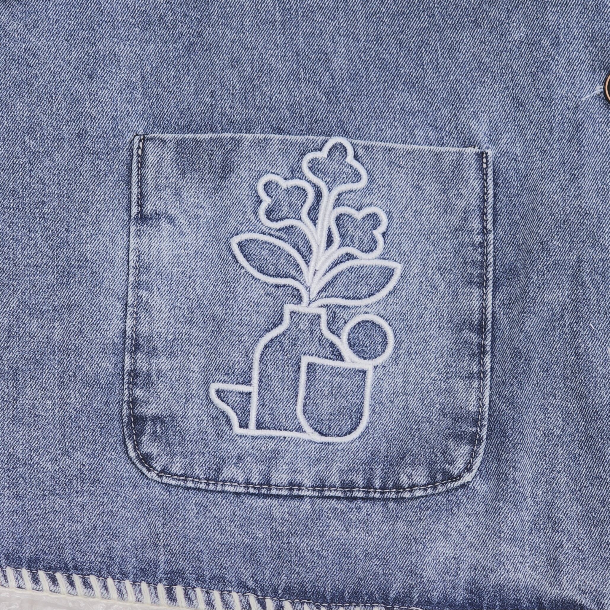 ポケットには花瓶のお花刺繍、アームホールや首まわりや裾などはブランケットステッチが施されたハンドメイド感のある一枚。