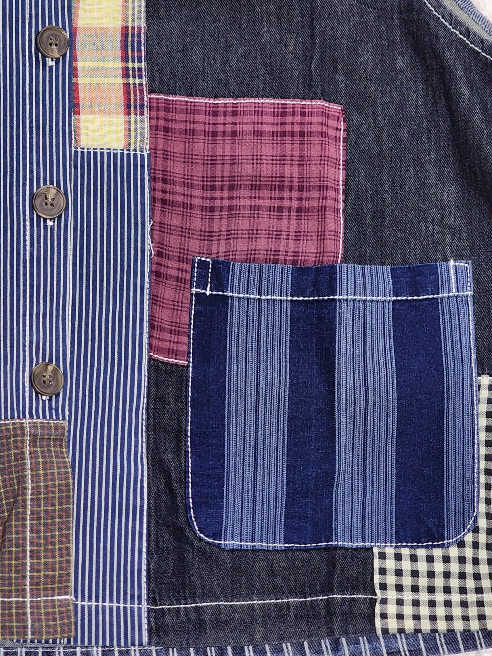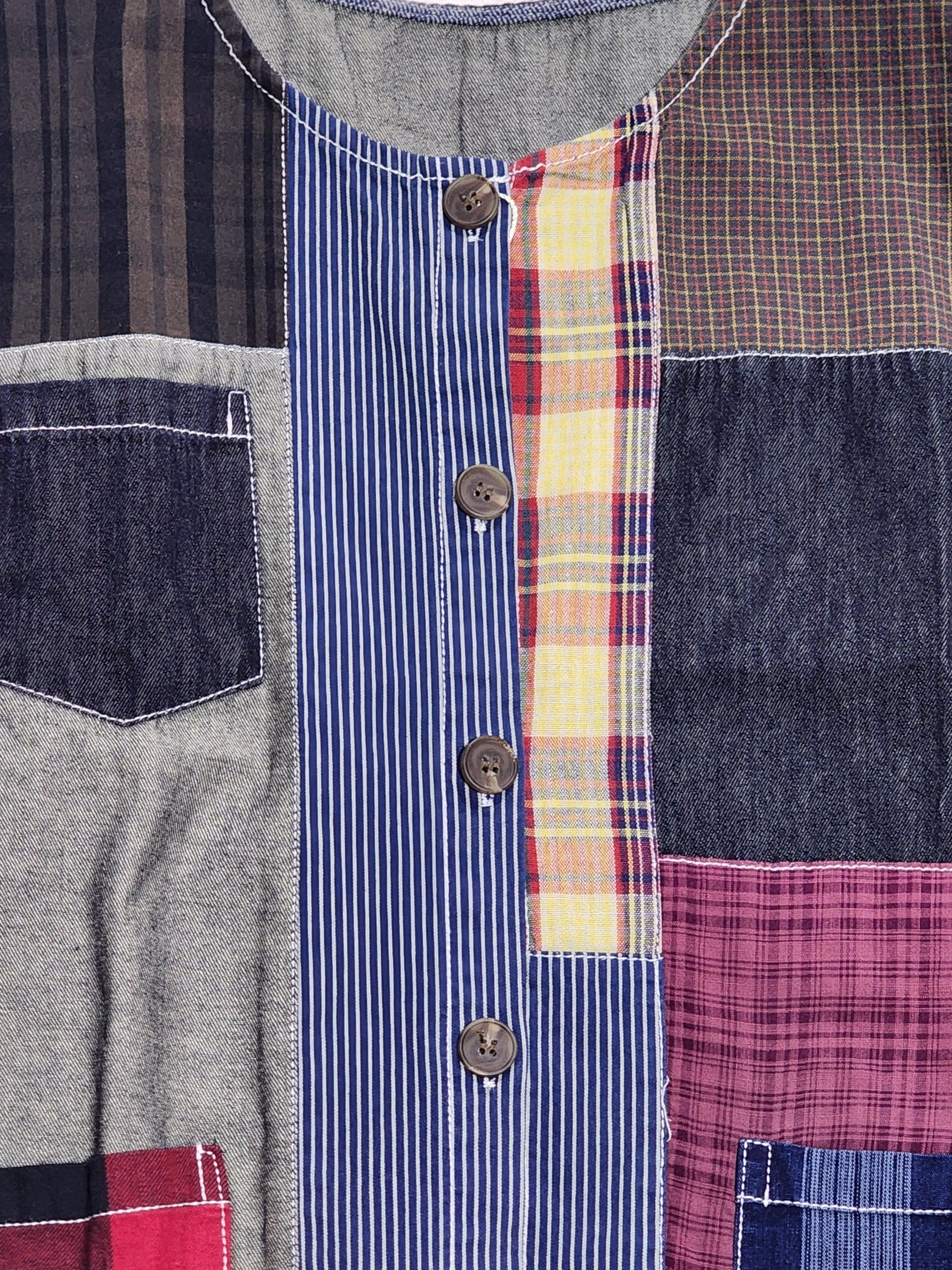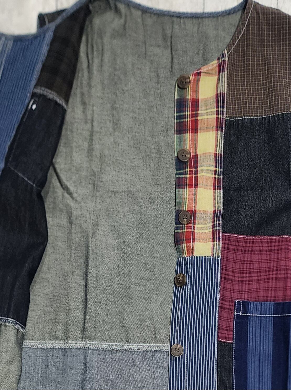デニムやチェック生地をランダムにパッチワークしたベスト。