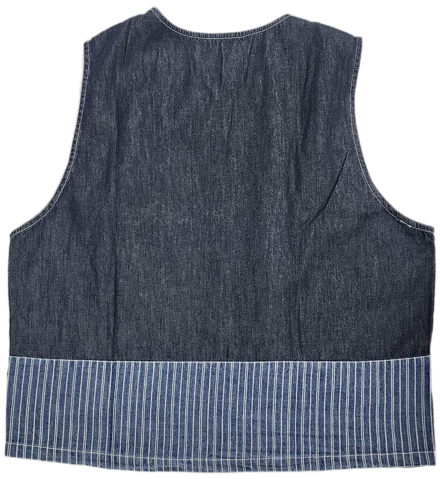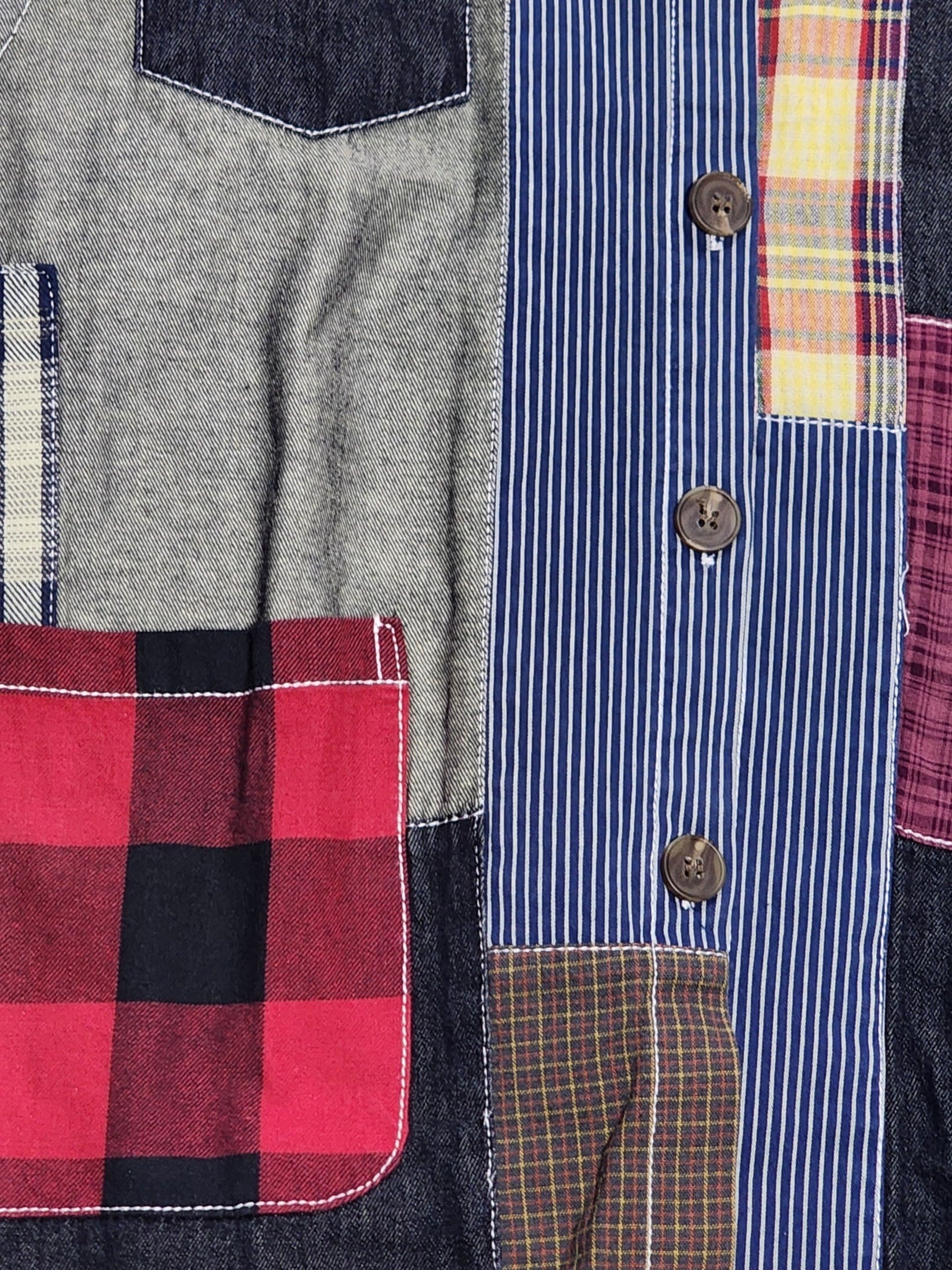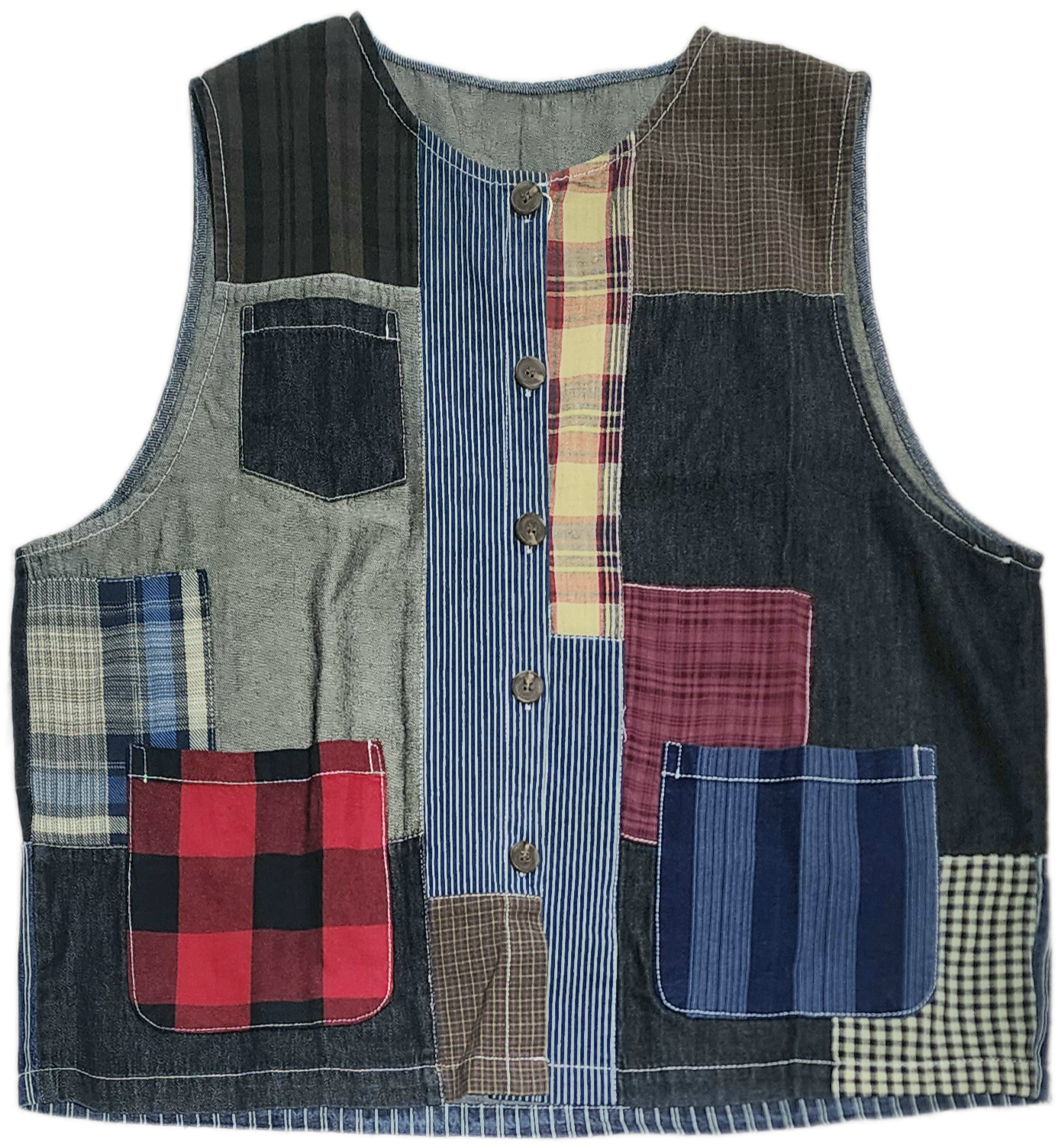 デニムやチェック生地をランダムにパッチワークしたベスト。