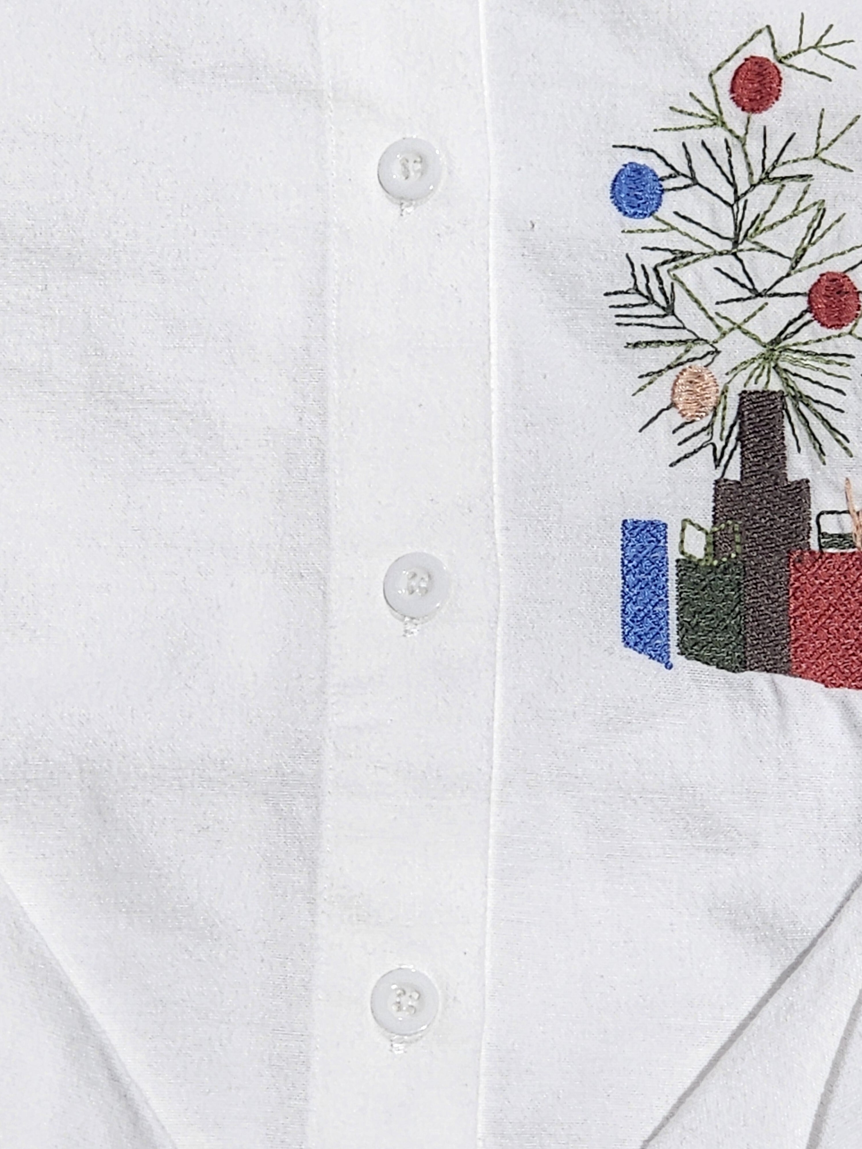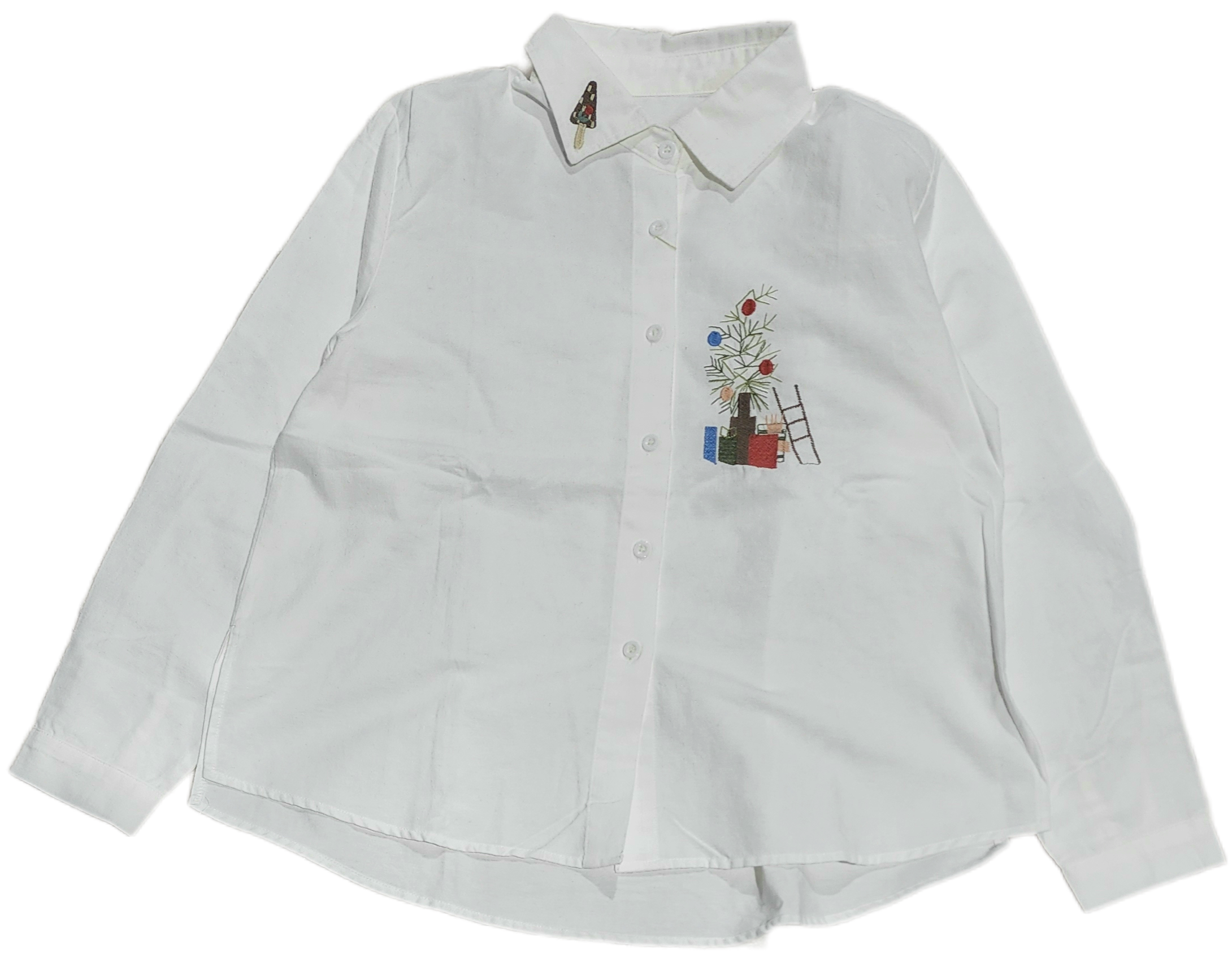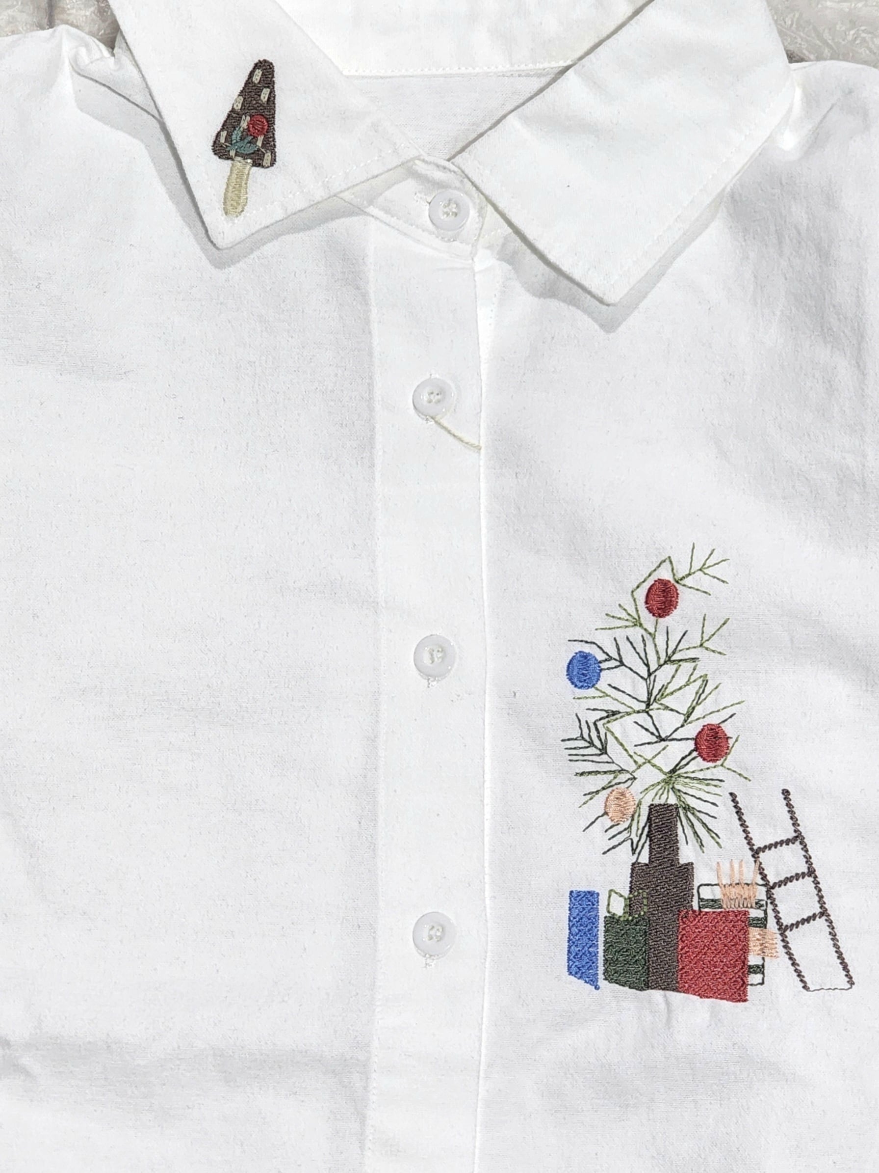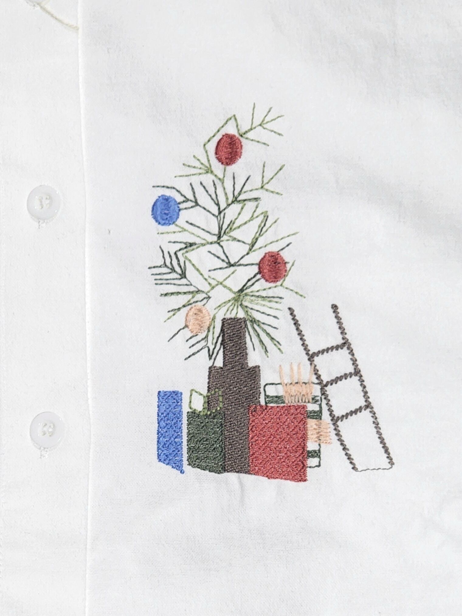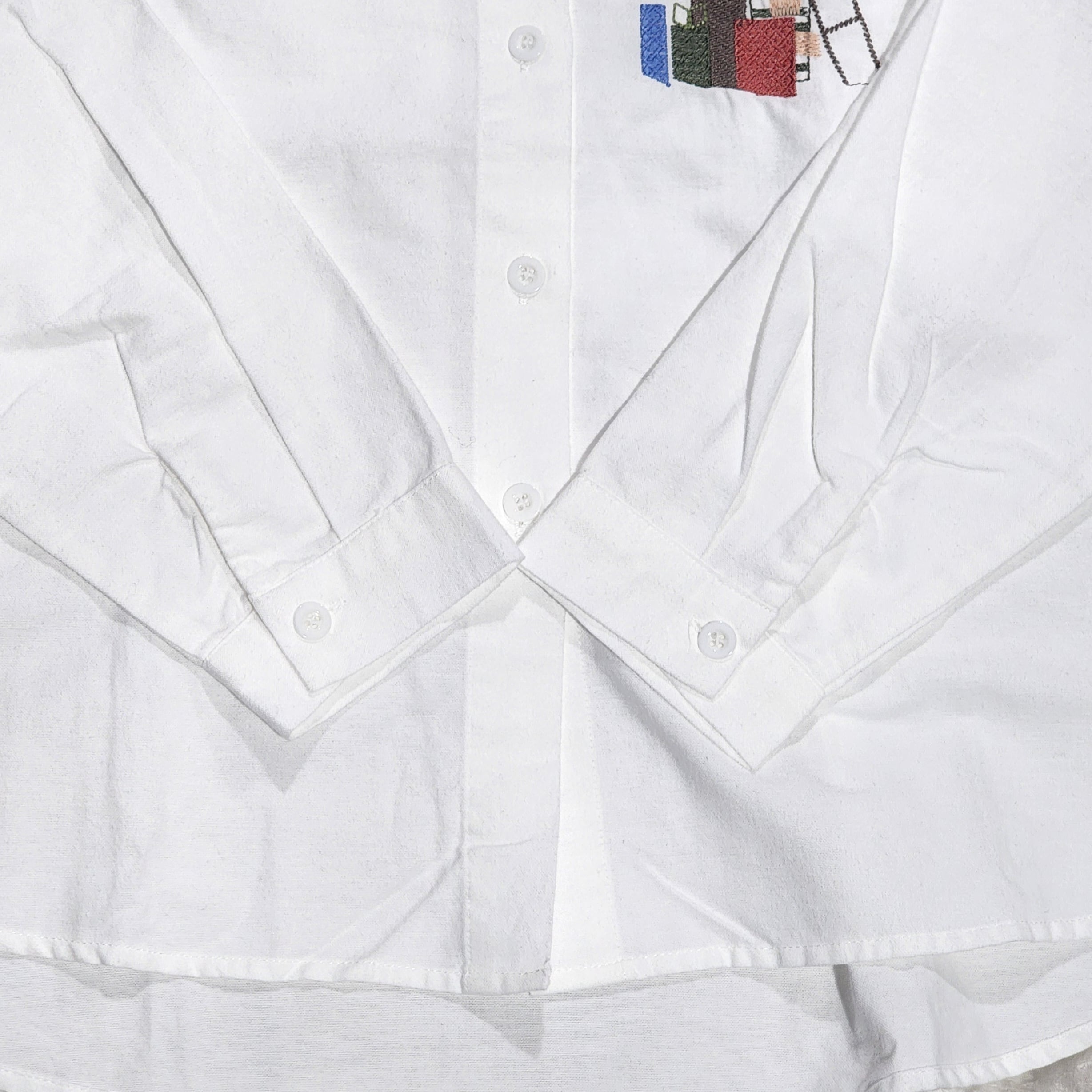 花瓶の枝やハシゴの刺繍が、さり気なく配置された素敵なコットンシャツ。
