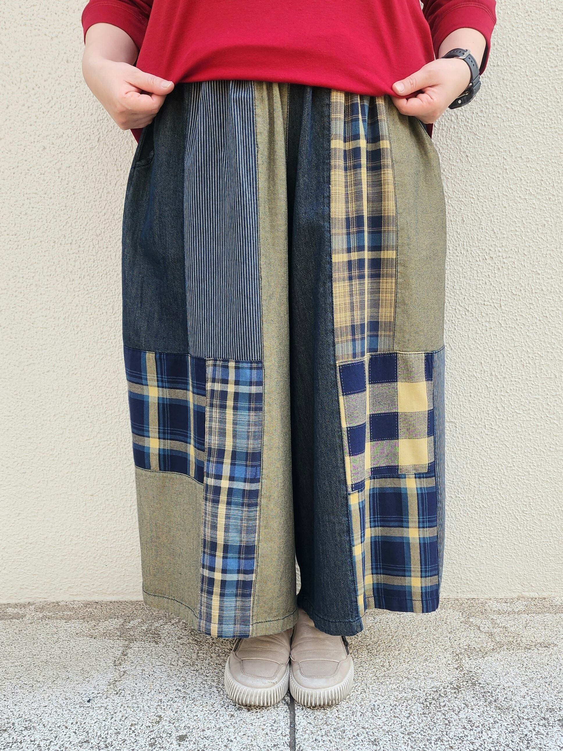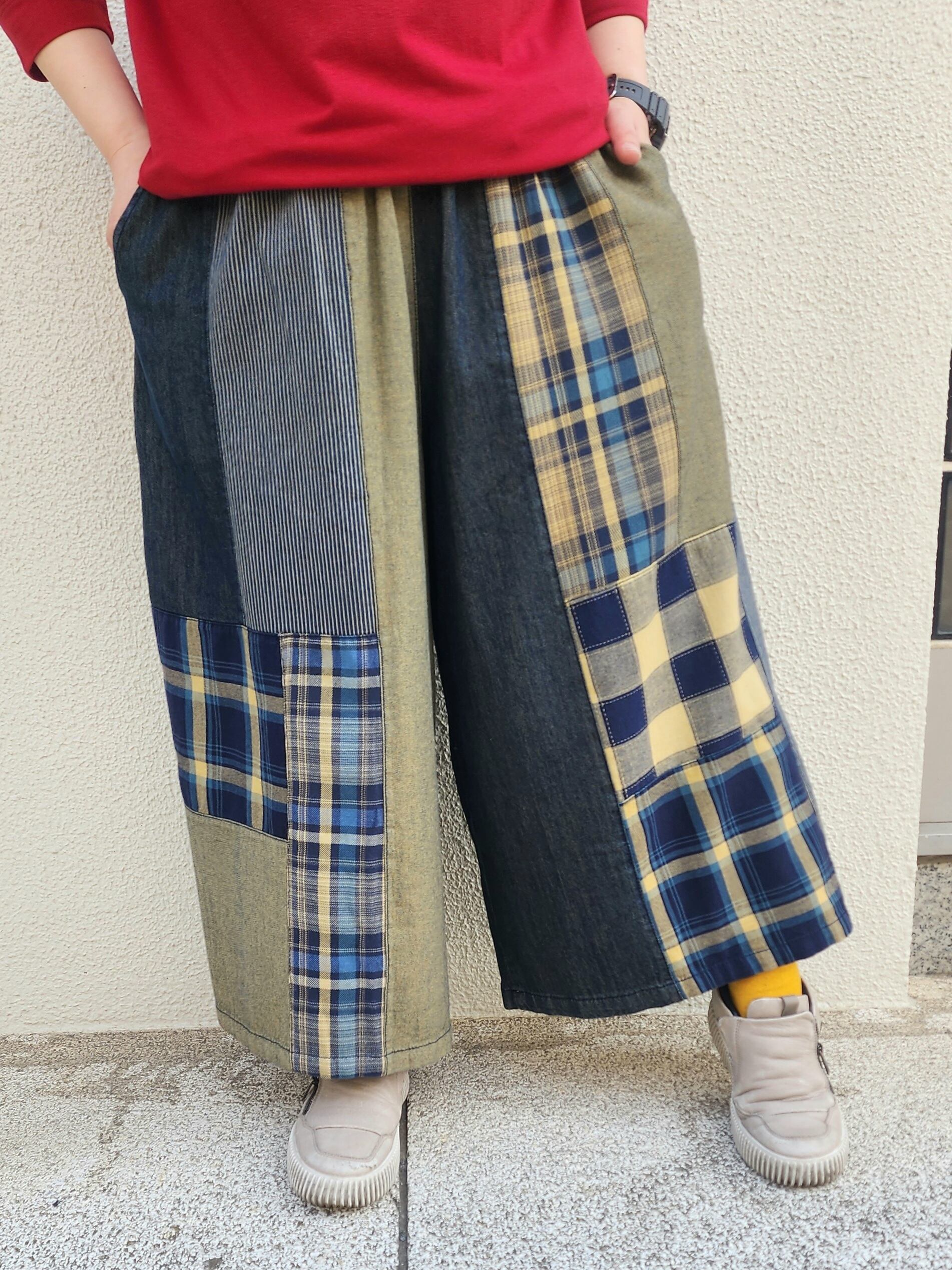 チェックやストライプでパッチワークしたデニムワイドパンツ。