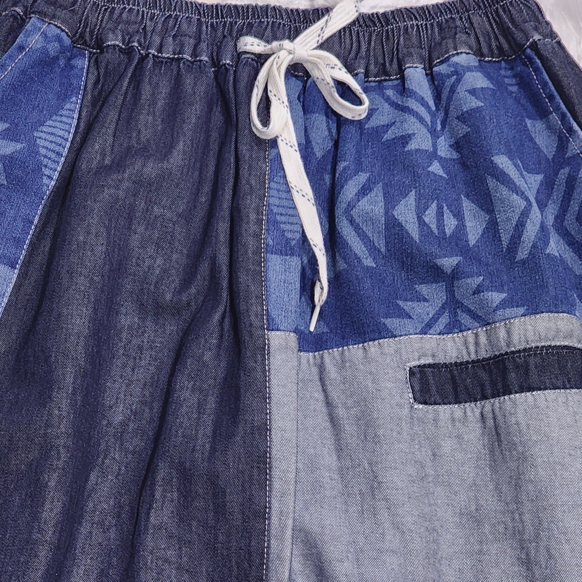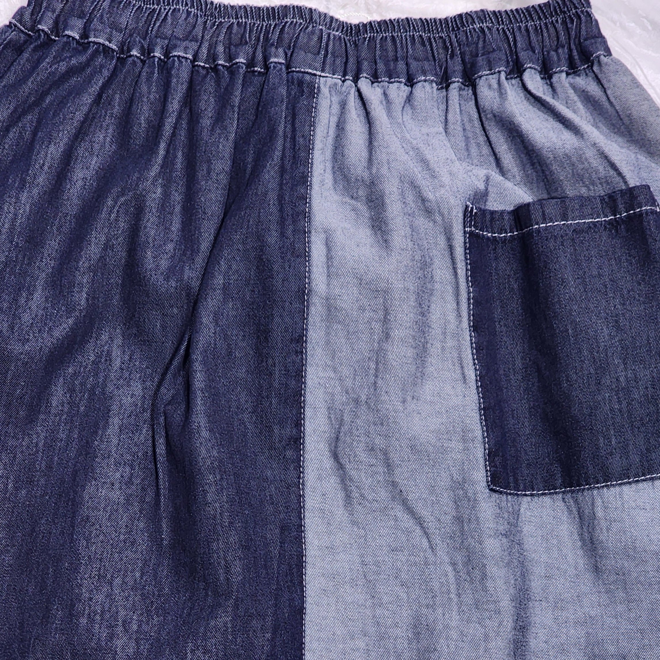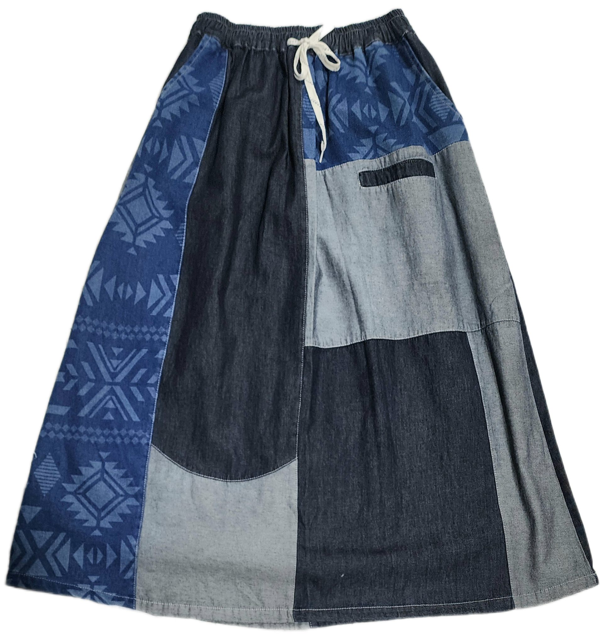デニムのバイカラー切り替え×オルテガ柄デニムのスカート。