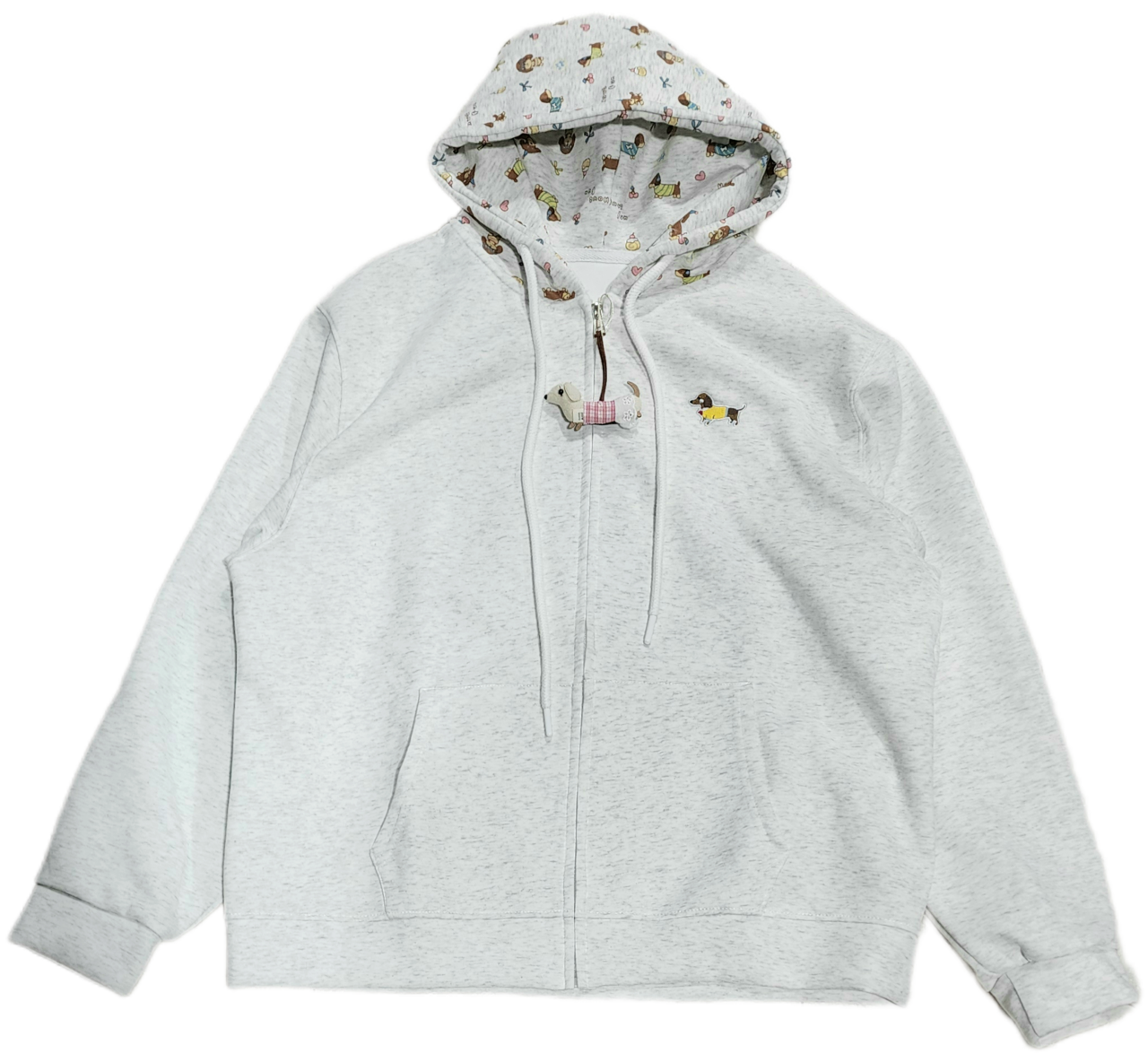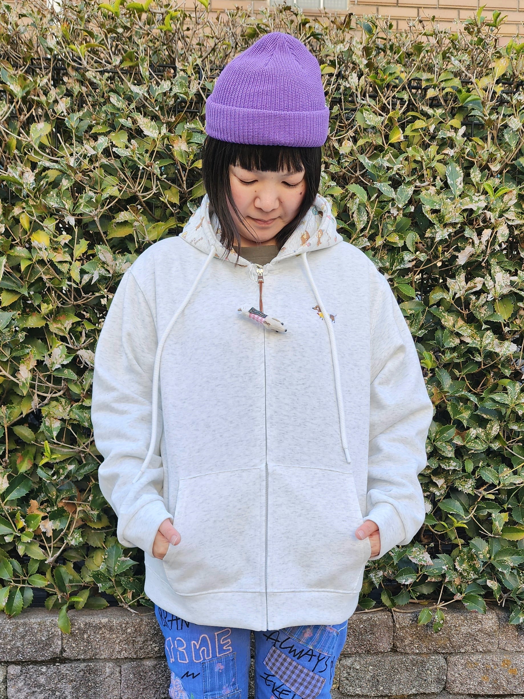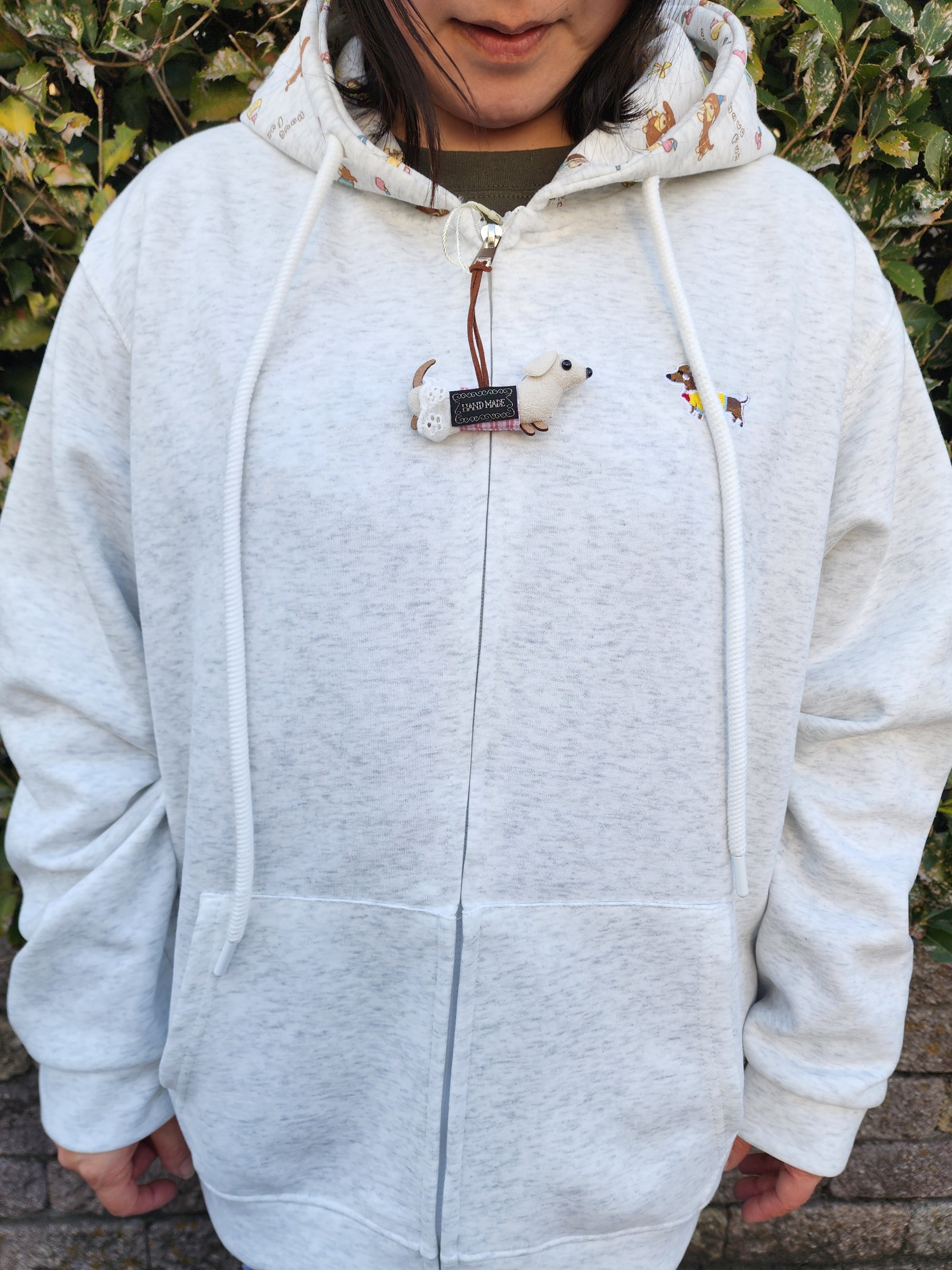 フード部分もダックスプリントで胸にダックス刺繍のワンポイント入りと、ダックス愛溢れるジップパーカーです。