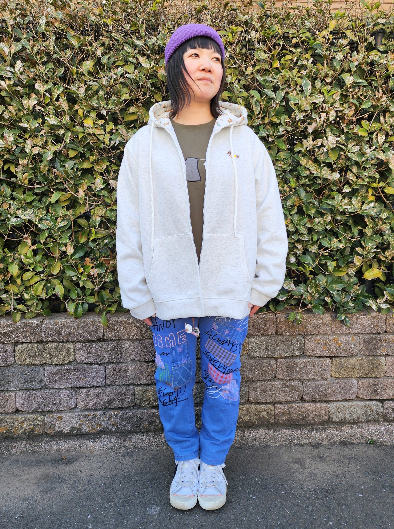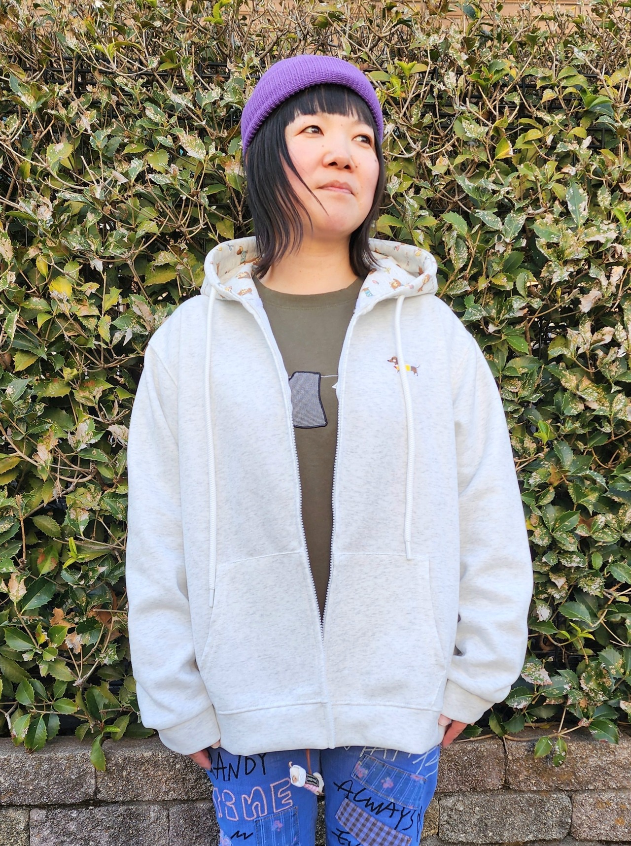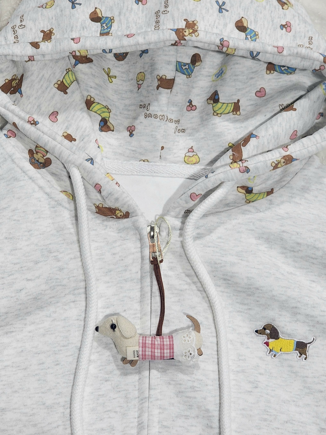 フード部分もダックスプリントで胸にダックス刺繍のワンポイント入りと、ダックス愛溢れるジップパーカーです。