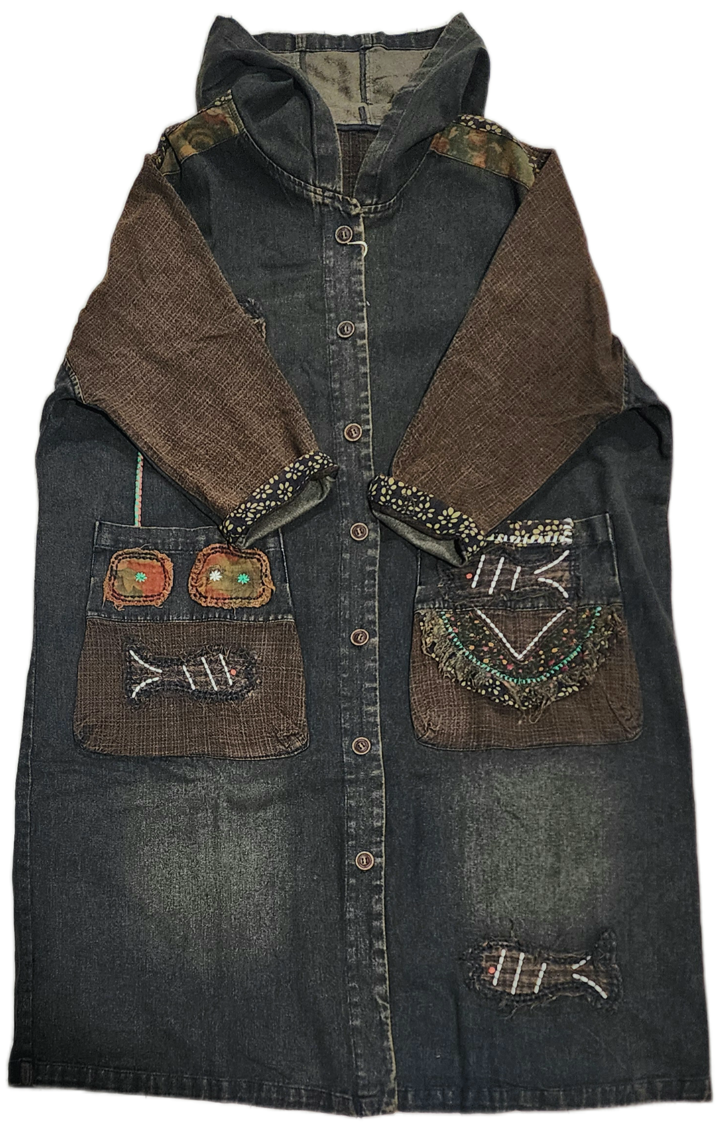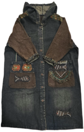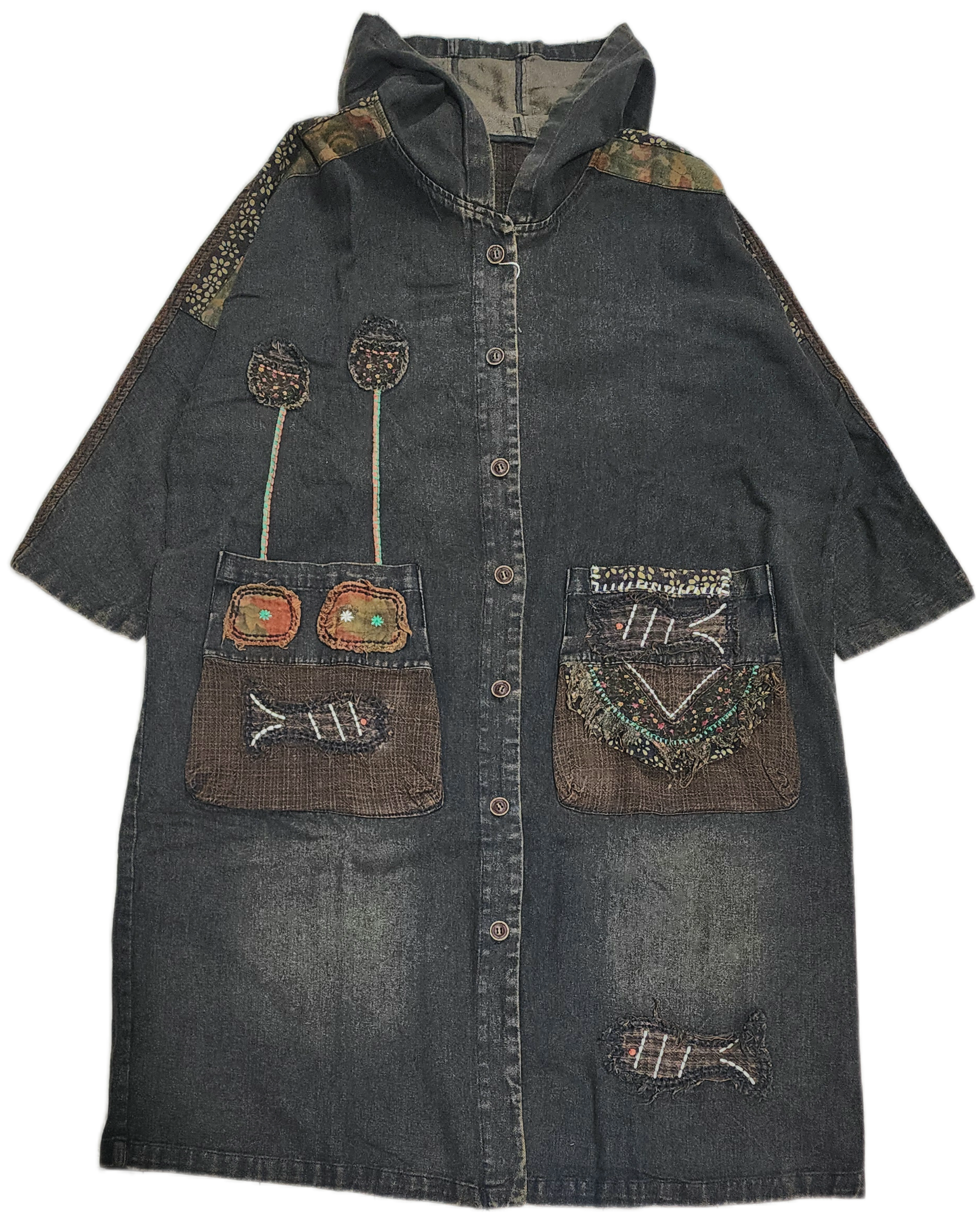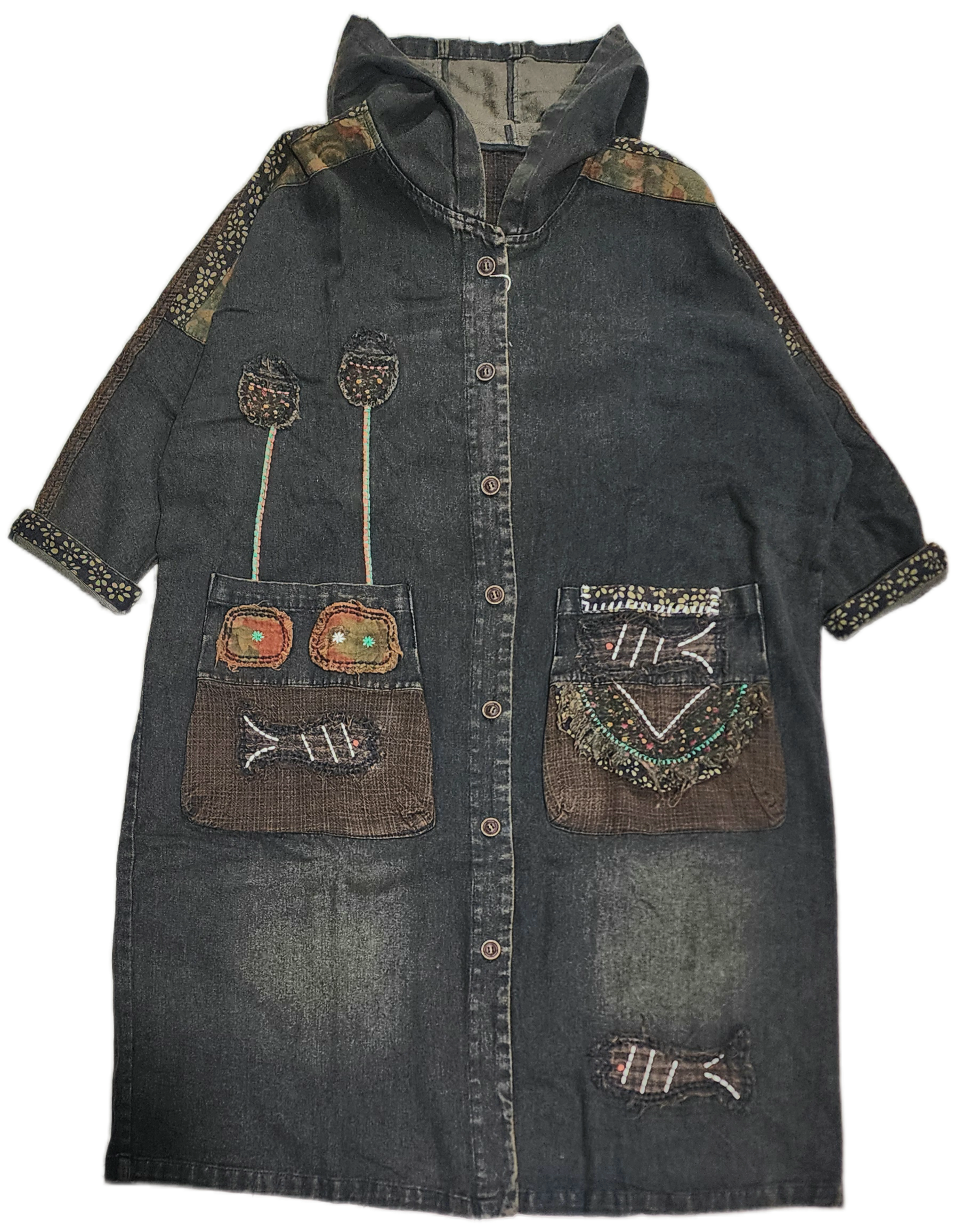 お魚&植物パッチワークのデニムロングアウター