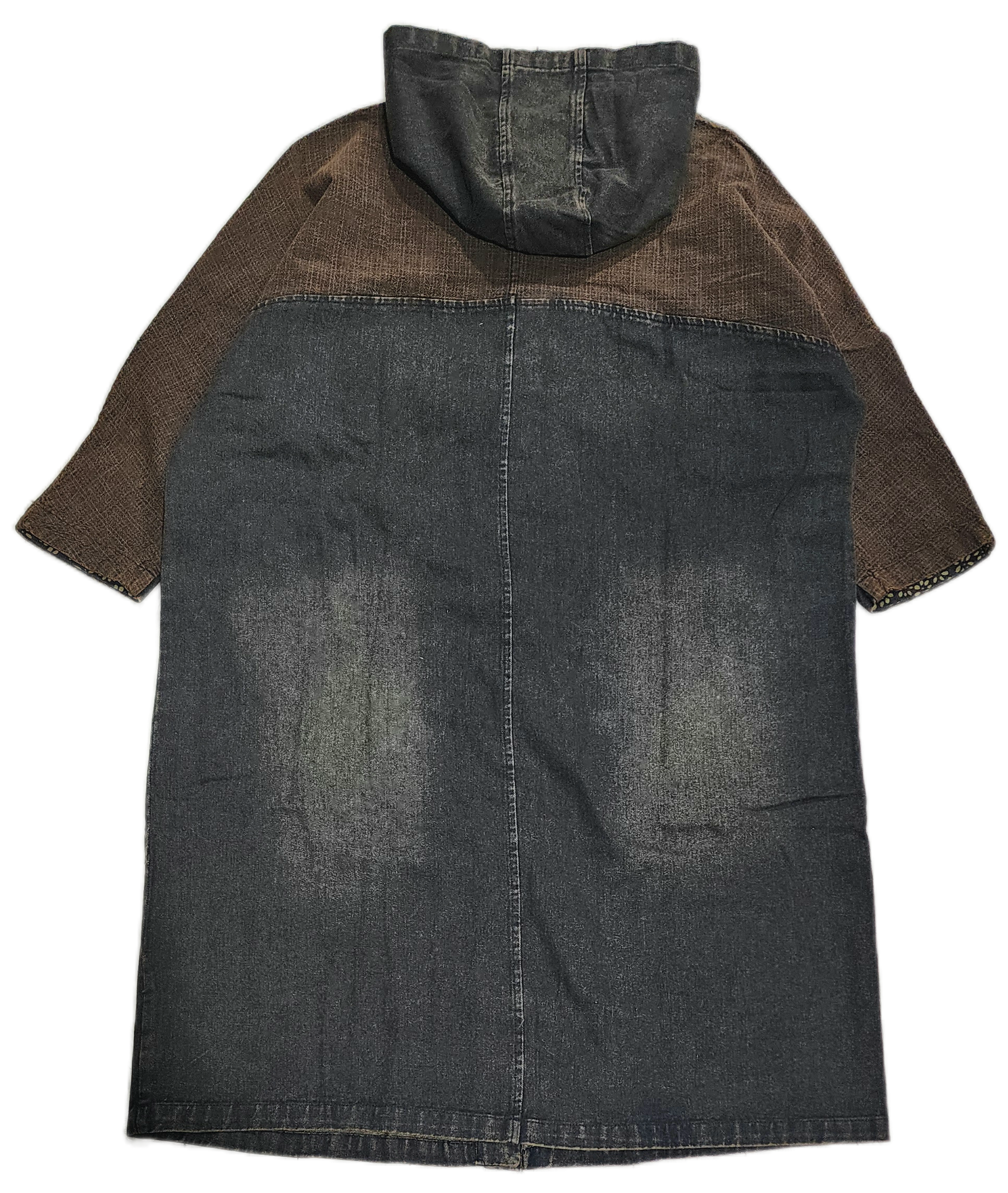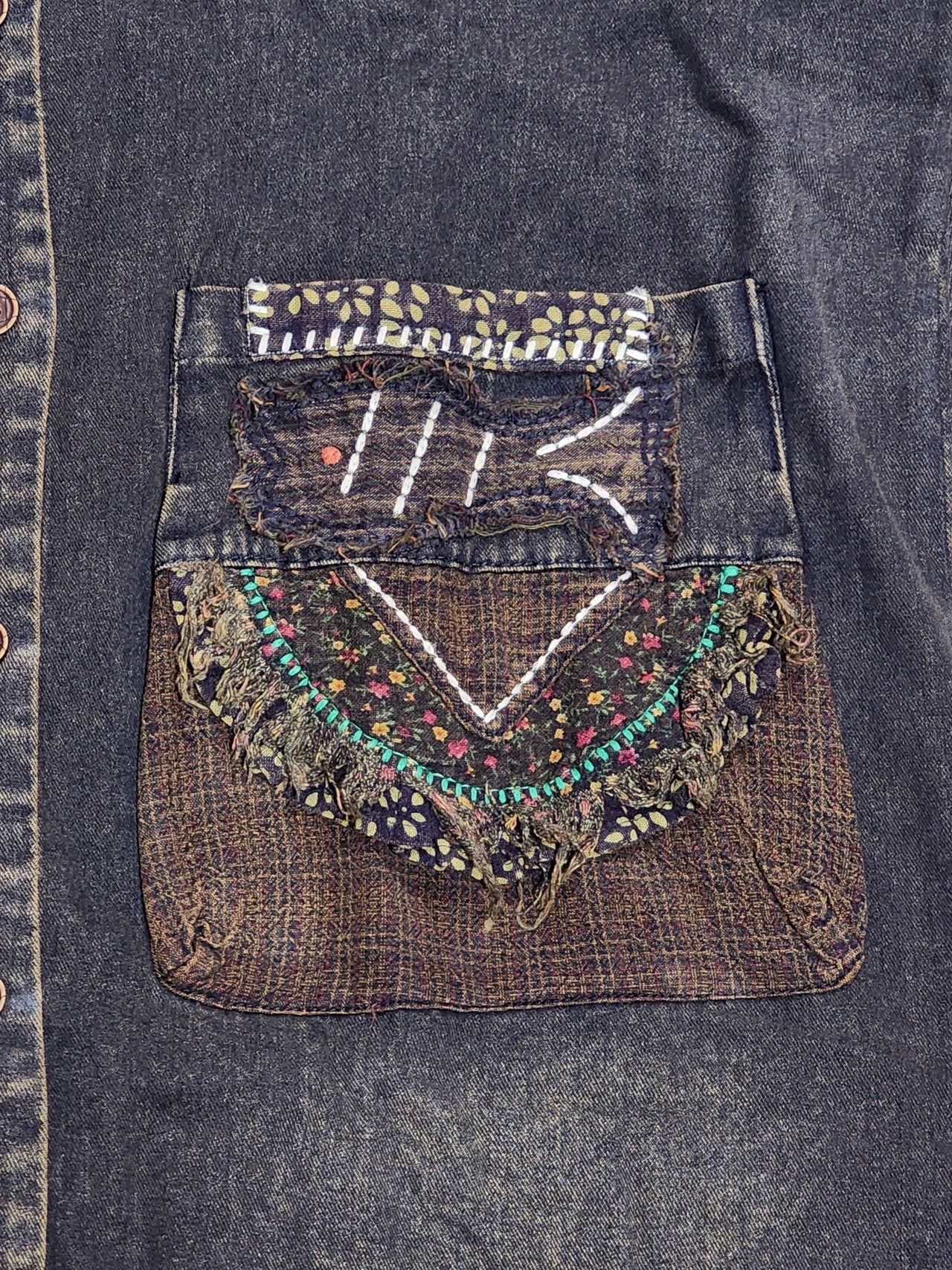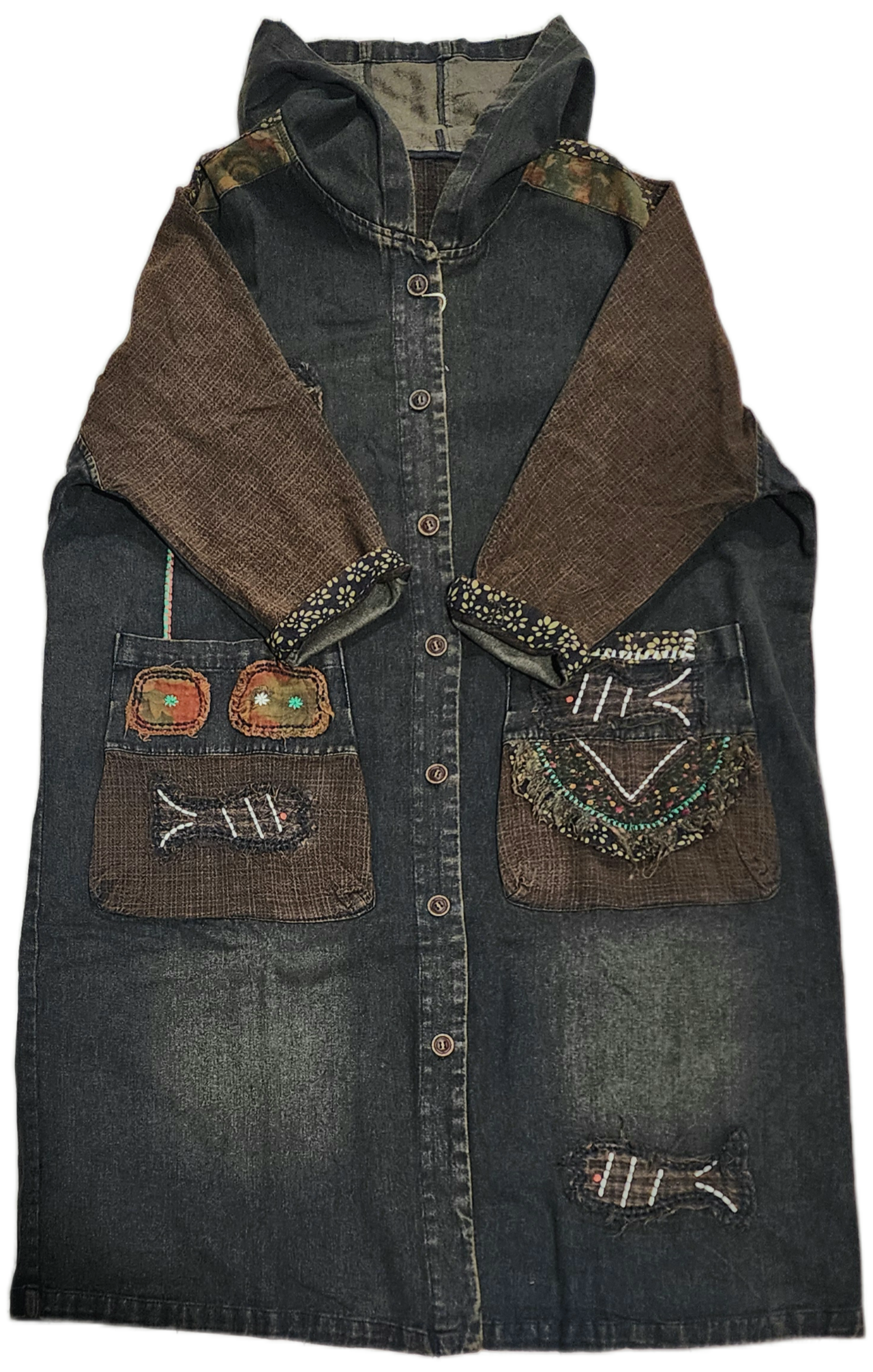 お魚&植物パッチワークのデニムロングアウター
