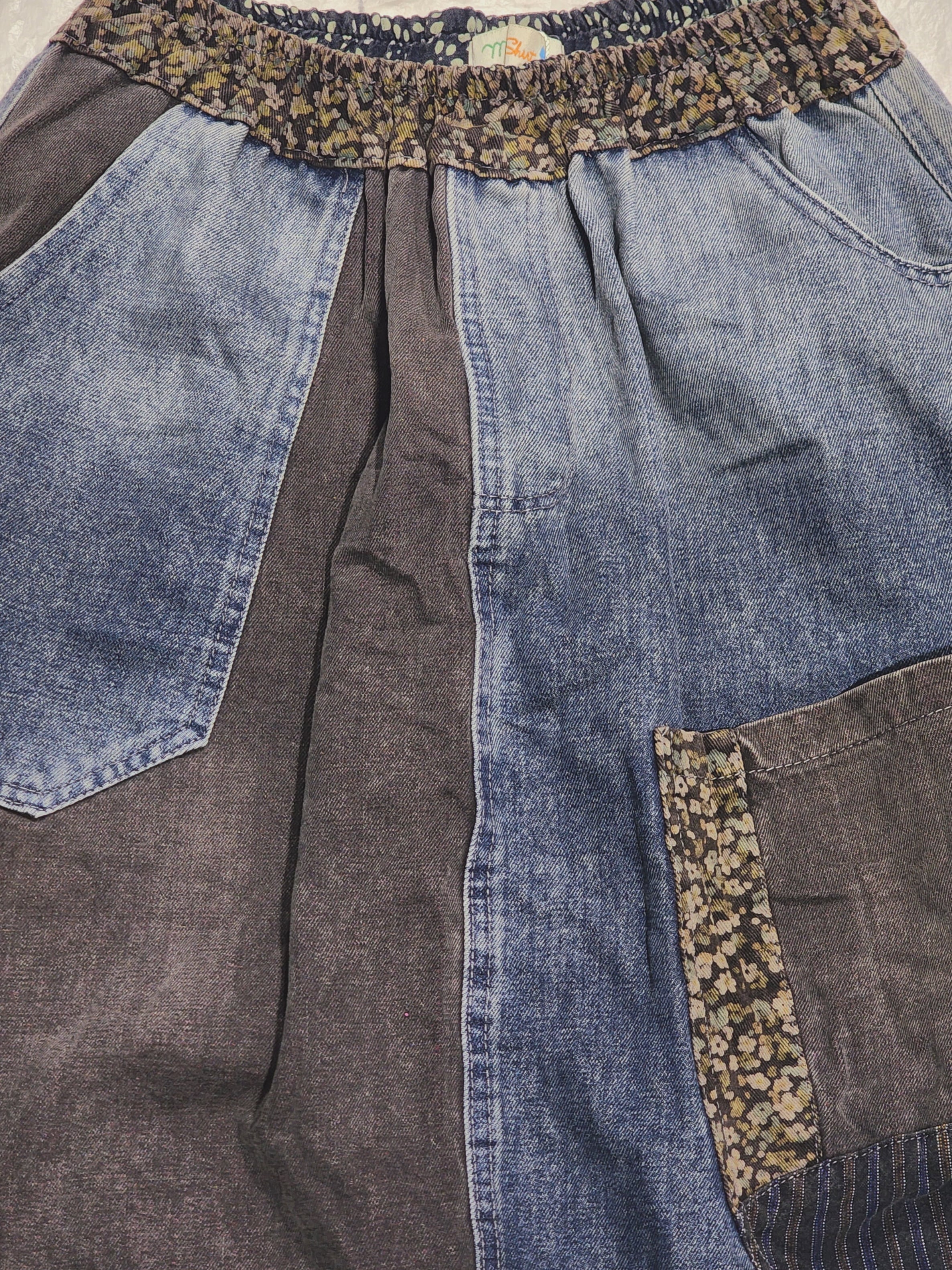 バイカラー切り替えのデニムサルエルパンツ